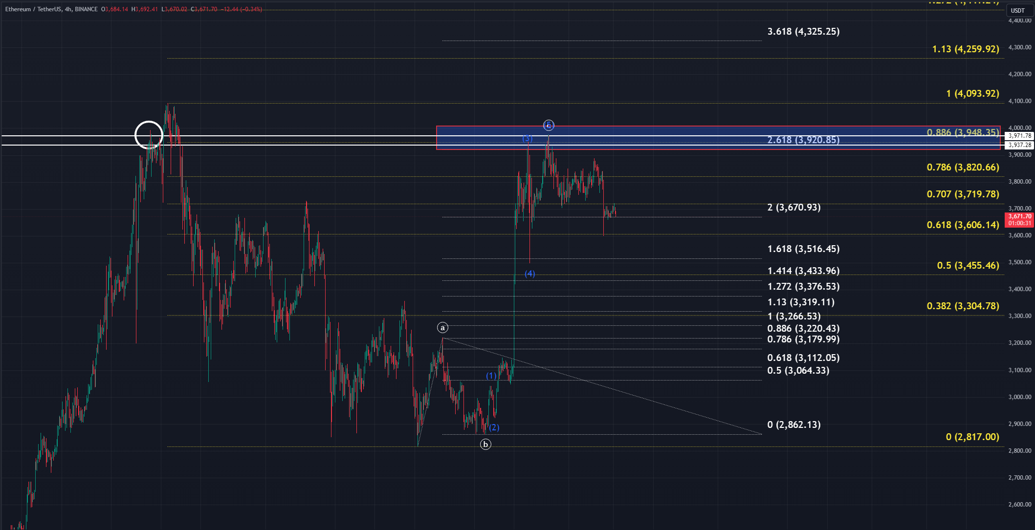 c파동이 도달한 범위는 이전 상승에서 나온 고점의 넥라인 저항