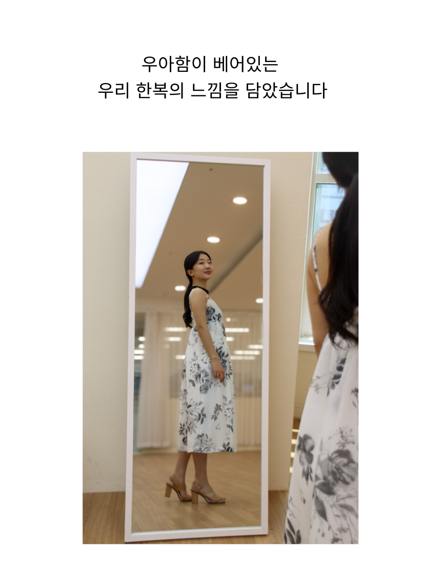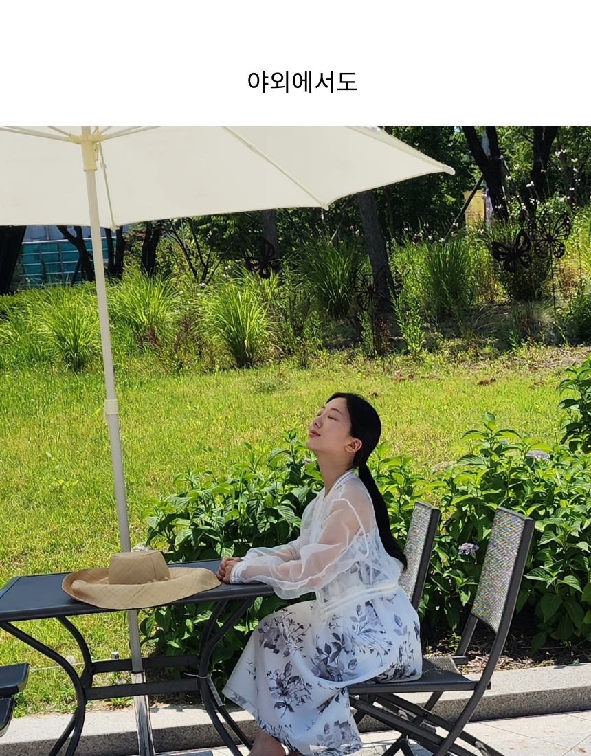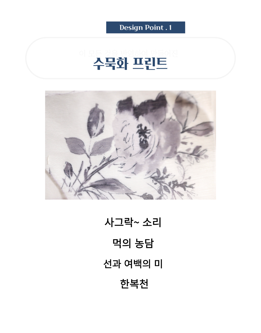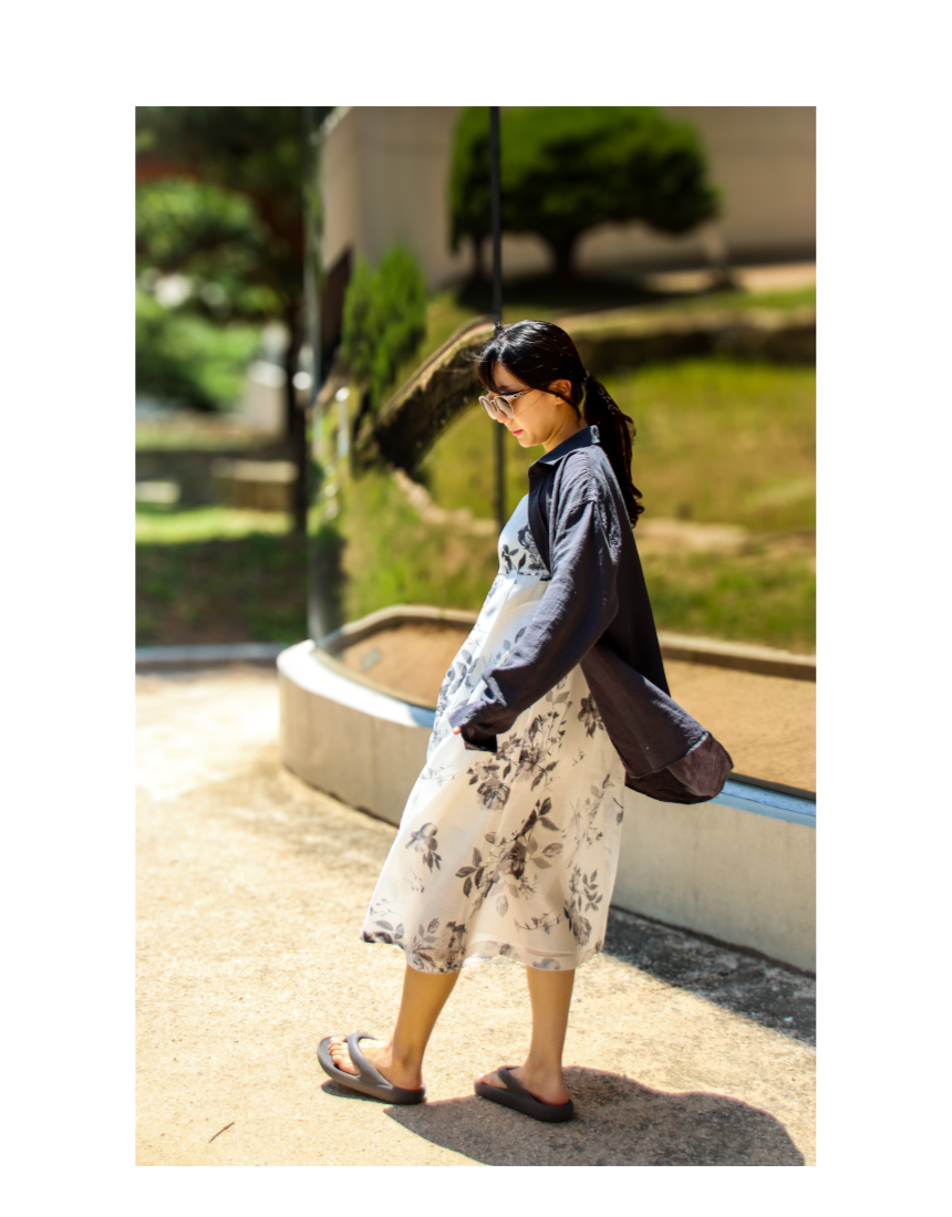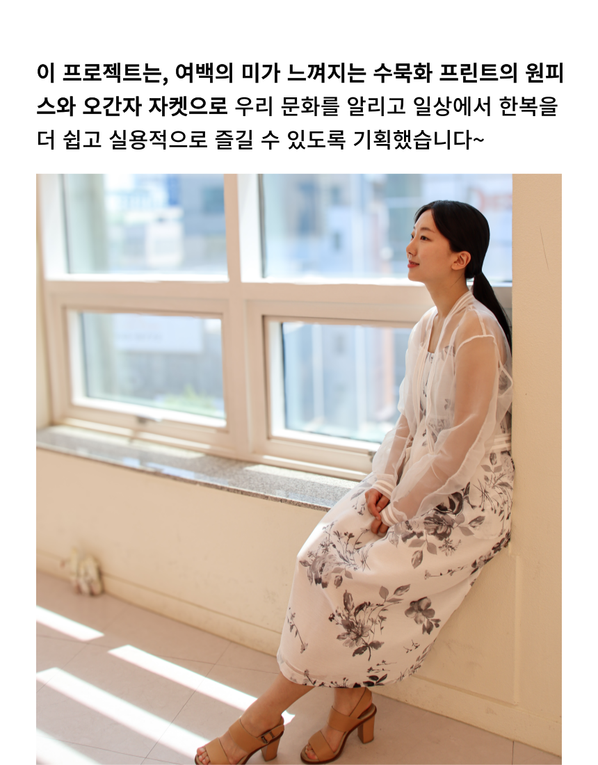 여백의 미가 느껴지는 수묵화 프린트가 돋보이는 한복 소재의 원피스와 투명한 오간자 자켓.