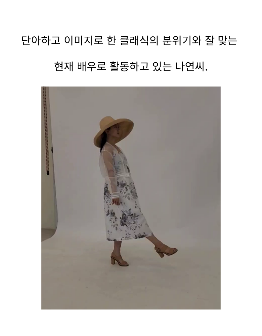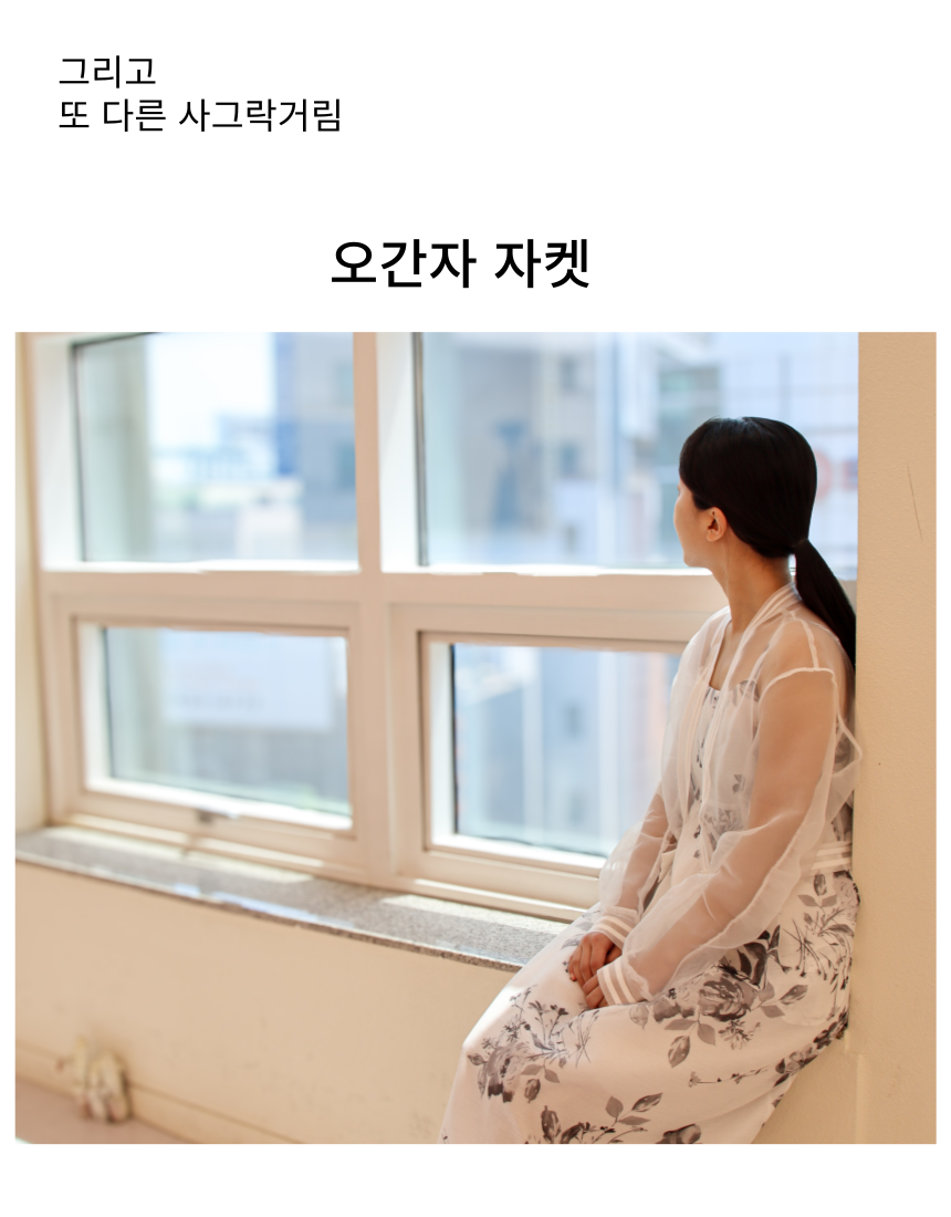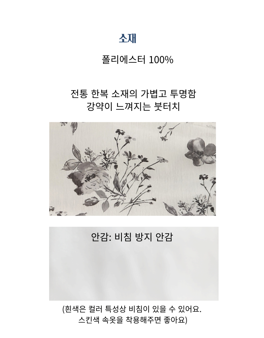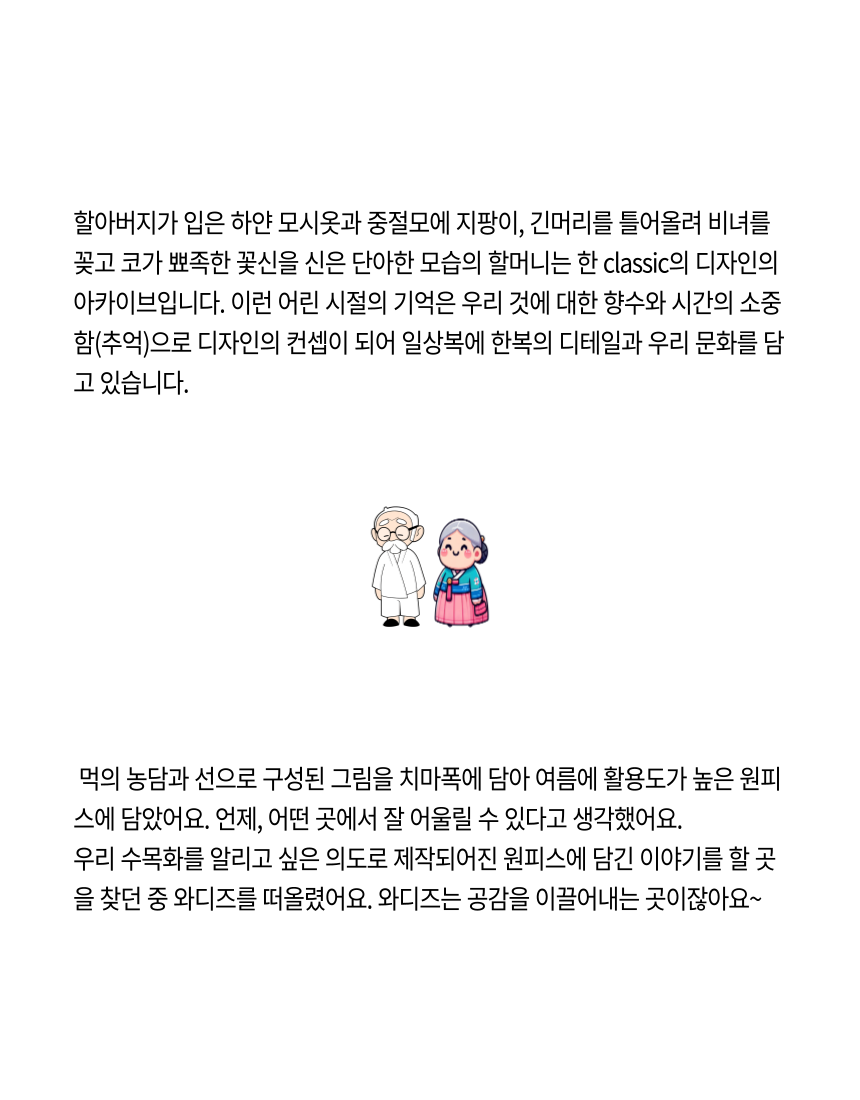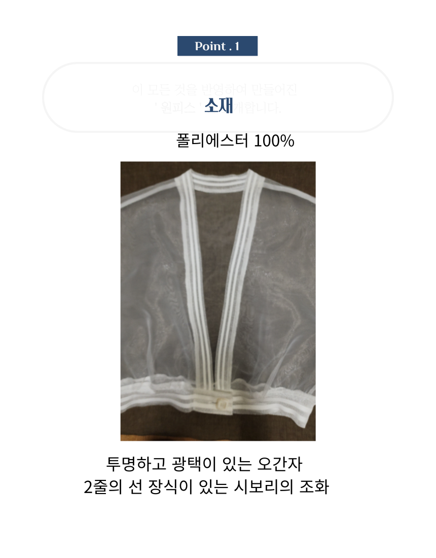 여백의 미가 느껴지는 수묵화 프린트가 돋보이는 한복 소재의 원피스와 투명한 오간자 자켓.