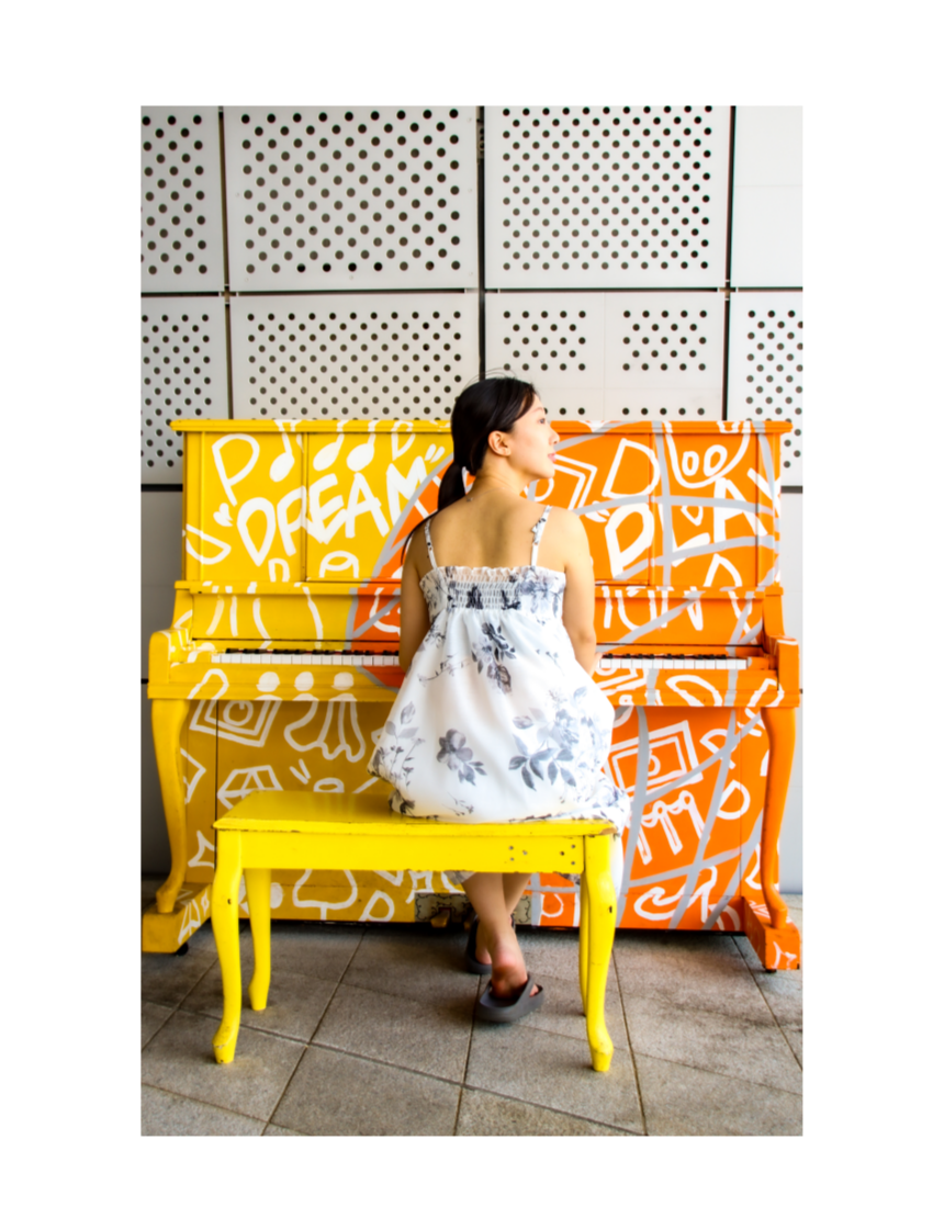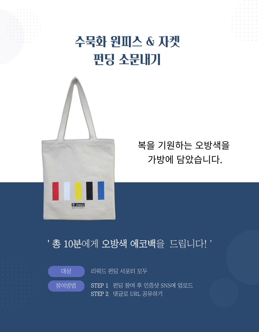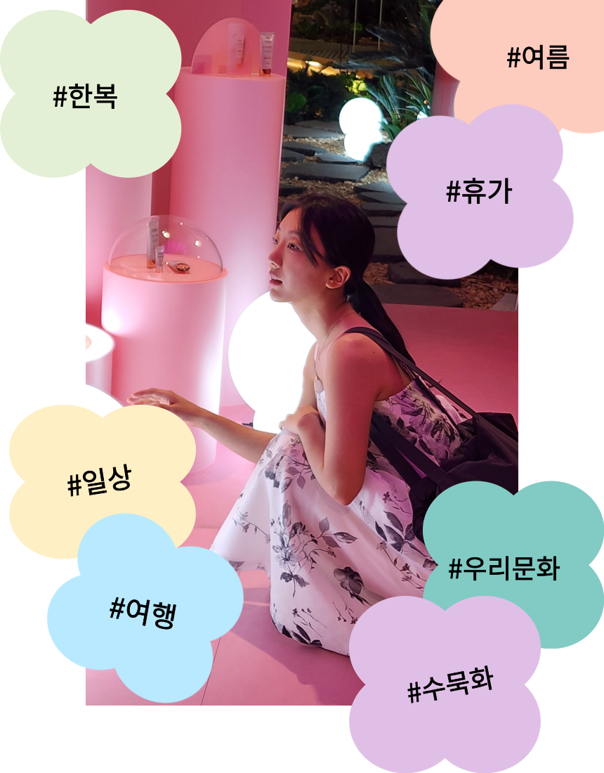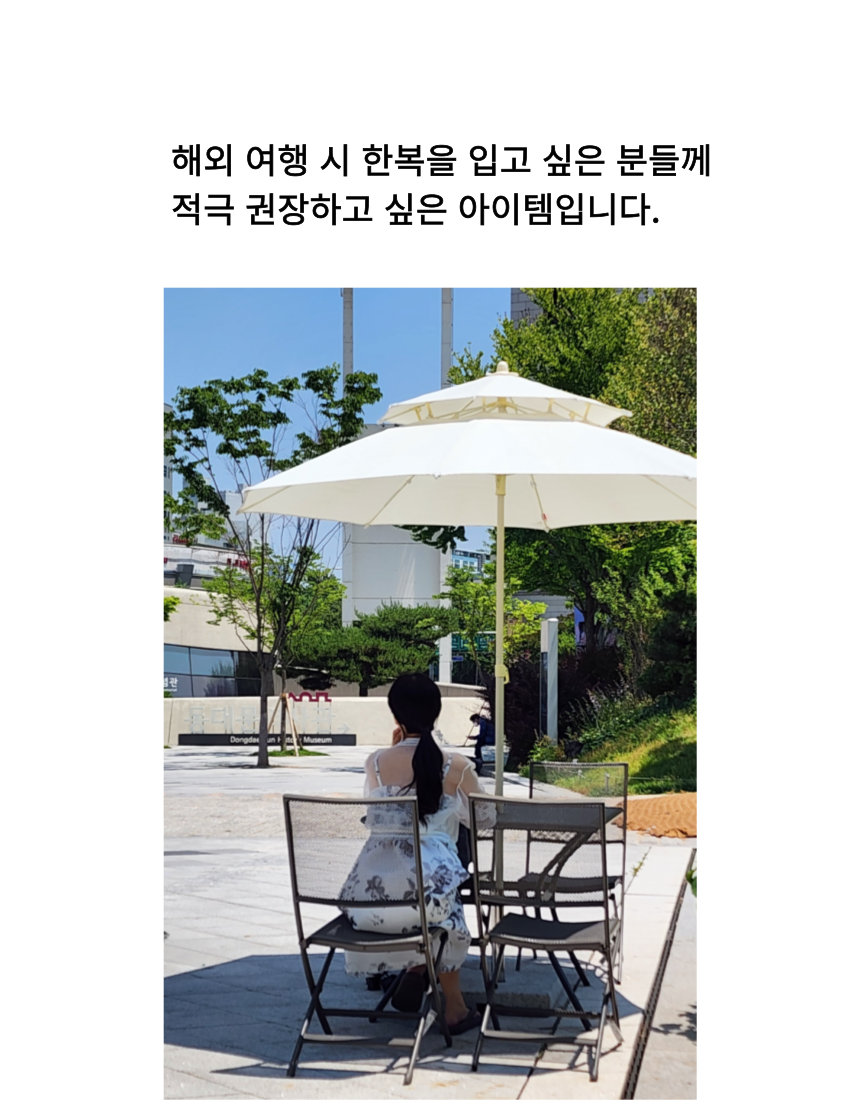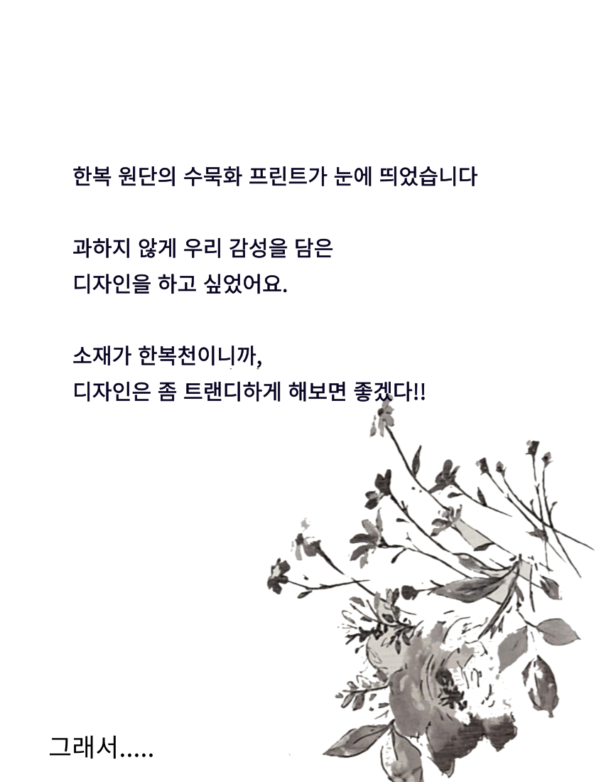 여백의 미가 느껴지는 수묵화 프린트가 돋보이는 한복 소재의 원피스와 투명한 오간자 자켓.