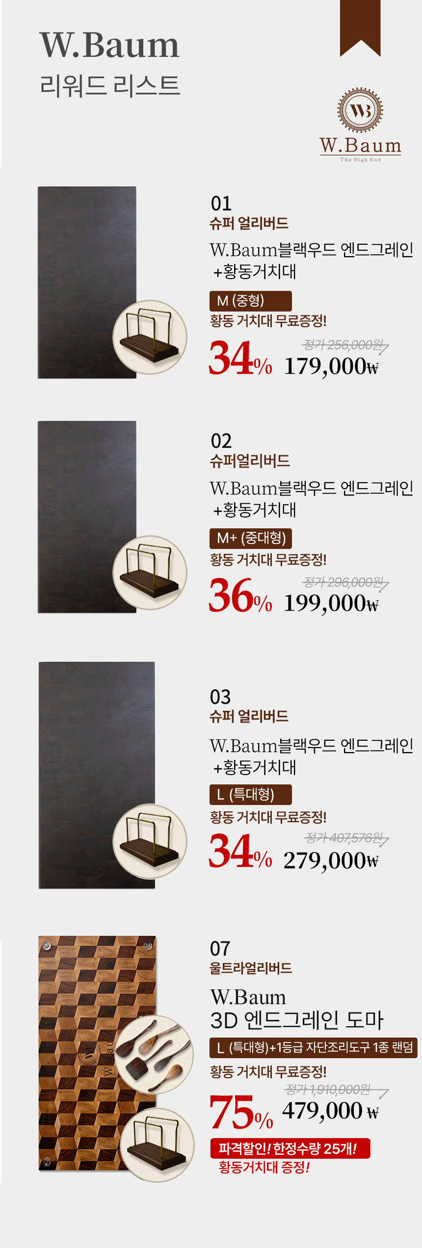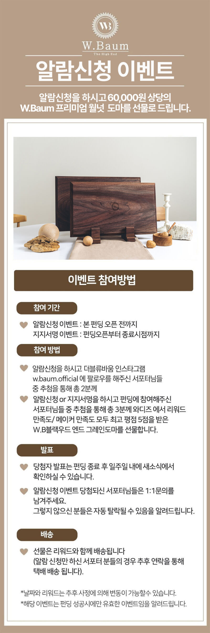 첫펀딩때는 거치대 문의가 참 많았는데, 거치대를 출시하지 않았습니다. W.Baum은 '주방의 배경'이라는 High-End 브랜드로 탄생했습니다. 그러기에 주방의 배경이란 취지에 맞게끔 품격있고 주방의 분위기를 살릴 수 있는 심미성과 무거운 도마를 안정적으로 거치할 수 있는 안정성과 물빠짐에 용이한 기능성을 선보여드리고 싶었습니다. 그래서 6개월이라는 시행착오 끝에 출시되었습니다.제 진심어린 마음은 여러분들께 단기간 이윤창출을 위해 흔한 제품보다는 서포터분들의 주방의 가치를 높이고자 탄생한 거치대입니다.