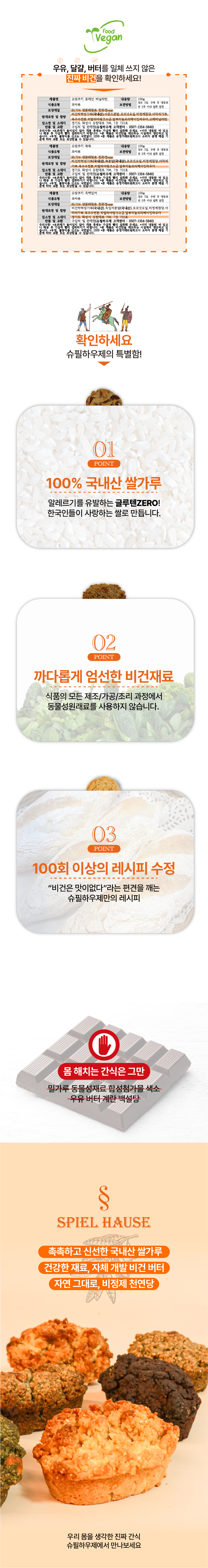 무첨가, 무방부제, 100% 국내산 쌀가루끝까지 건강을 위한 고집을 져버리지 않겠습니다.나를 소중하게 하는 일, 내 소중한 사람을 행복하게 하는 일, 슈필하우제가 함께하겠습니다.