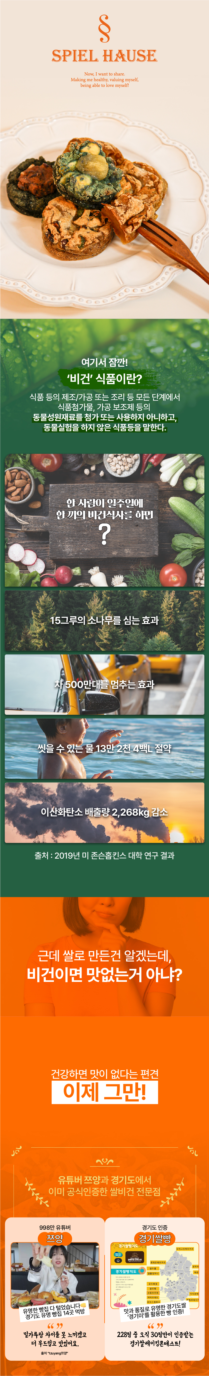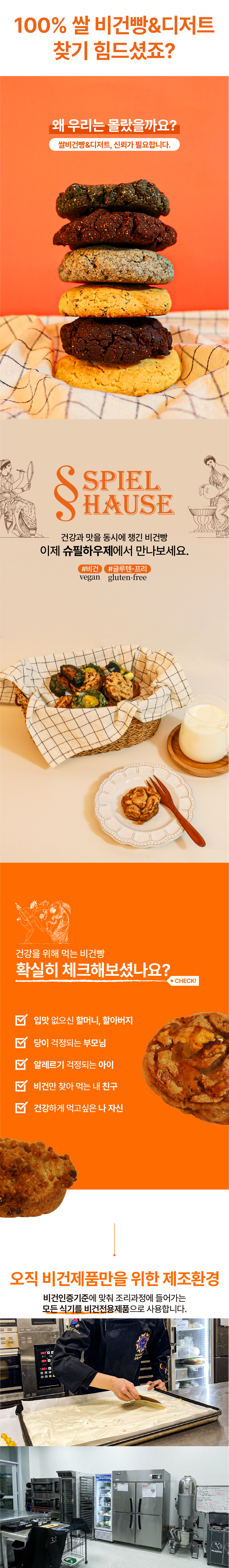 하지만, ‘비건은 맛이 없다’라는 사람들의 편견을 깨야 했고,제품 1개마다 100회 이상의 레시피 수정을 하게 되었습니다.몇 가지 레시피 샘플을 두고 손님들께 블라인드 테스트투표를 진행하는 등, 슈필하우제만의 맛을 찾기 위해 노력했습니다.수많은 시행착오를 거쳐 탄생한 지금의 슈필하우제 쌀비건 레시피, 드셔보면‘쌀가루로 만들었다고?’라는 생각이 떠오를거라 자신합니다.