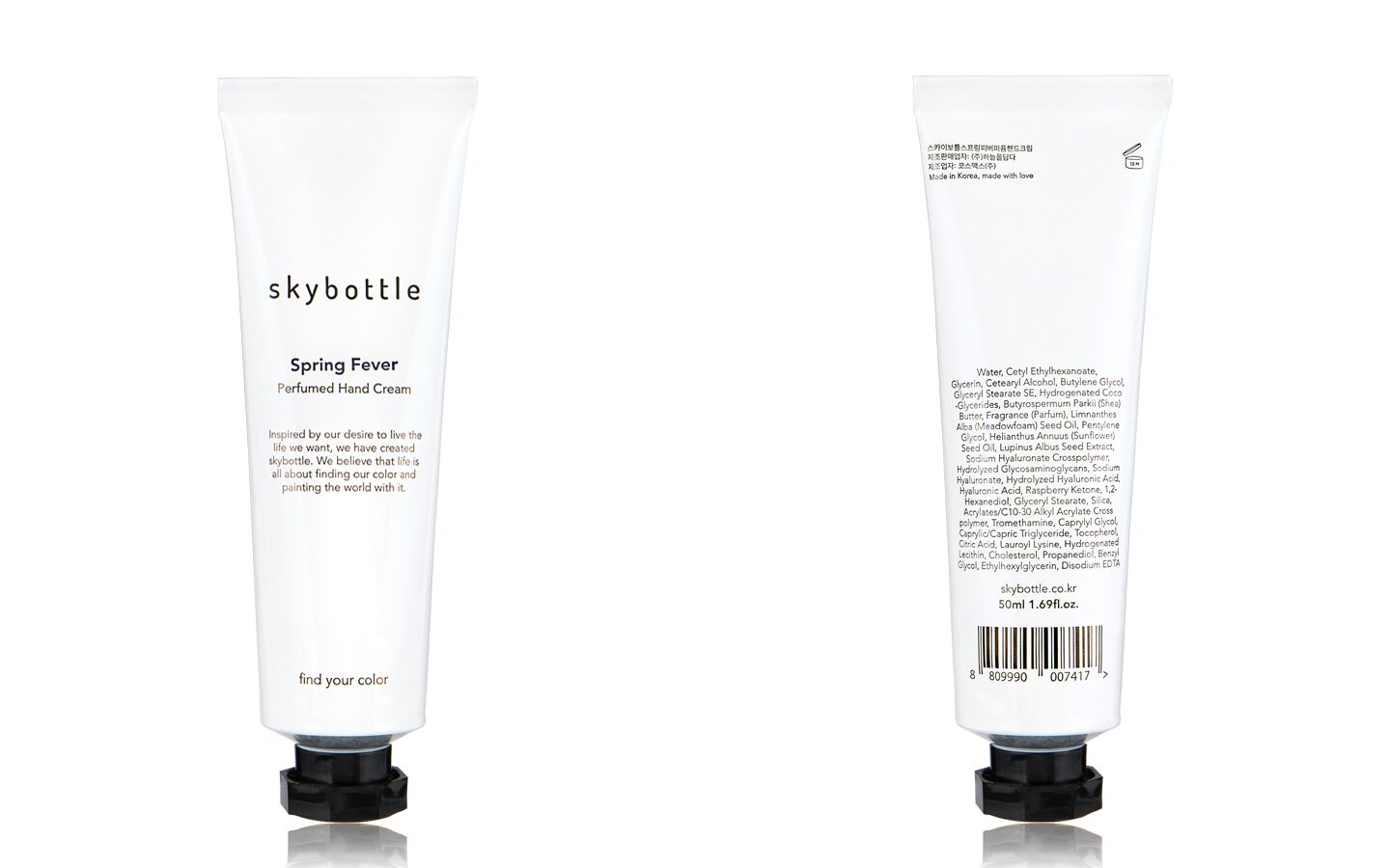 스카이보틀 퍼퓸 핸드크림은 향료를 제외한 전성분을 EWG 그린 등급으로 제조하여 성분 또한 착하게 구성되었습니다!