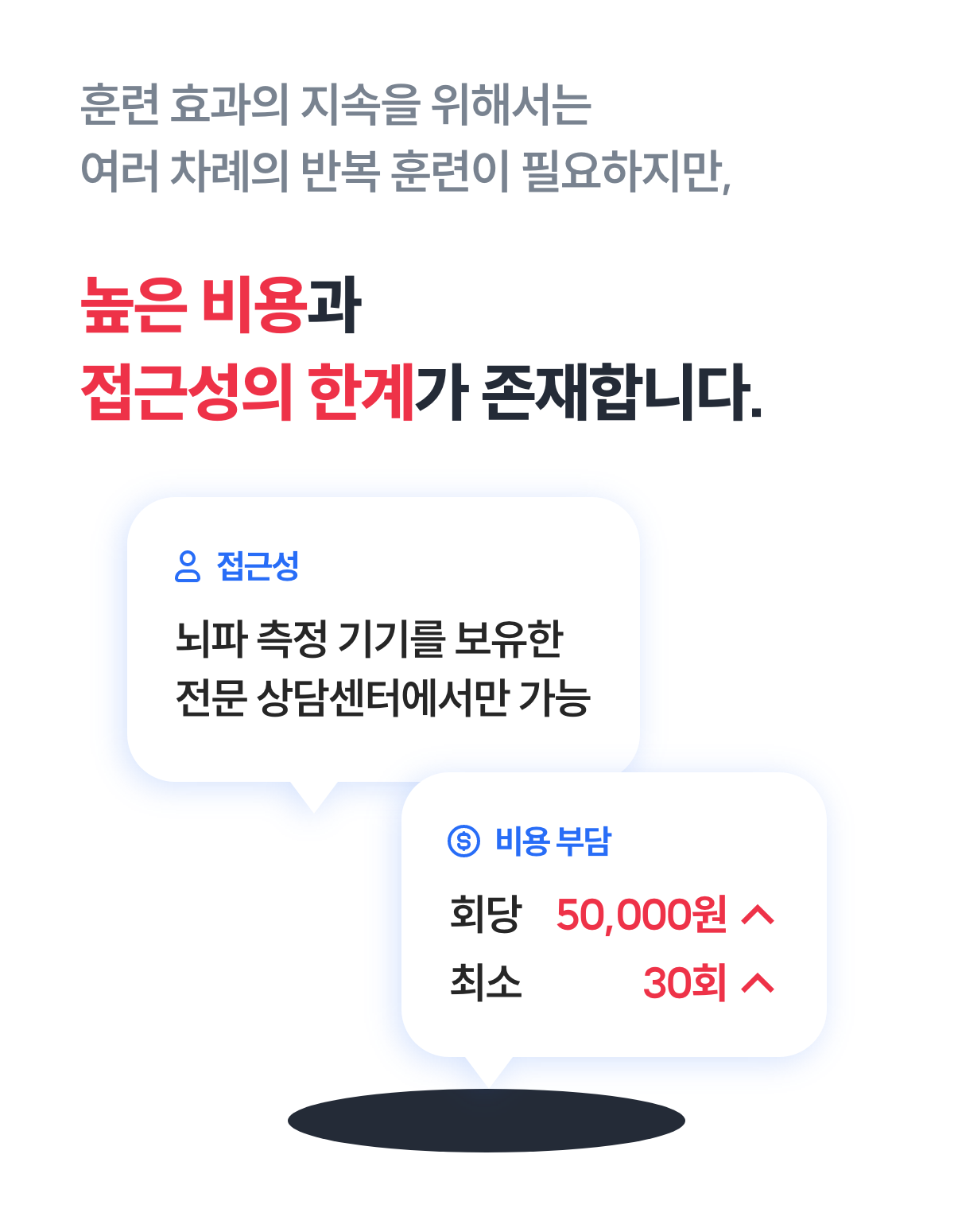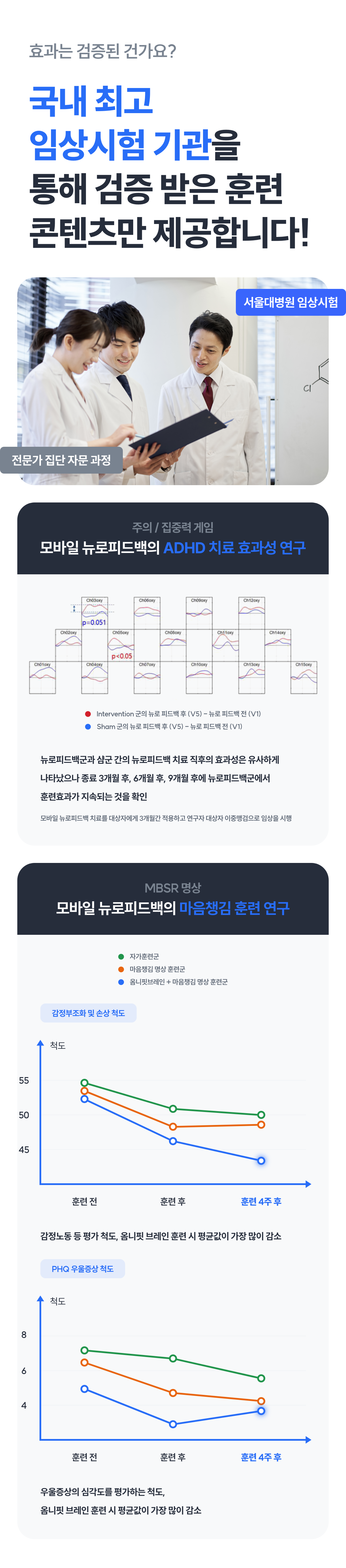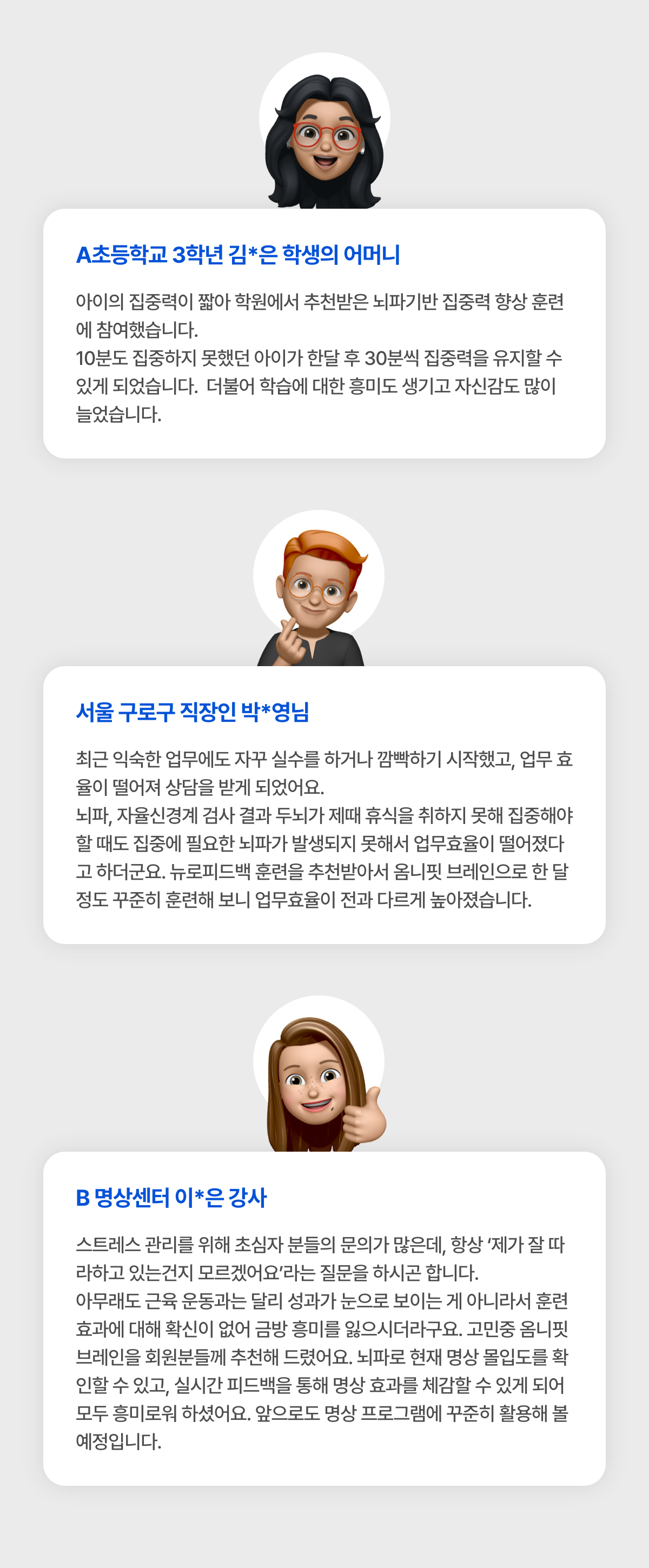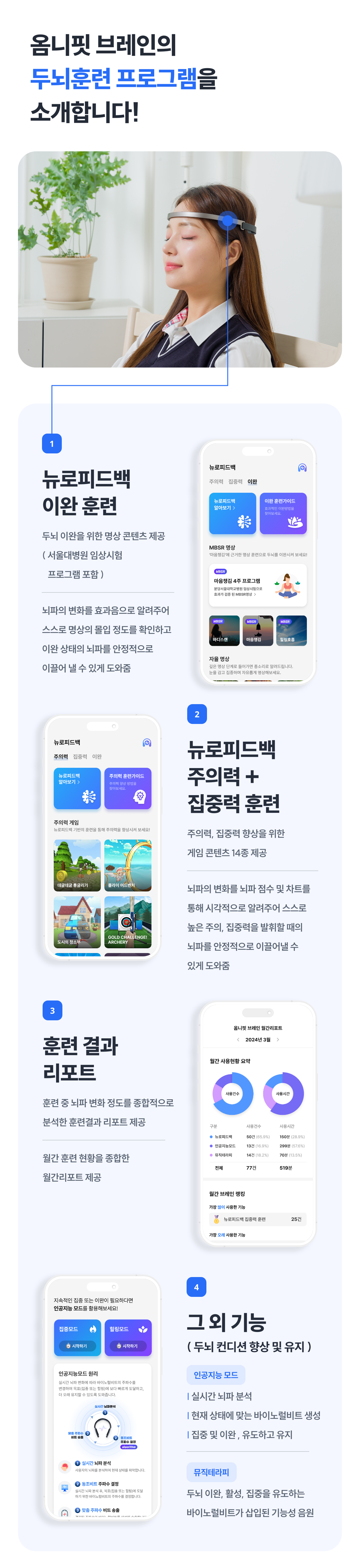 그 외에도 멘탈 헬스케어 10년 운영 데이터를 기반으로 고도화 한 뇌파 분석 AI의 적용, 훈련 콘텐츠의 추가 개발, UI/UX 개선을 통한 모바일 App 사용성 개선 등 전문센터에 가지 않고도 개인이 쉽게 훈련을 지속할 수 있도록 제품, 서비스, 콘텐츠까지 새롭게 제작되었습니다.
