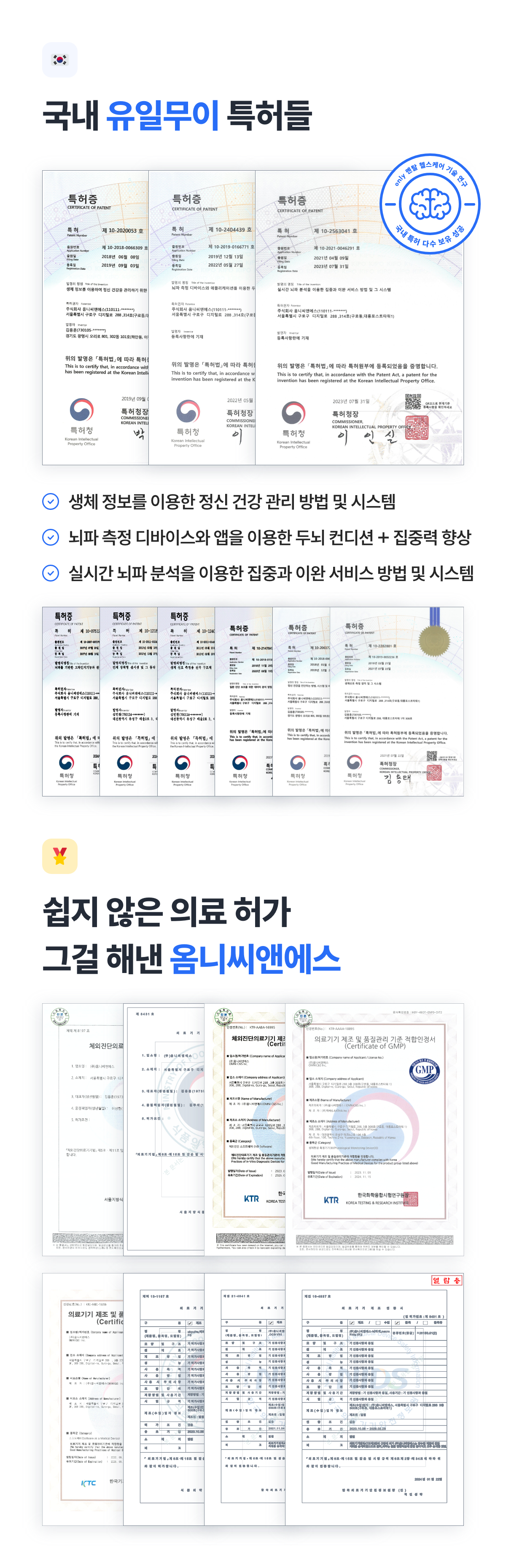 옴니씨앤에스는 오로지 멘탈 헬스케어 기술만을 연구 개발하여 수많은 특허와 수준 높은 기술력을 보유하고 있습니다.