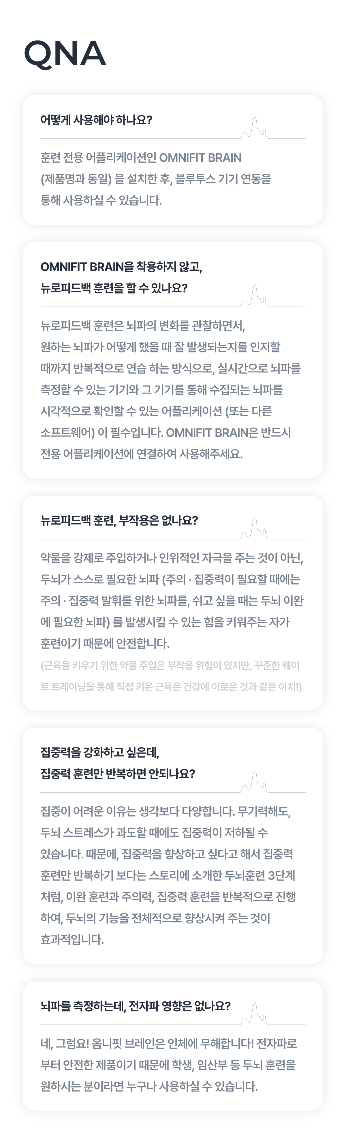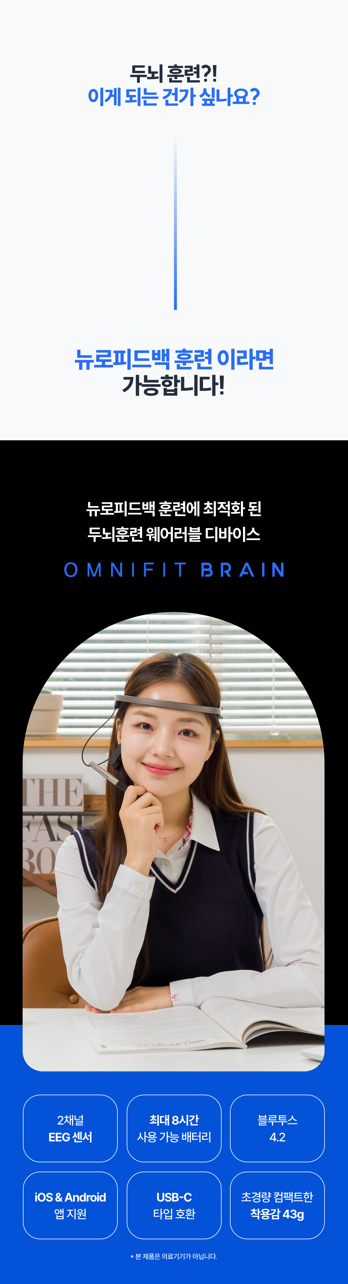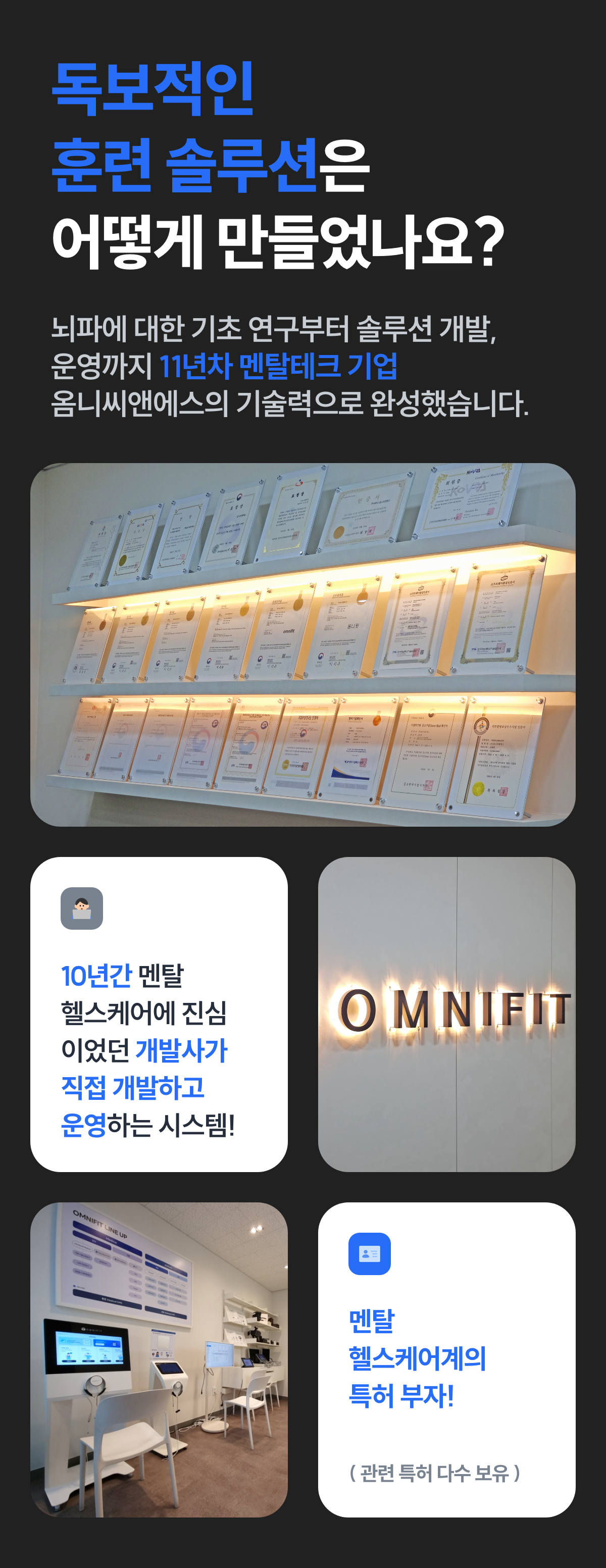 2018년 옴니핏 브레인을 출시하여, 상담센터, 명상센터, 병 · 의원 등을 통해 효과성을 검증하였고, 2024년 제품의 경량화, 스트랩 개선 등을 통해 착용성을 향상시킨 개인용 훈련 제품을 출시하게 되었습니다.