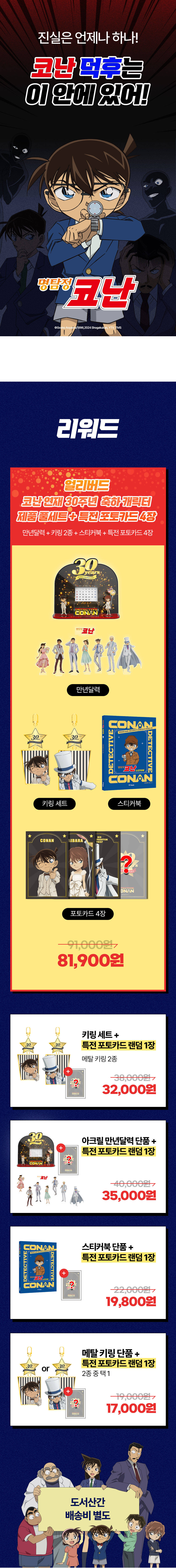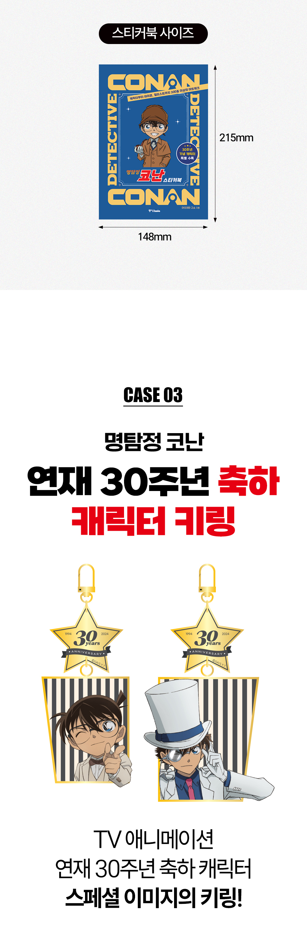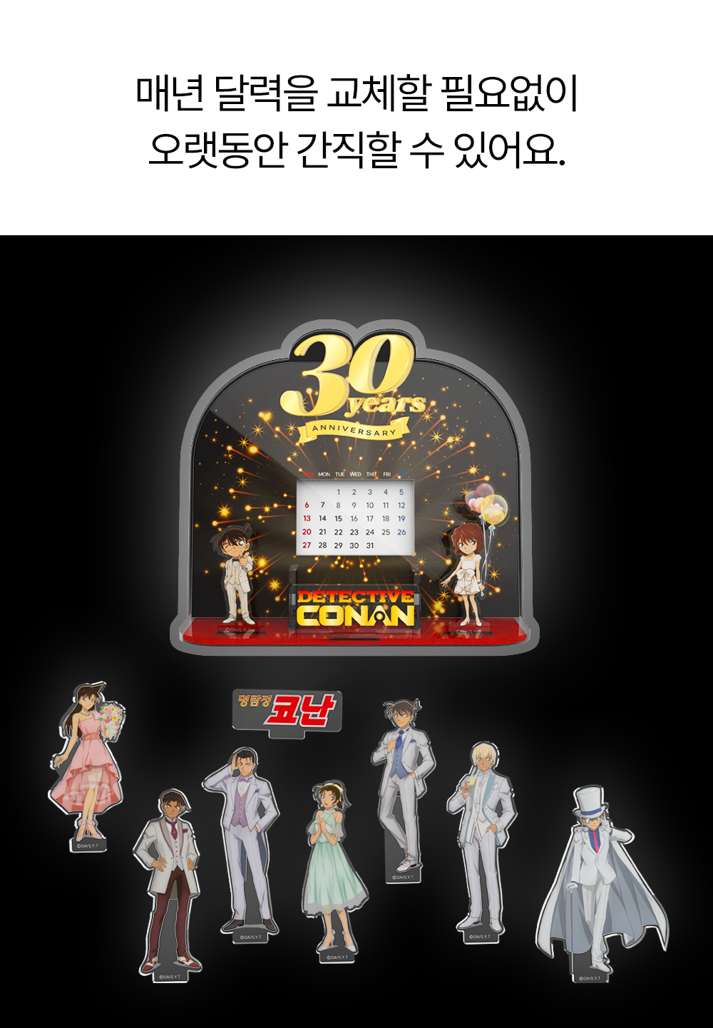 명탐정코난 연재 30주년 스페셜 파티에 여러분을 초대합니다! 소장가치 넘치는 굿즈들! 평생 곁을 지켜 줄 만년달력, 베스트 아트워크로 구성된 스티커북, 그리고 스페셜 키링까지!