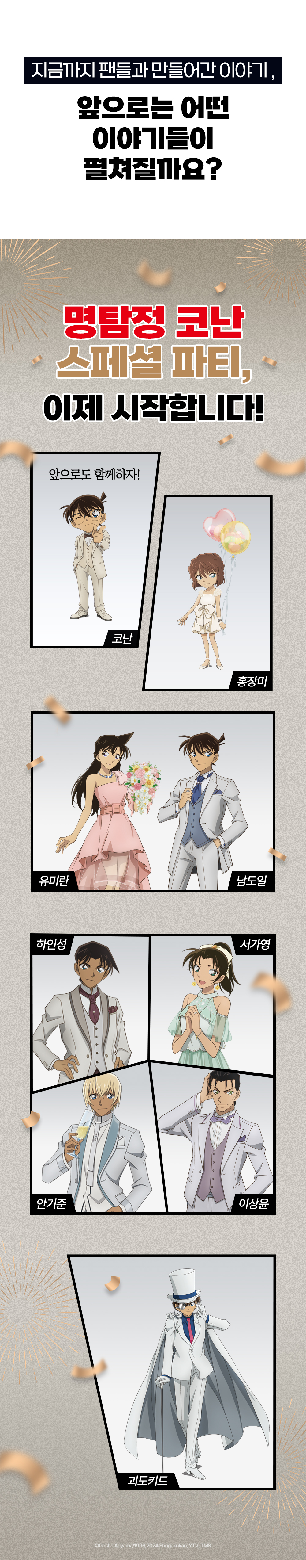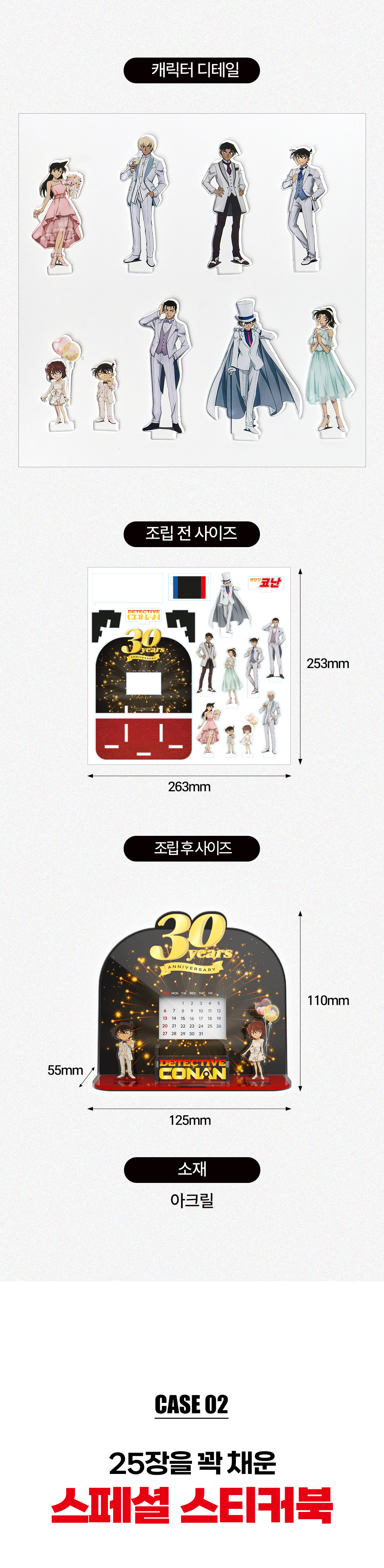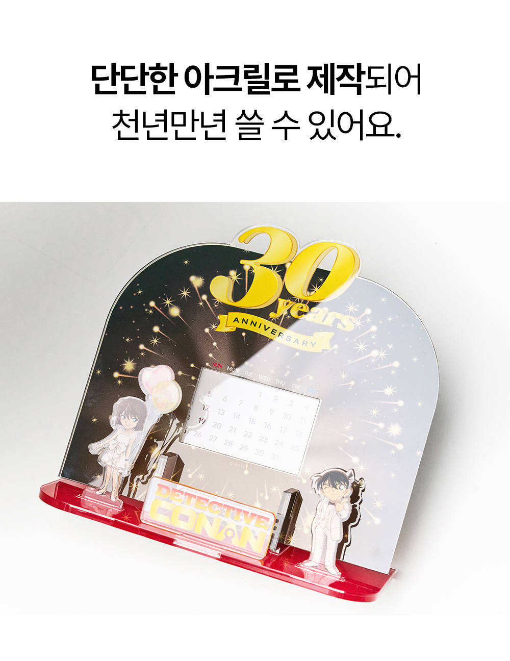 명탐정코난 연재 30주년 스페셜 파티에 여러분을 초대합니다! 소장가치 넘치는 굿즈들! 평생 곁을 지켜 줄 만년달력, 베스트 아트워크로 구성된 스티커북, 그리고 스페셜 키링까지!