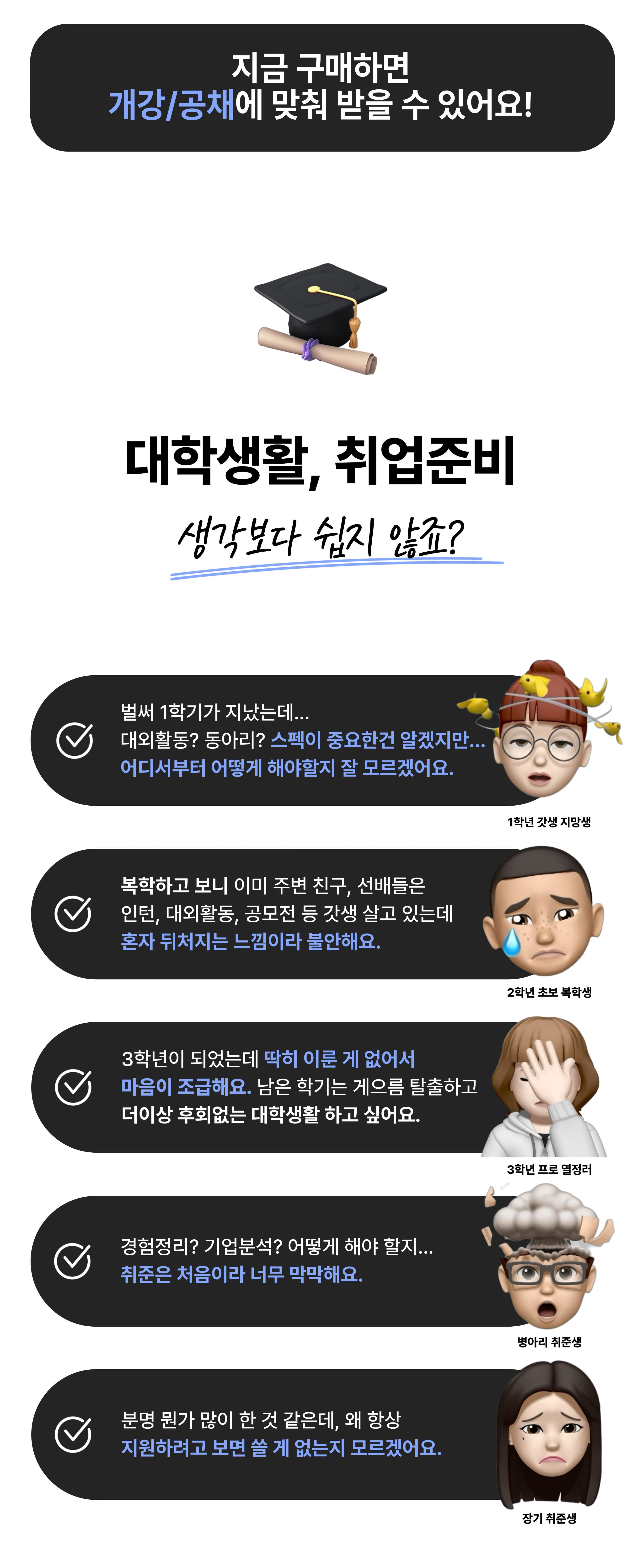 대학생 취준생을 위한 맞춤 노션 템플릿입니다. 대학생활, 취업준비 중 겪는 다양한 고민과 필요사항을 잘 알고 있기에. 이를 해결할 수 있는 실용적인 템플릿을 제공하고자 합니다.