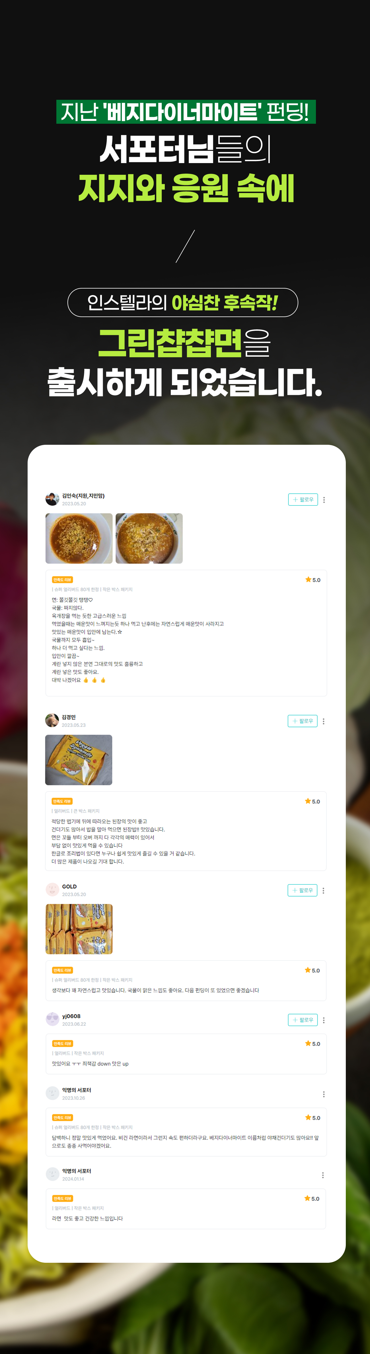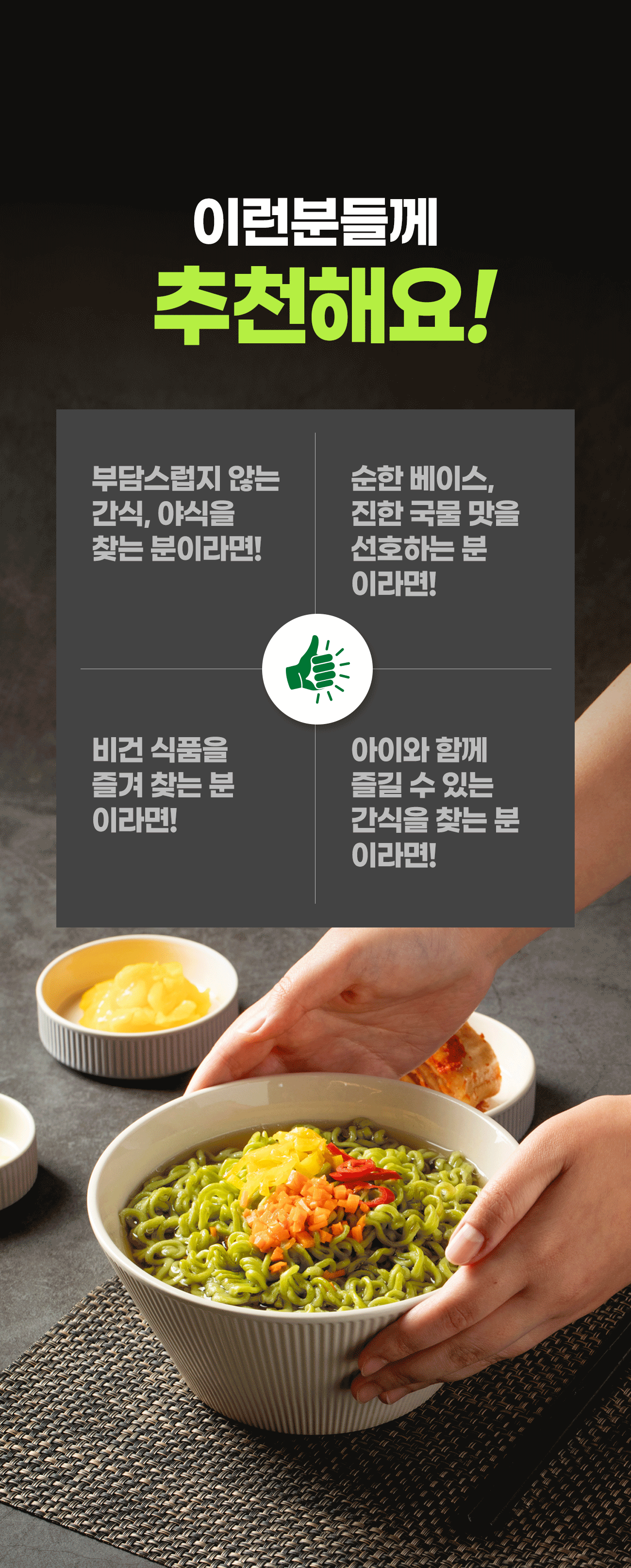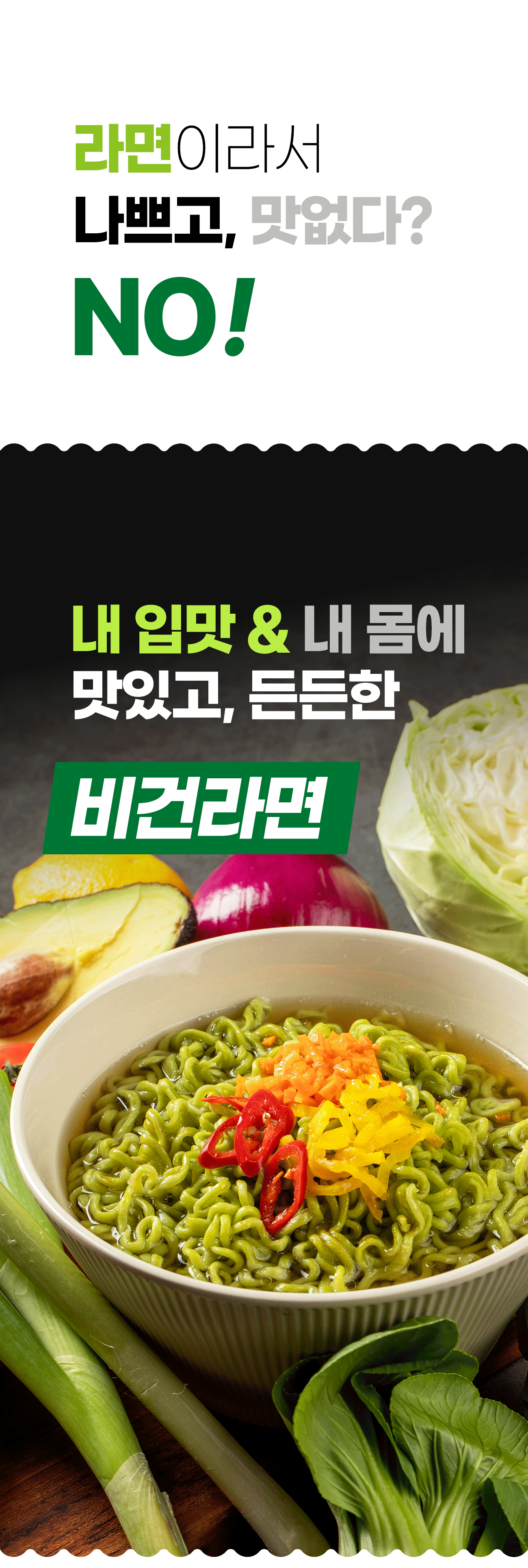 비건라면 개발을 위해 3년이란 시간을 바쳤습니다. 시간이 흐를수록 장 맛이 깊어지듯이 정성들이고 고민한 시간만큼 제품의 깊이는 깊어졌다고 생각합니다.