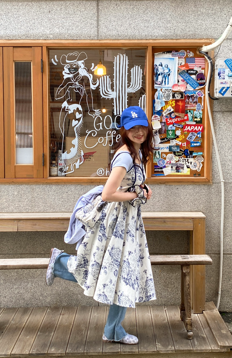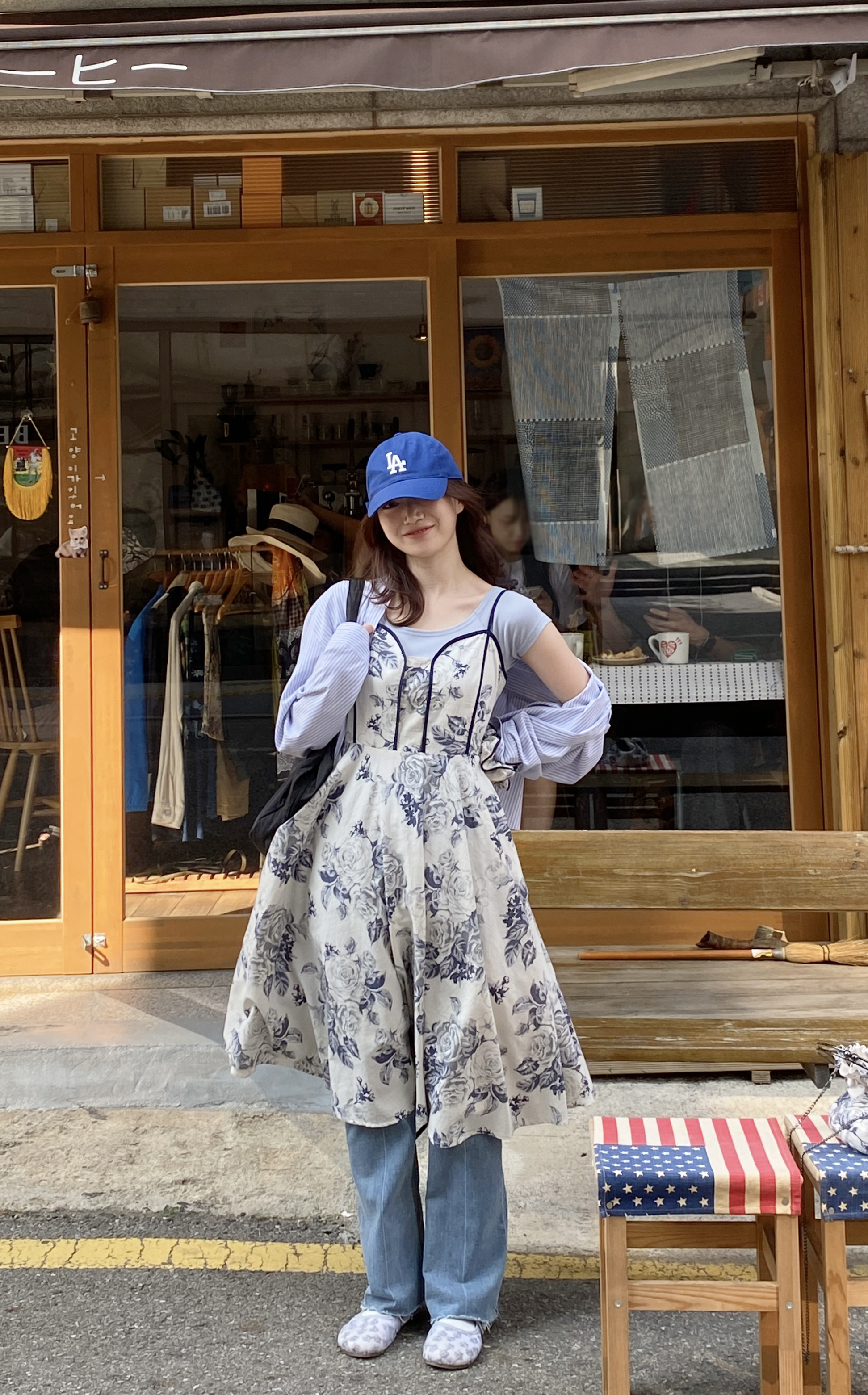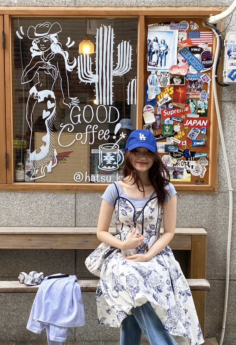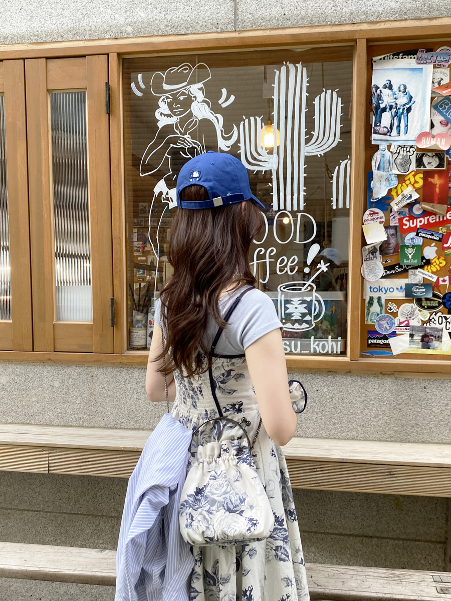 고양이가 있는 핫플 빈티지카페에 왔어요:) 쨍한 컬러감의 블루캡과 함께하니 너무 예쁘죠 !?달달한 크림라떼 시키고 기다리는중.. ღ에어컨 아래 감기 걸리지 않게 언제나 오버핏 셔츠도 챙겨주어요 :)