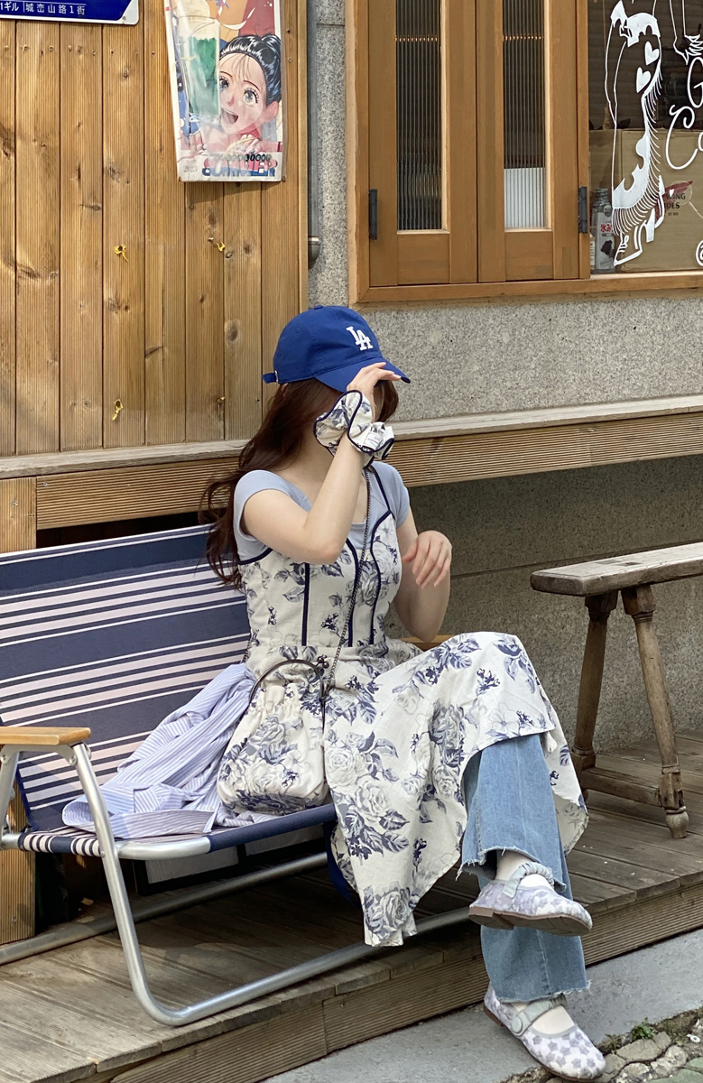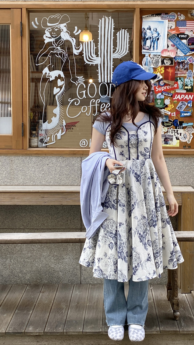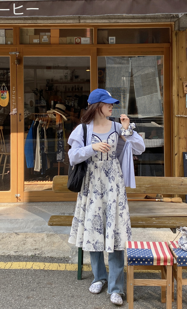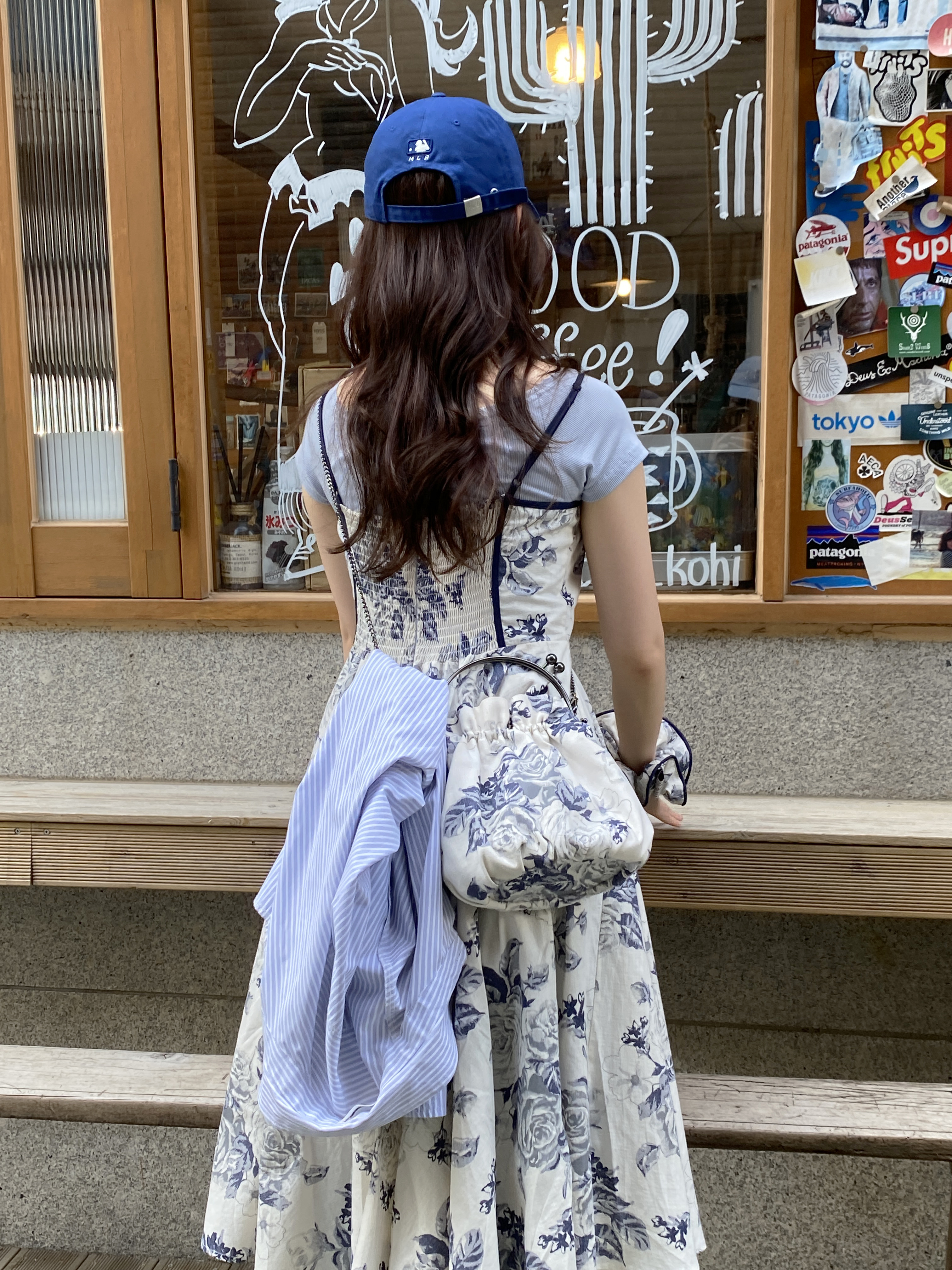고양이가 있는 핫플 빈티지카페에 왔어요:) 쨍한 컬러감의 블루캡과 함께하니 너무 예쁘죠 !?달달한 크림라떼 시키고 기다리는중.. ღ에어컨 아래 감기 걸리지 않게 언제나 오버핏 셔츠도 챙겨주어요 :)