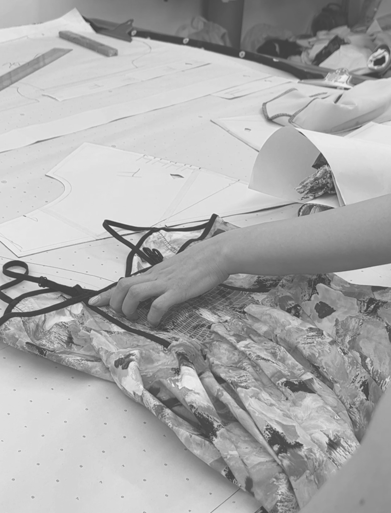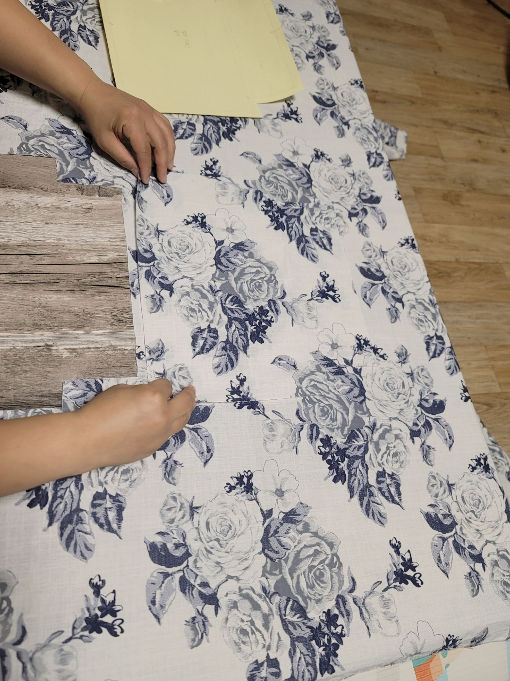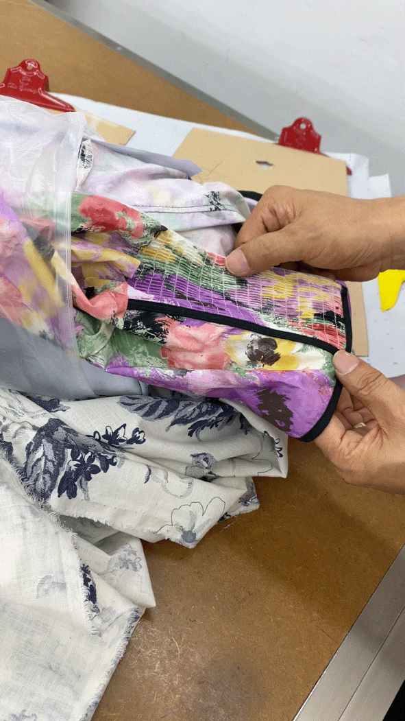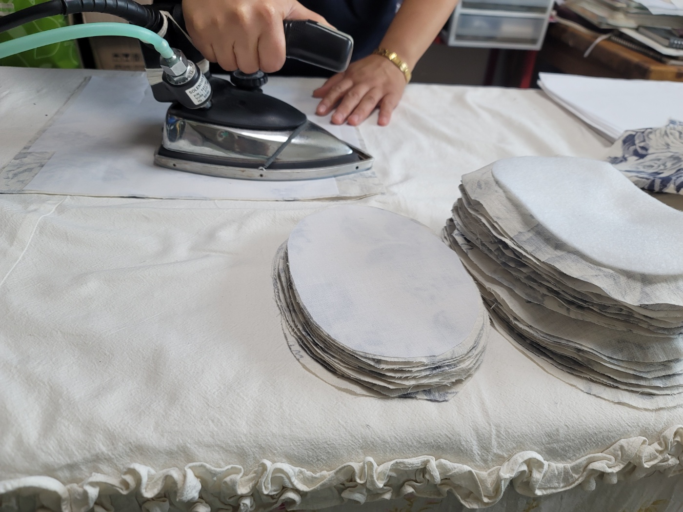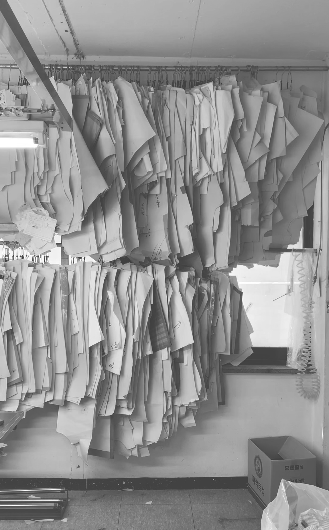 공장에서 대량으로 원단을 한 번에 겹쳐 재단하는 방식이 아닌