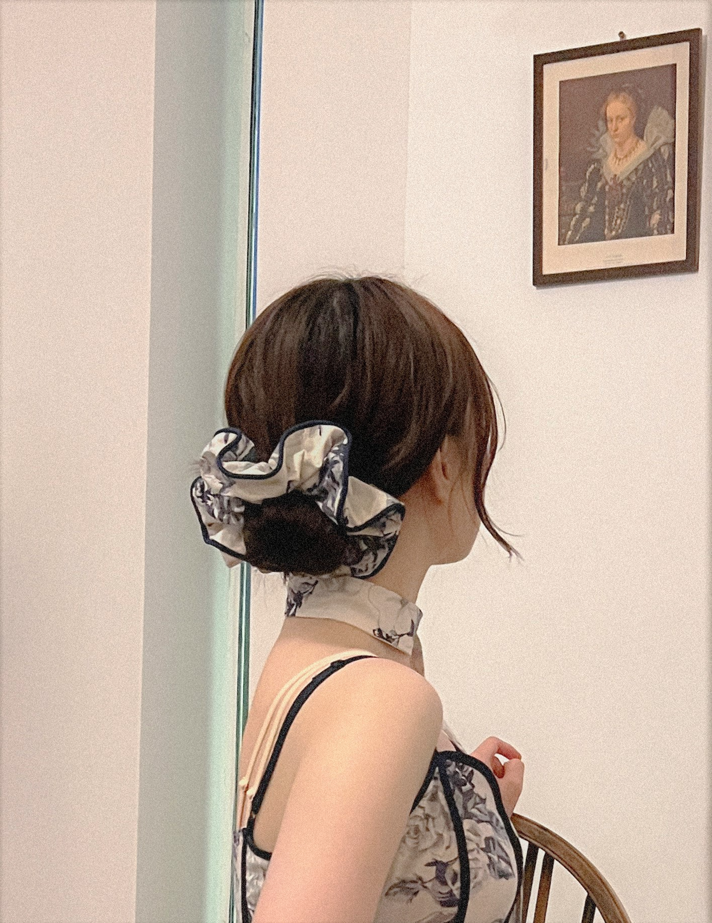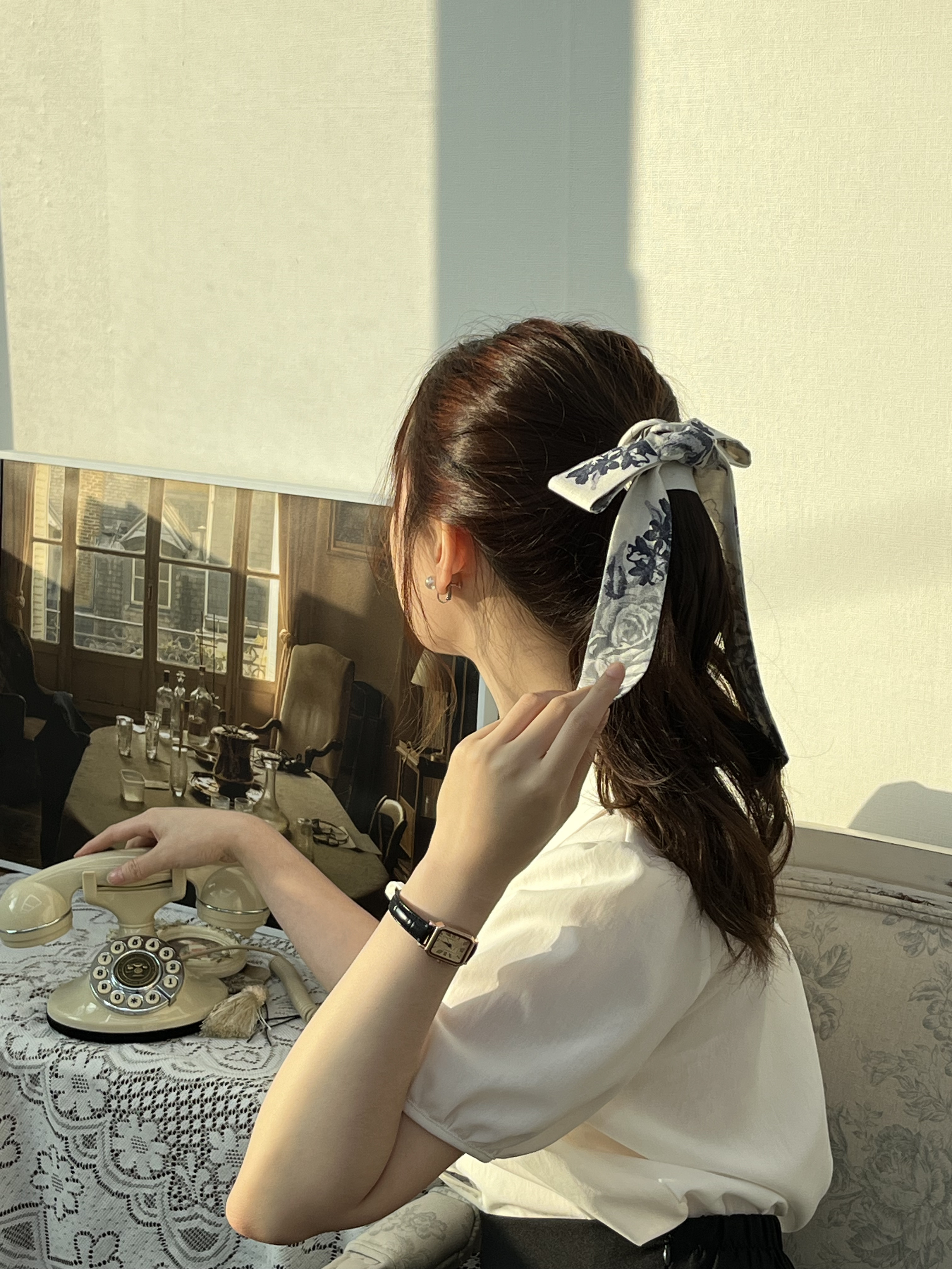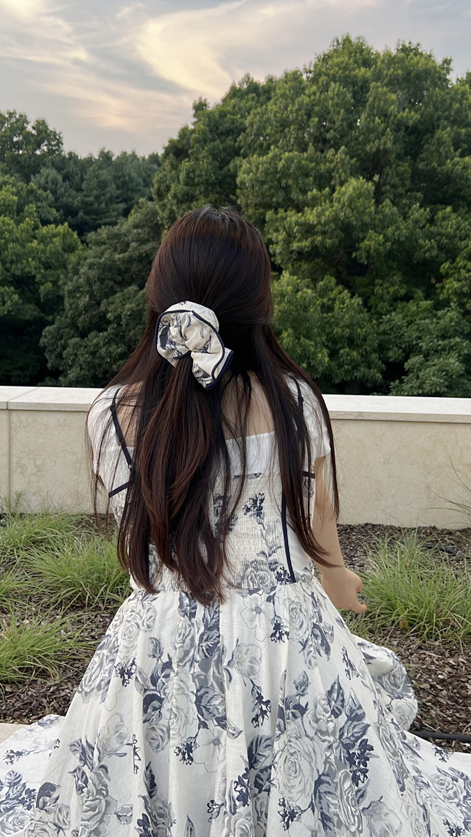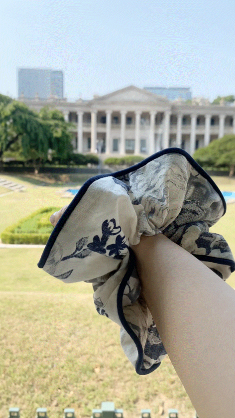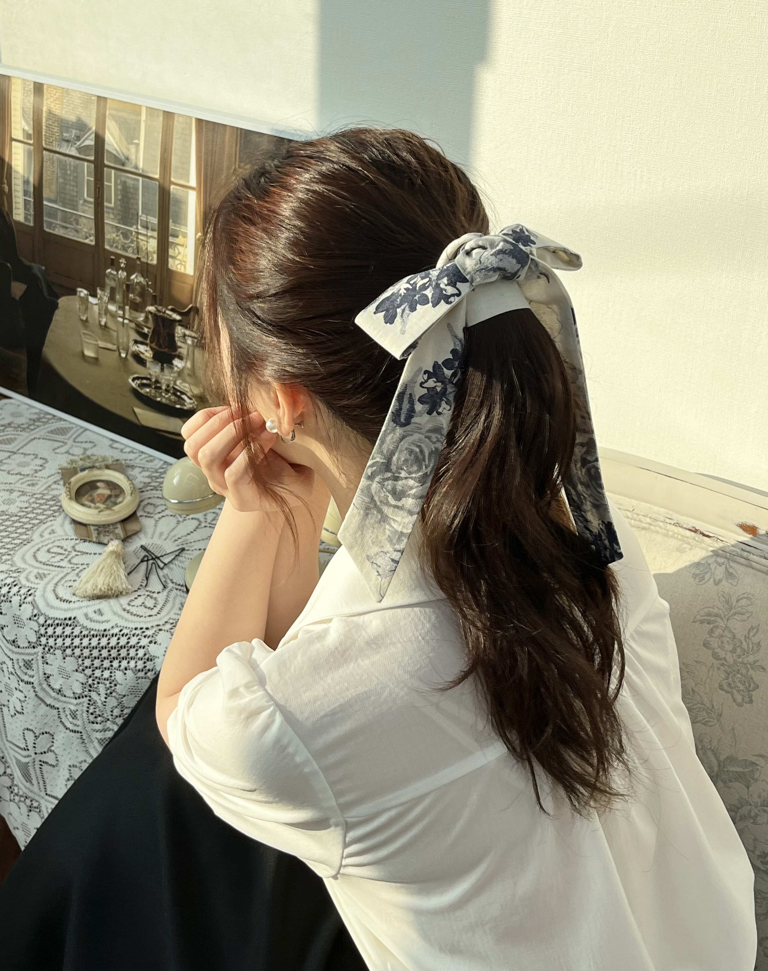 트윌리스카프를 리본이 아닌, 길게 내려오는 댕기스카프 느낌으로 연출도 가능하고