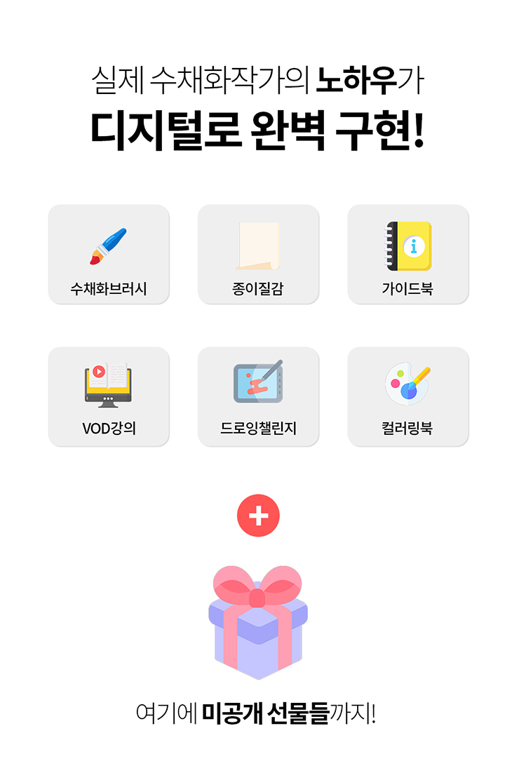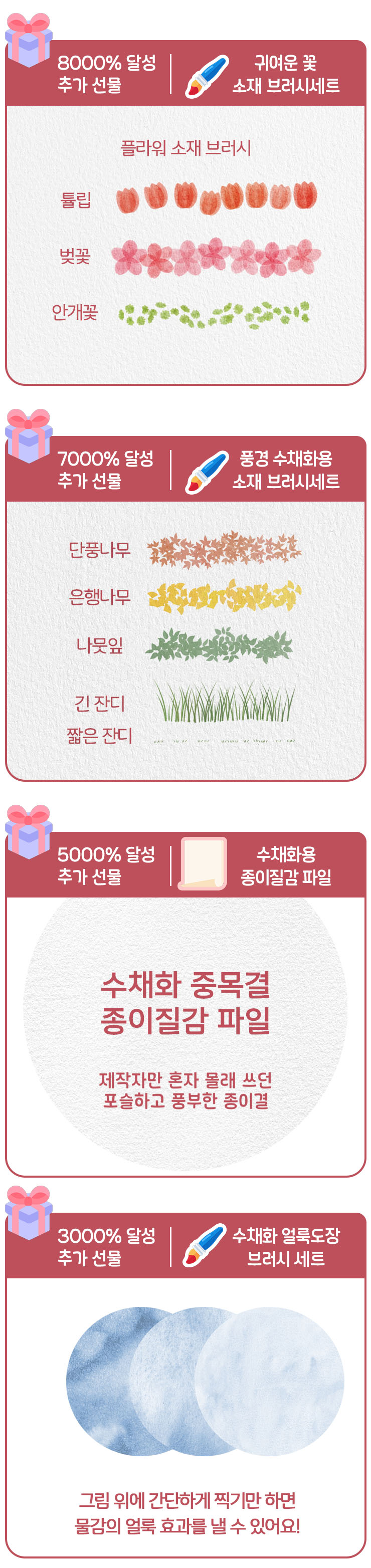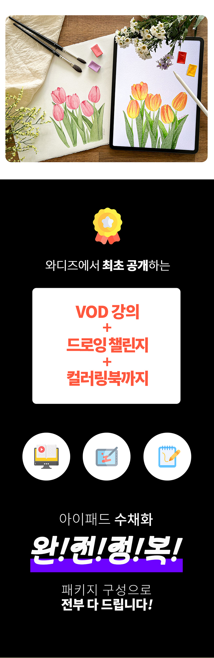 물감보다 더 진짜같은 아이패드 수채화&종이질감 세트! VOD강의와 1:1피드백이 담긴 챌린지, 그리고 가이드북과 컬러링북까지 와디즈에서 모두 챙겨가세요!