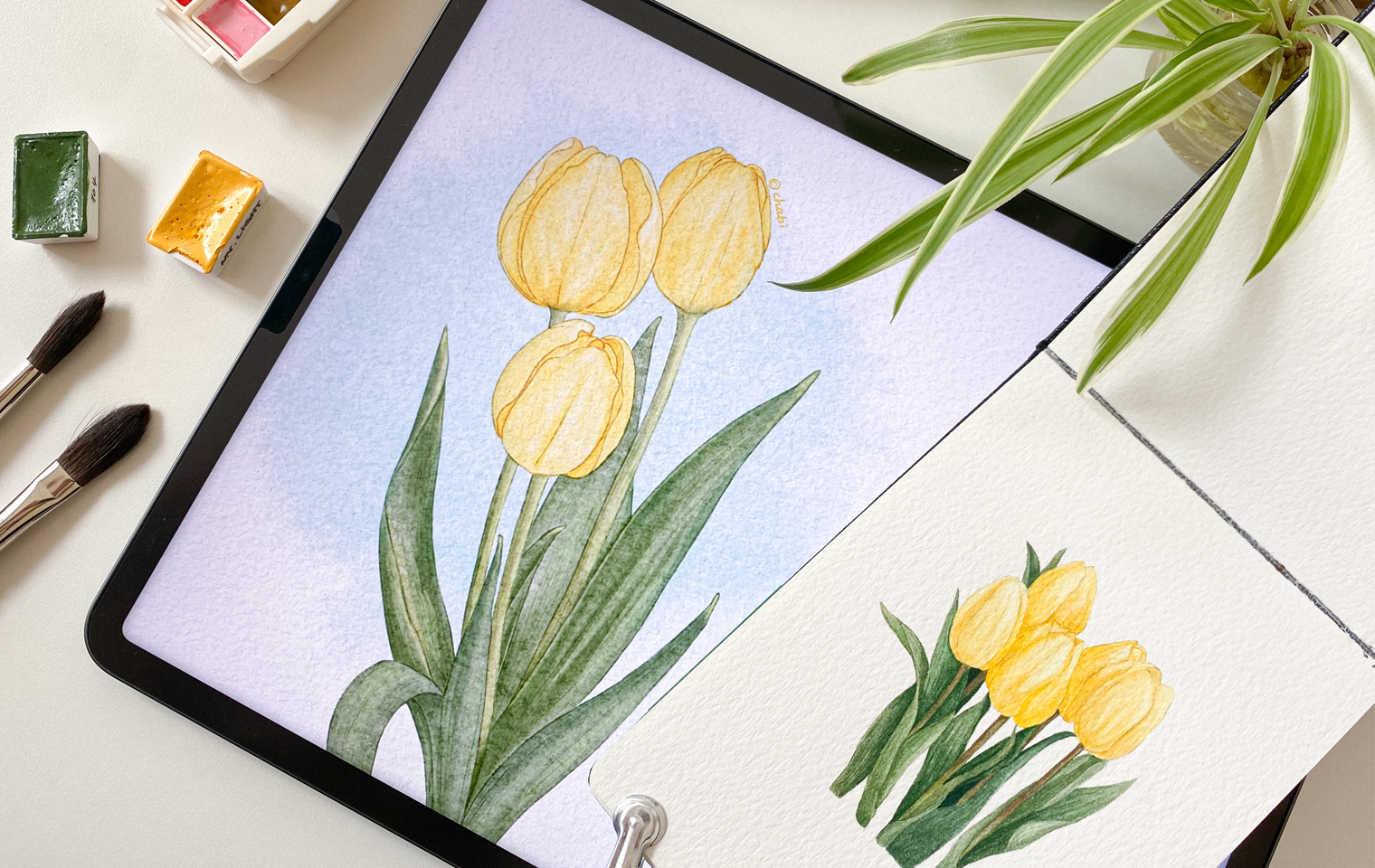 (오른쪽) 실제 스케치북에 수채화로 그린 튤립 일러스트