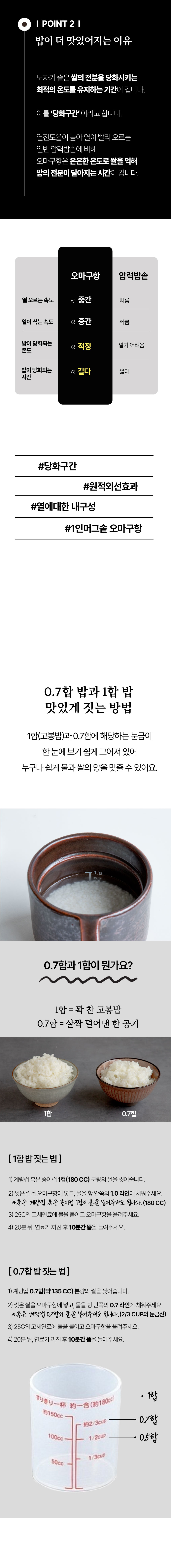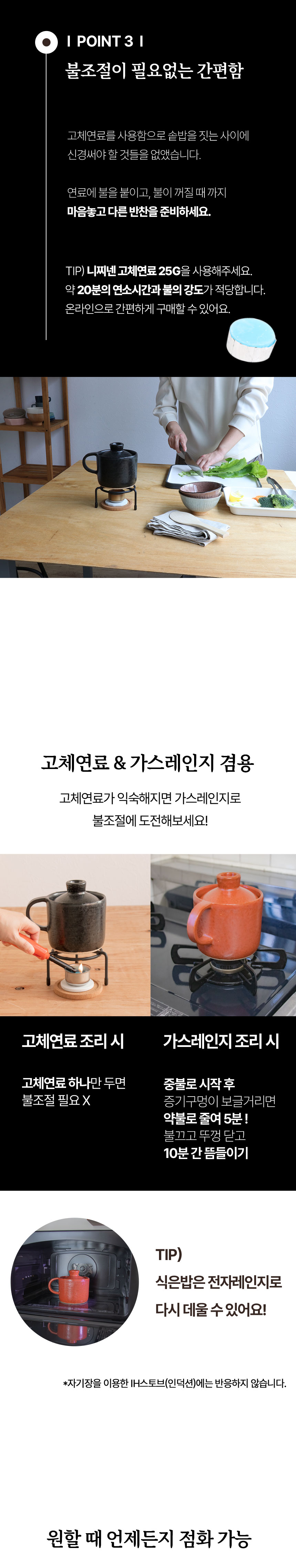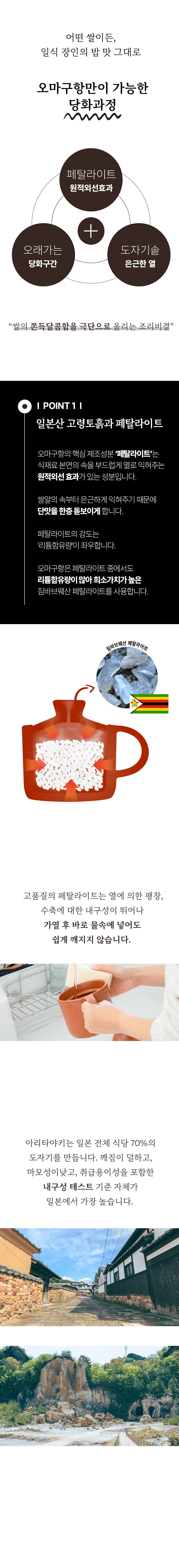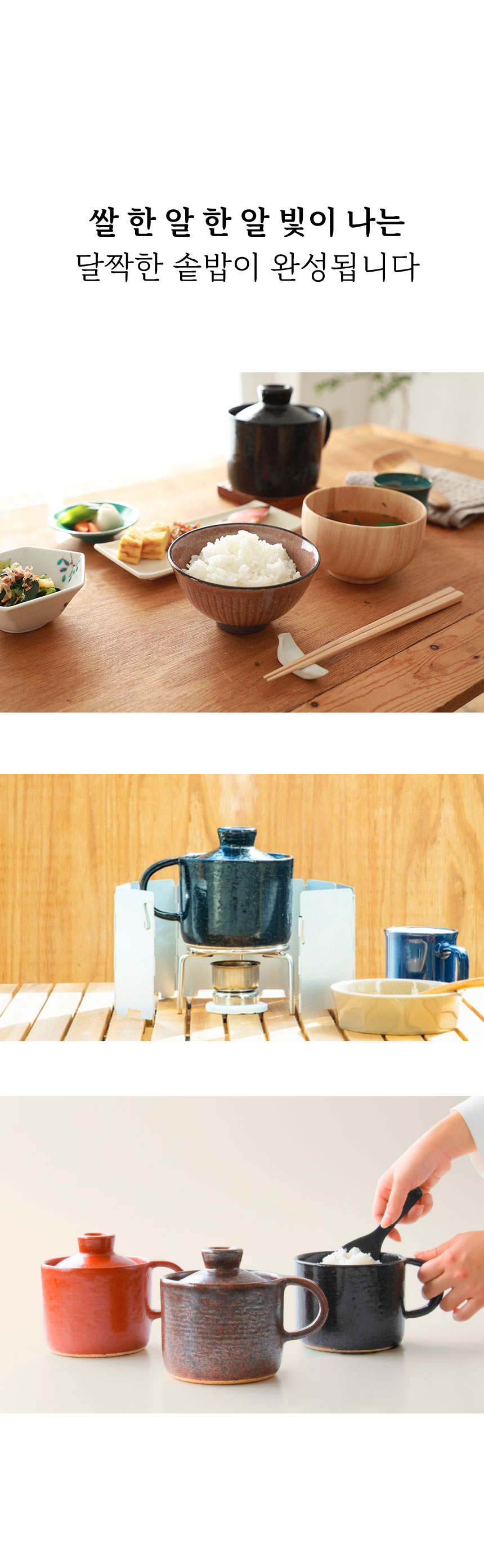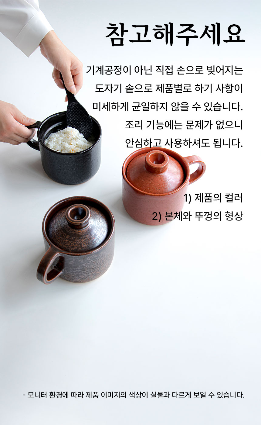 4. 기계공정이 아닌 손으로 빚어지는 도자기 솥으로 제품별로 제품의 컬러, 본체와 뚜껑의 형상이 미세하게 균일하지 않을 수 있습니다.(조리기능에는 문제가 없으니 안심하고 사용하셔도 됩니다)