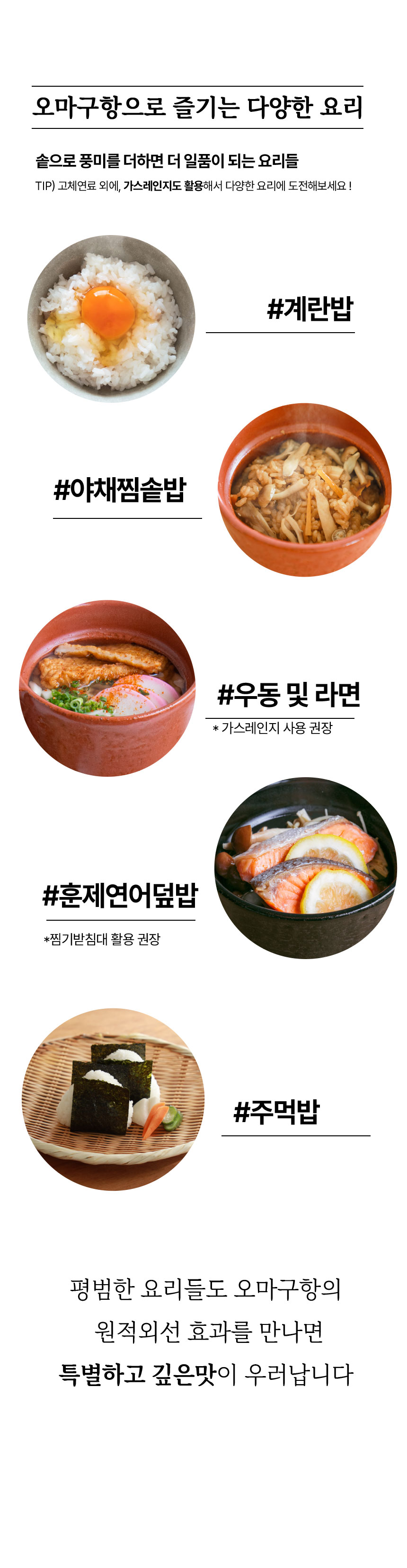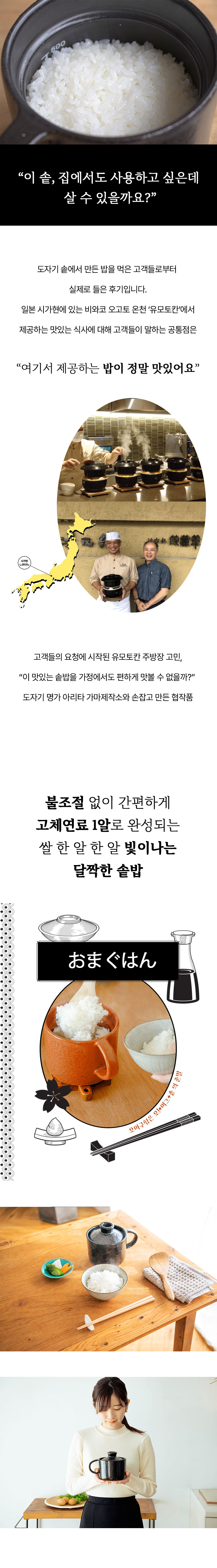 1940년, 일본 식기류 창업 140년의 역사를 가진 오마구항의 개발자의 신념이 담긴 제품입니다. 오마구항이 지은 밥에서 받는 위로, 밥을 올린 후 뚜껑을 열었을 때의 쌀한 알 한 알이 빛이 나, 맛에 의한 감동을 되도록 많은 분들이 체험해주셨으면 좋겠습니다.