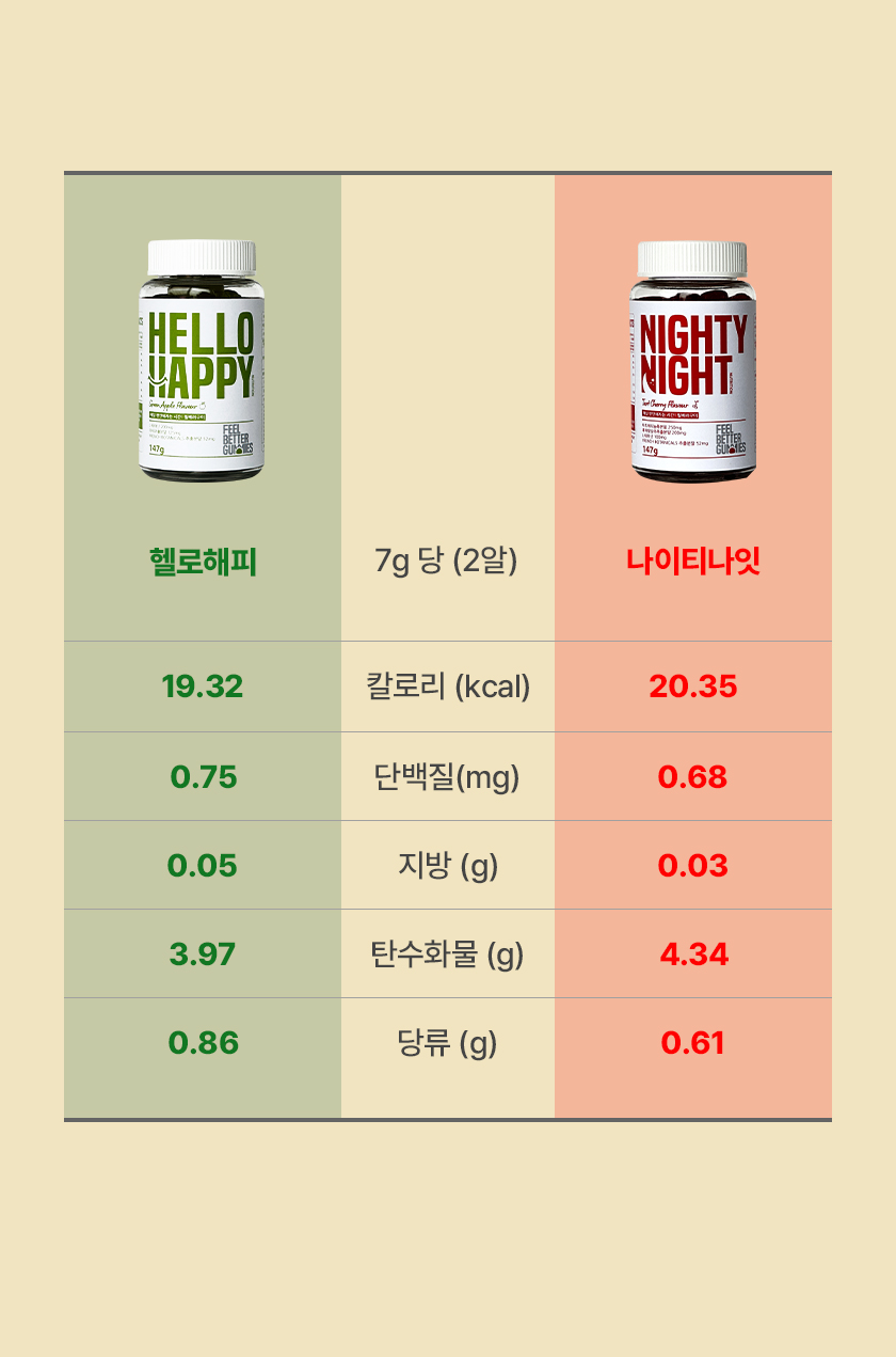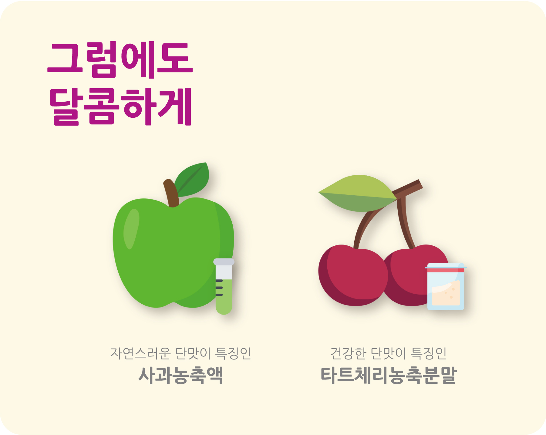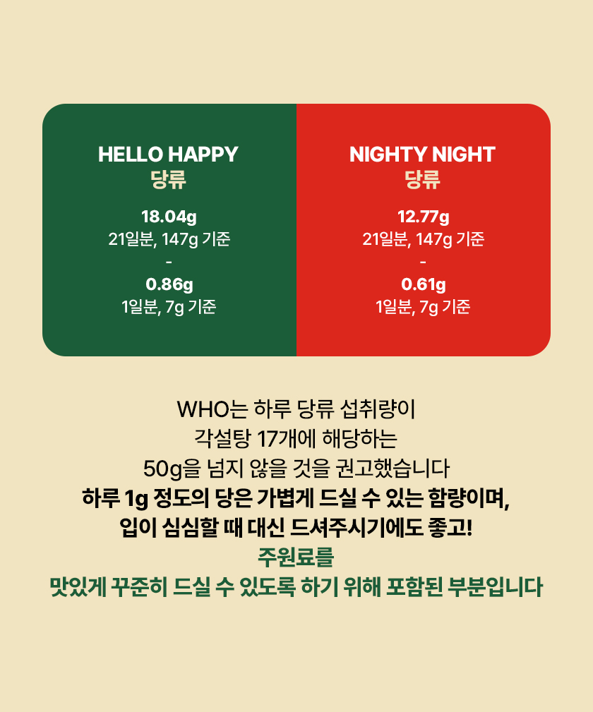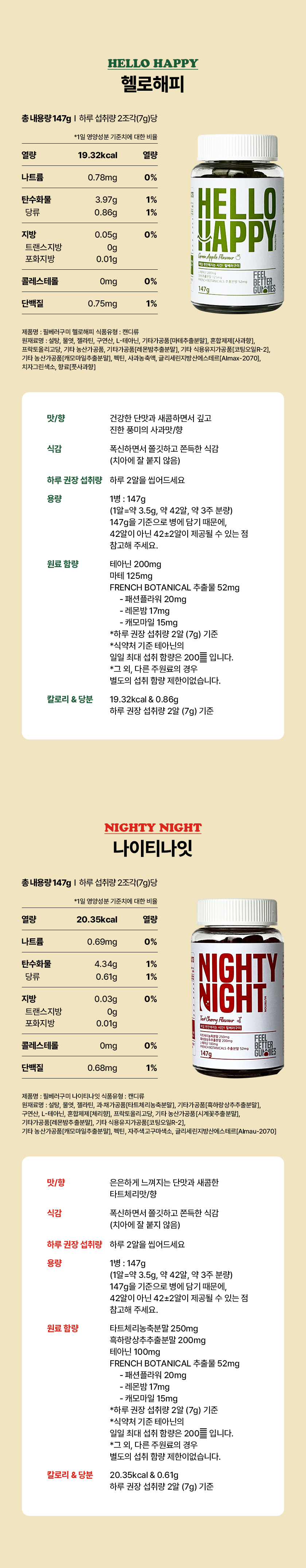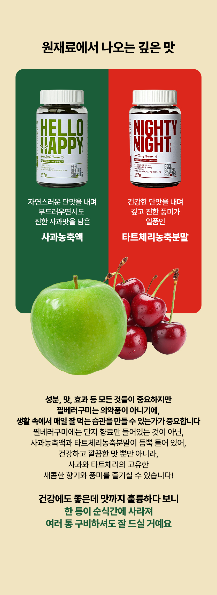 자연스러우면서 건강한 단맛을 내도록 헬로해피는 사과농축액, 나이티나잇은 타트체리농축분말을 사용했습니다. 2개 제품 모두 최적의 밸런스를 찾아 매일 먹고 싶어지는 건강한 단맛을 낸 게 특징으로, 더 맛있고 건강하게 드실 수 있습니다!!!❣️