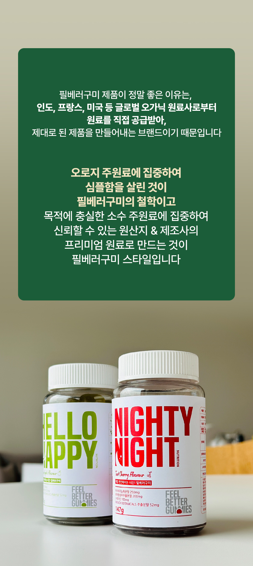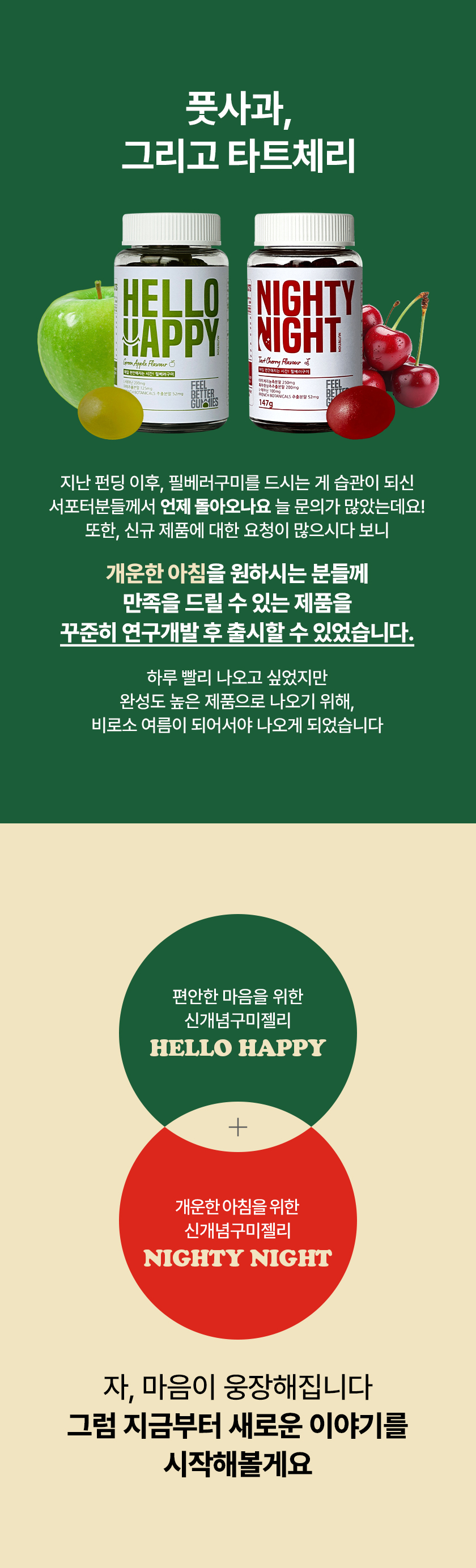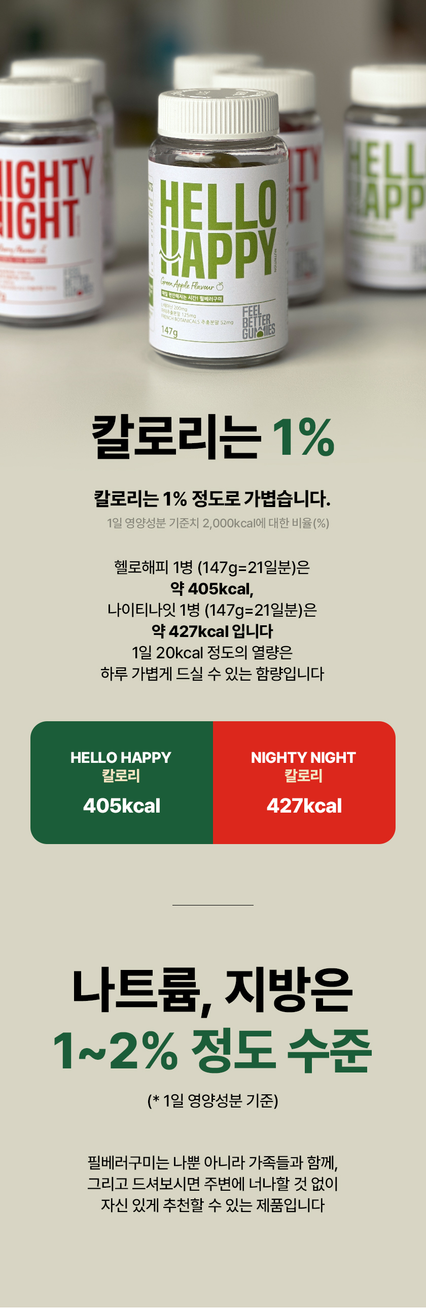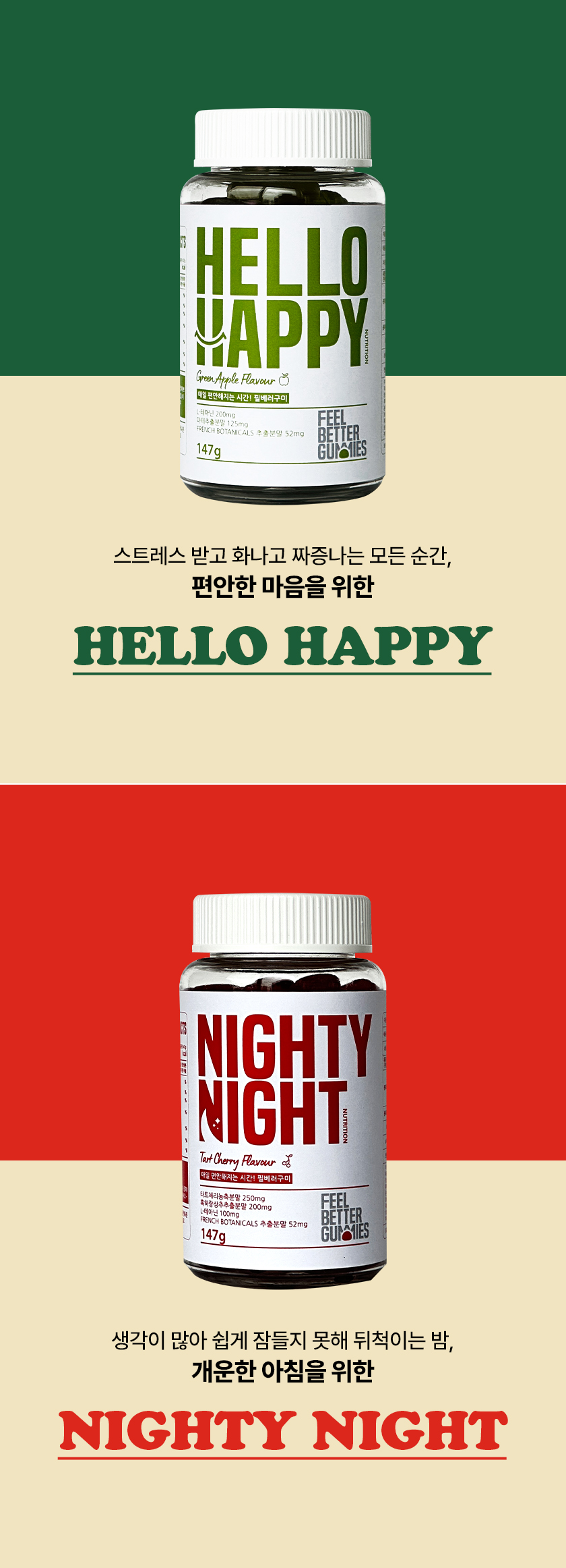 자연스러우면서 건강한 단맛을 내도록 헬로해피는 사과농축액, 나이티나잇은 타트체리농축분말을 사용했습니다. 2개 제품 모두 최적의 밸런스를 찾아 매일 먹고 싶어지는 건강한 단맛을 낸 게 특징으로, 더 맛있고 건강하게 드실 수 있습니다!!!❣️