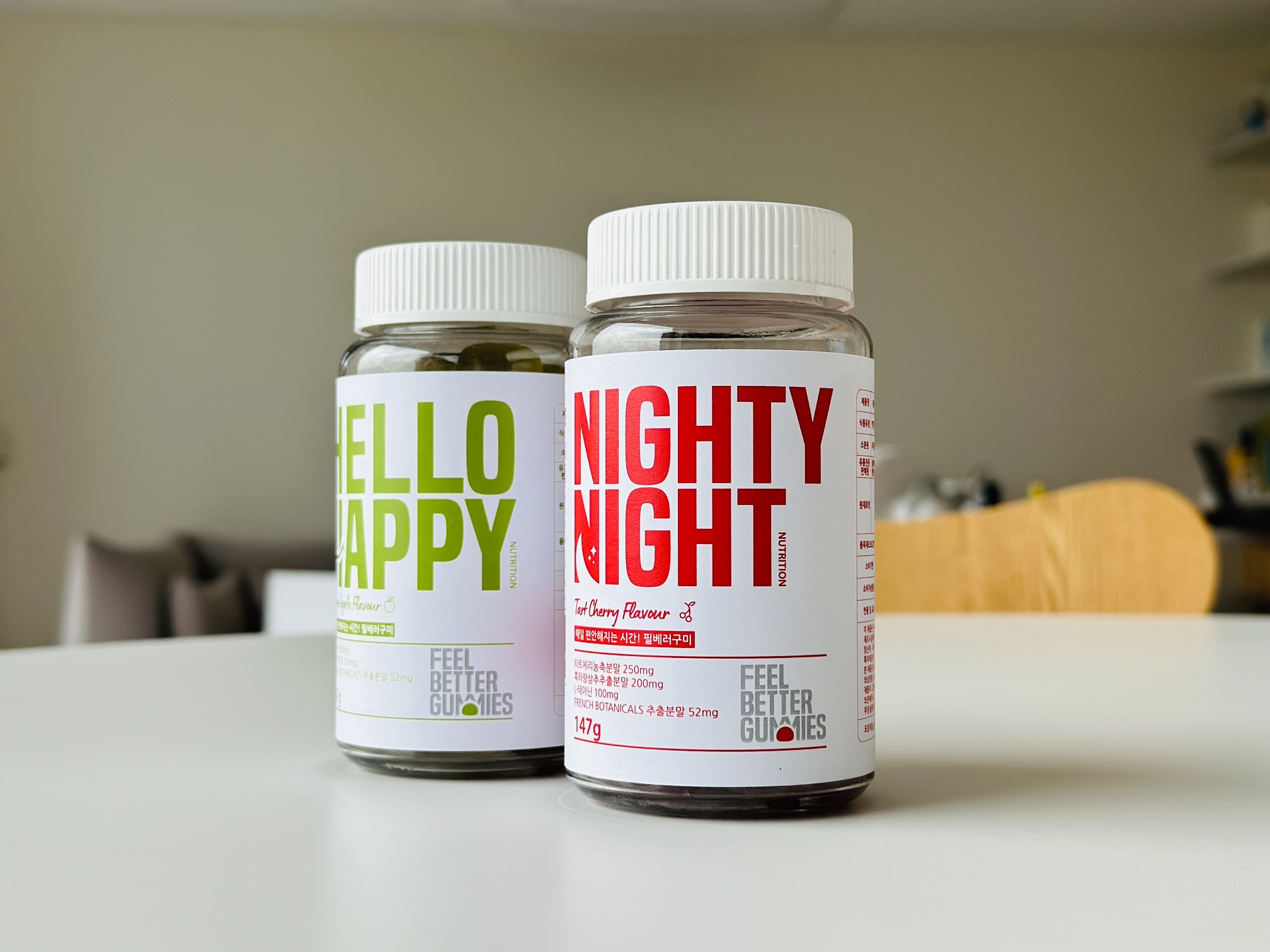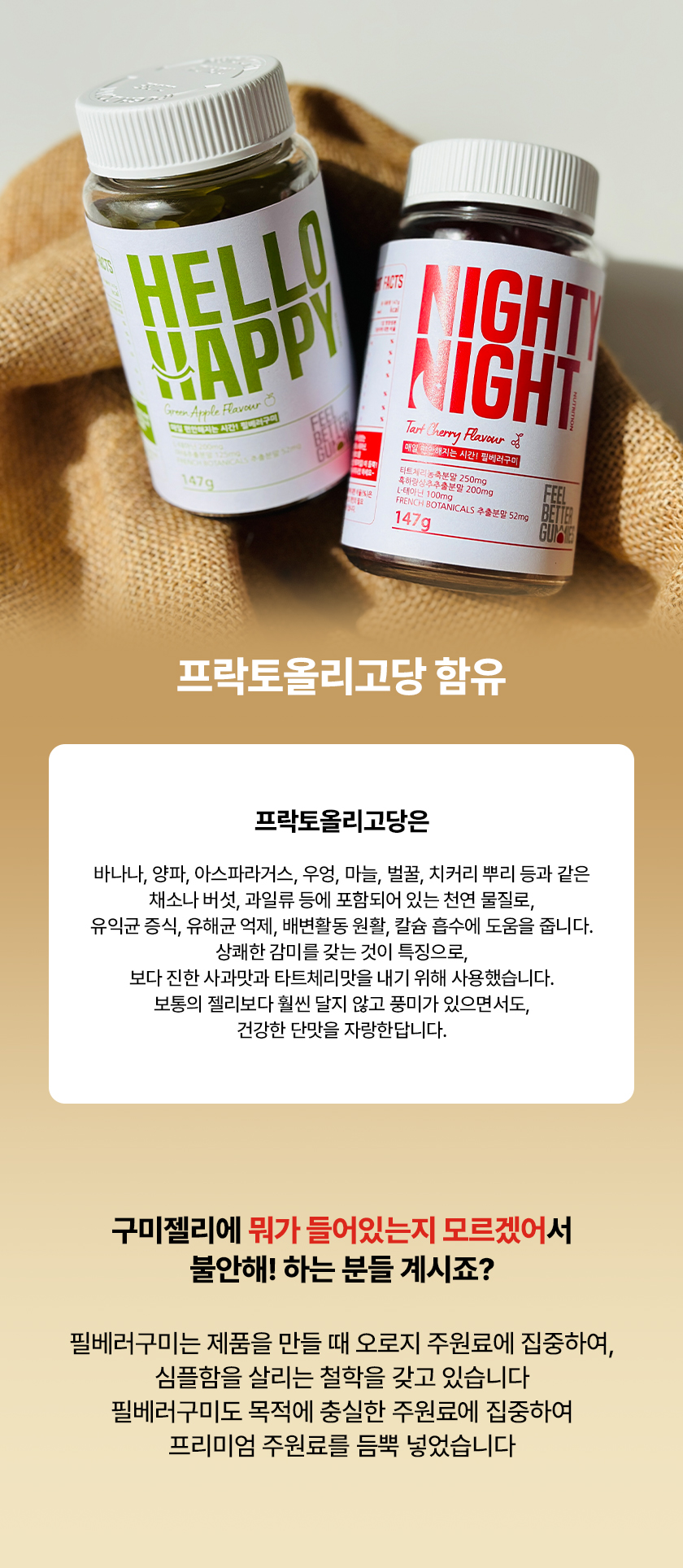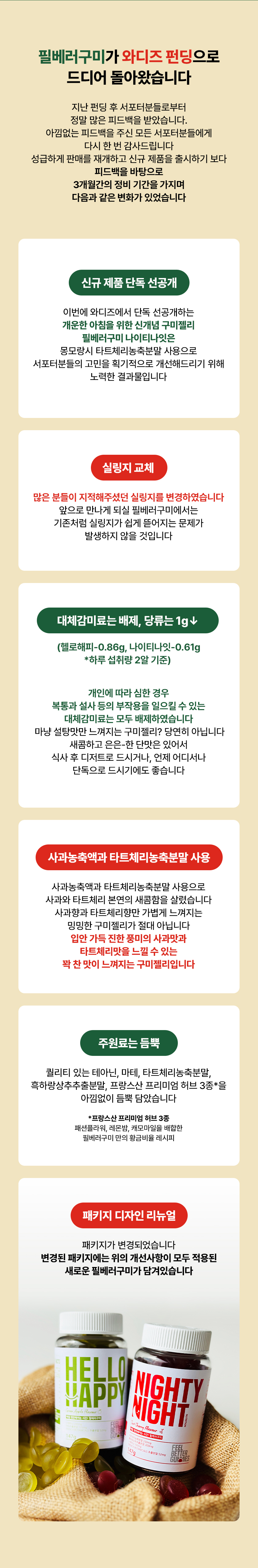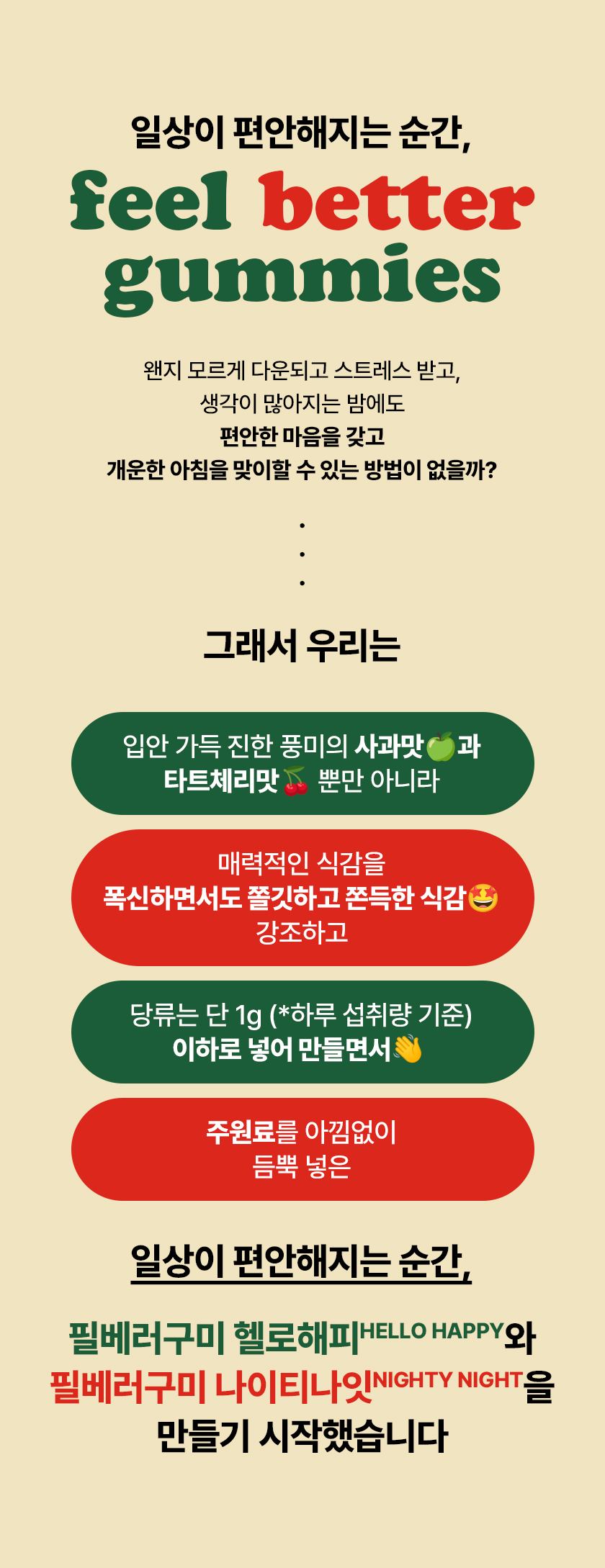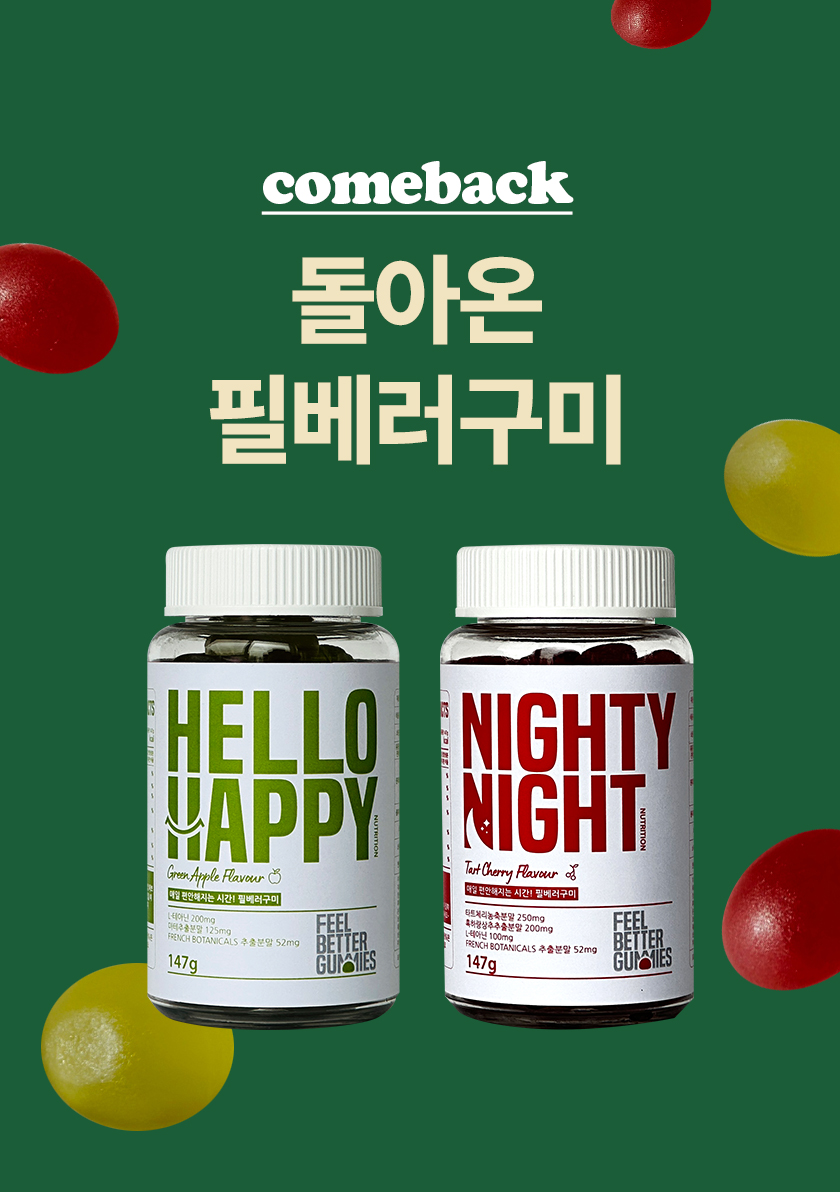 자연스러우면서 건강한 단맛을 내도록 헬로해피는 사과농축액, 나이티나잇은 타트체리농축분말을 사용했습니다. 2개 제품 모두 최적의 밸런스를 찾아 매일 먹고 싶어지는 건강한 단맛을 낸 게 특징으로, 더 맛있고 건강하게 드실 수 있습니다!!!❣️