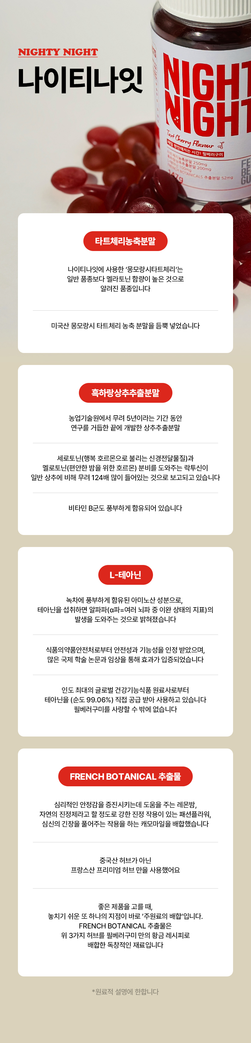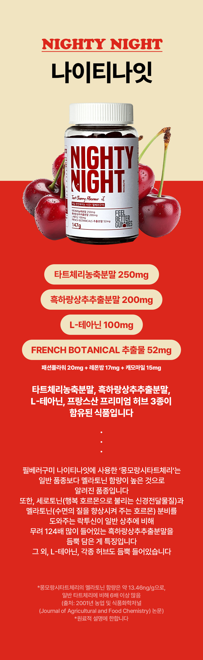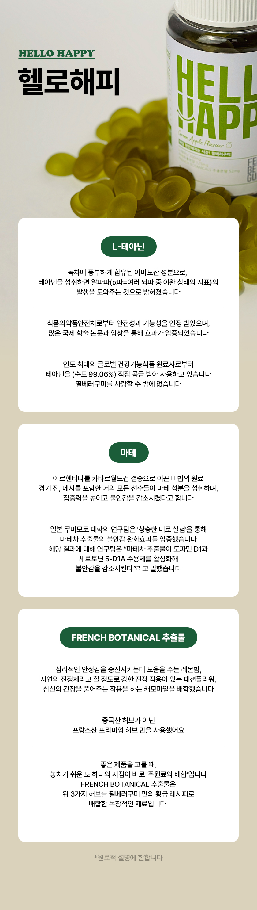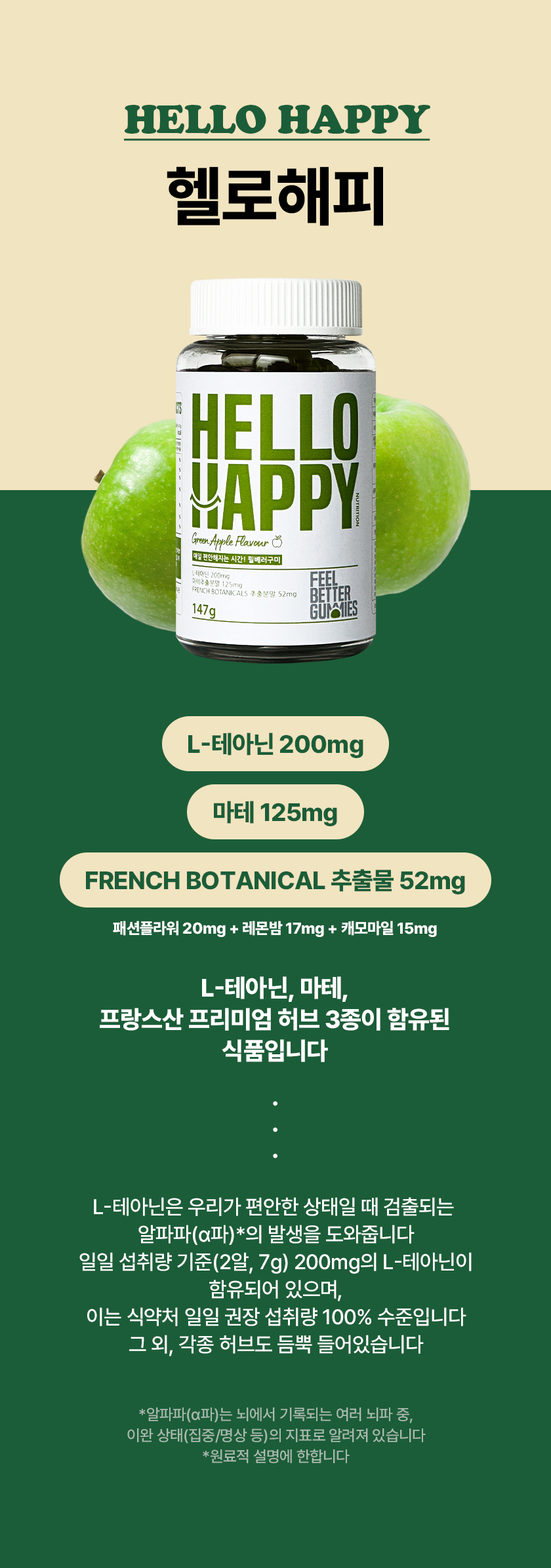 자연스러우면서 건강한 단맛을 내도록 헬로해피는 사과농축액, 나이티나잇은 타트체리농축분말을 사용했습니다. 2개 제품 모두 최적의 밸런스를 찾아 매일 먹고 싶어지는 건강한 단맛을 낸 게 특징으로, 더 맛있고 건강하게 드실 수 있습니다!!!❣️
