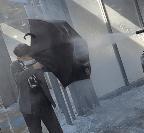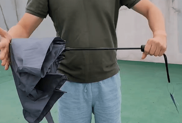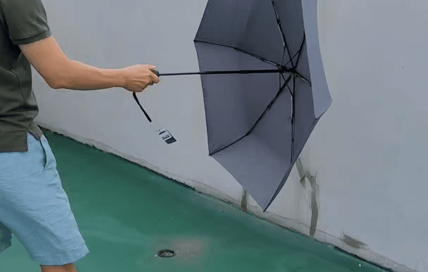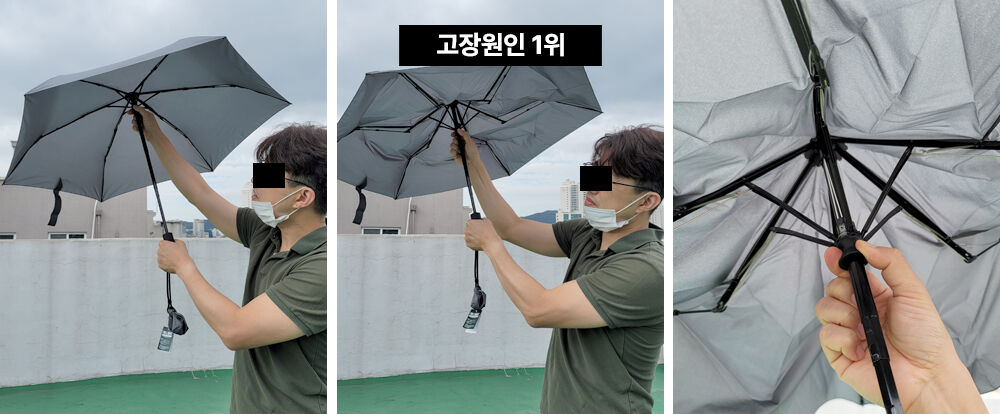 우산이 펼쳐진 상황에서 (자동접음 버튼을 누르지 않고) 손으로 접을 때, 이런 경우가 반복되면 우산 고장의 원인이 됩니다.