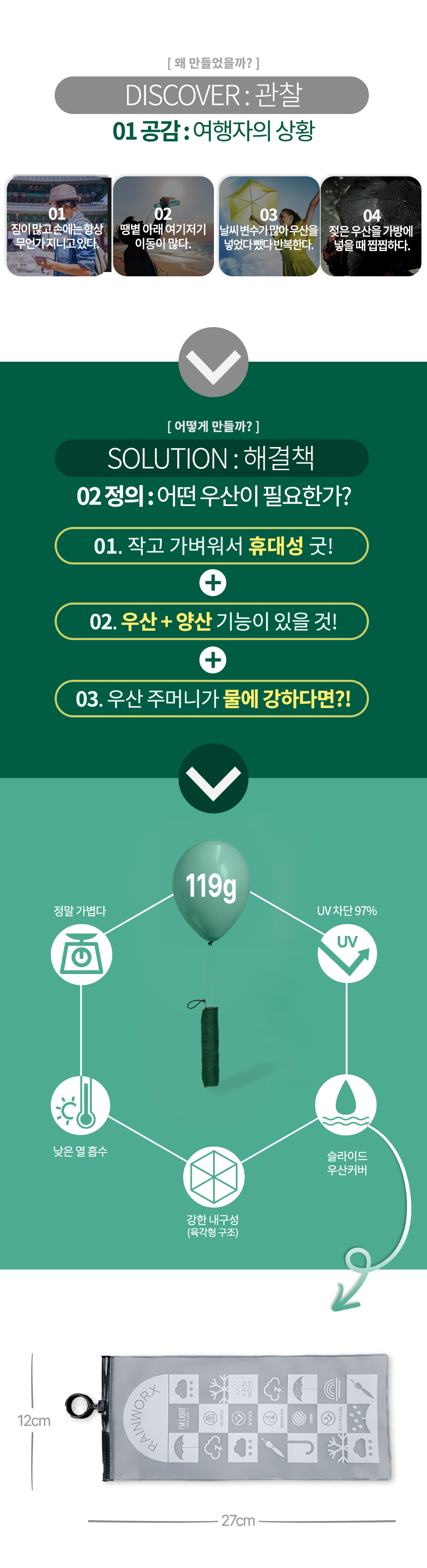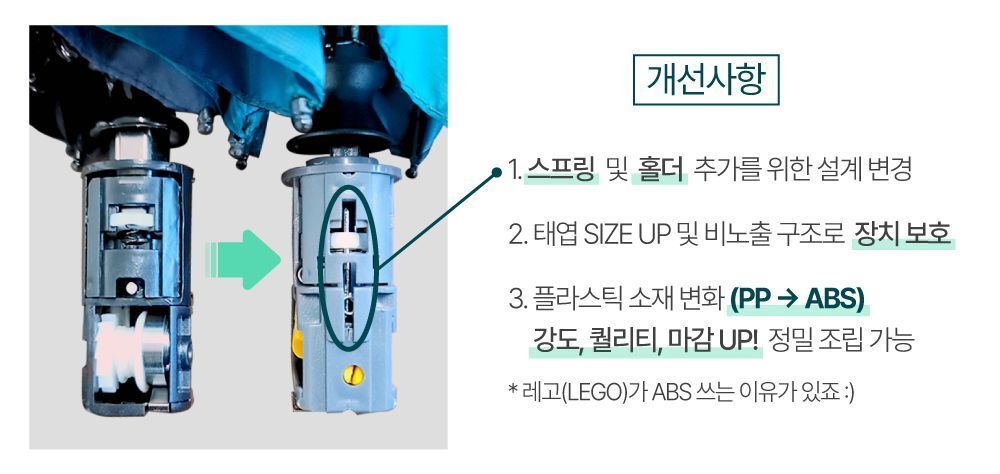 일반 제품보다 우위에 서게끔 합니다. 전문성을 지닌 만큼 그에 걸맞게 무게, 내구성, 사용 편의성 등 어느 것 하나 소홀히 할 수 없었습니다. 기존 시중에 나와 있는 자동 단우산(3단)보다 앞서갈 수 있도록 명확한 목표설정과 그것을 위한 재설계가 필요했습니다.