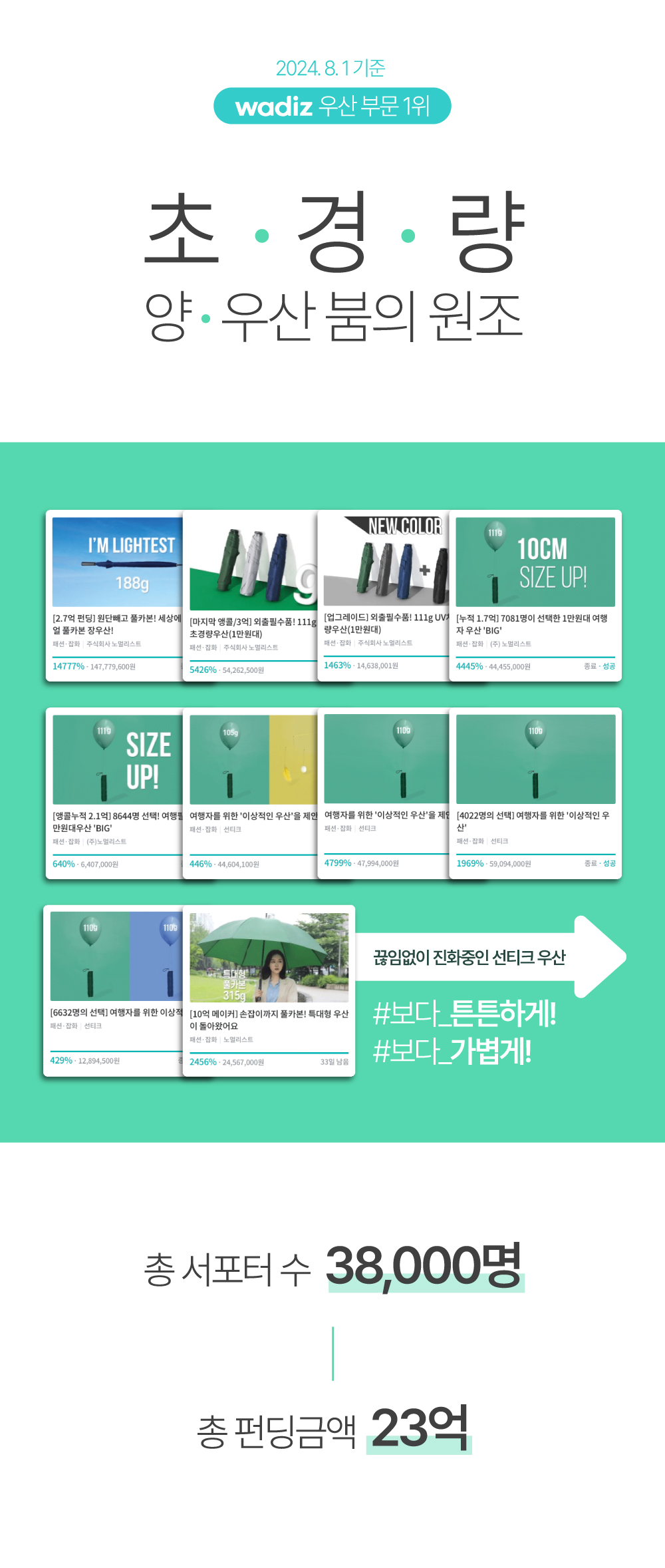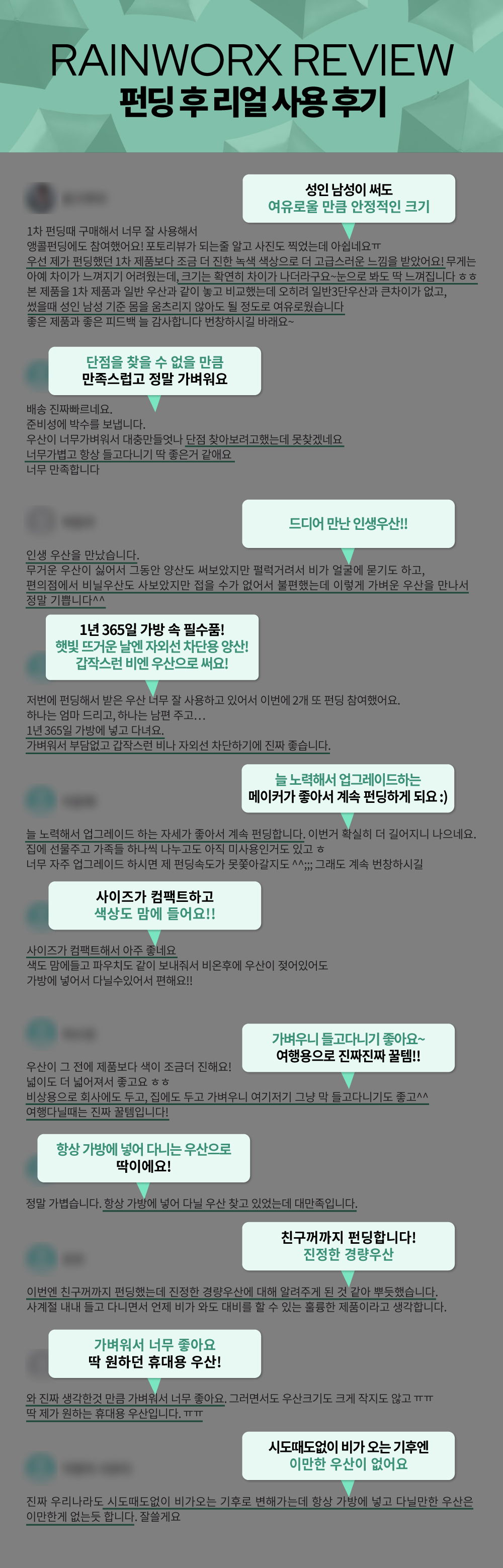 3년동안 초경량 우산을 제작하면서 타사의 제품을 지속적으로 모니터링 해오고 차별화에 힘써왔기 때문에 (국내는 물론) 글로벌 어떠한 3단우산과의 스펙 비교는 자신있습니다