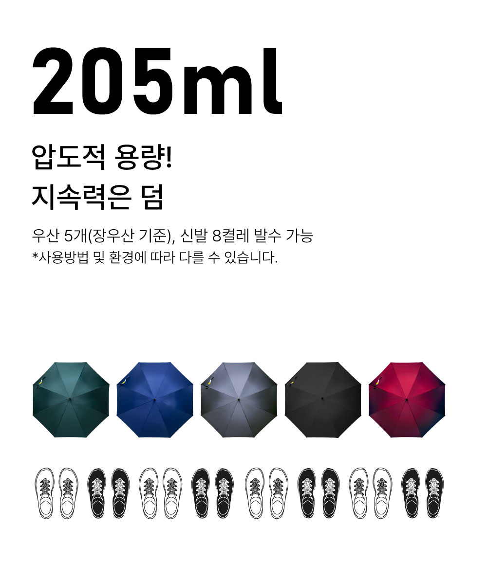 205ml 대용량으로 지름 120cm 우산기준(전체 도포) 5회 정도 사용가능합니다.