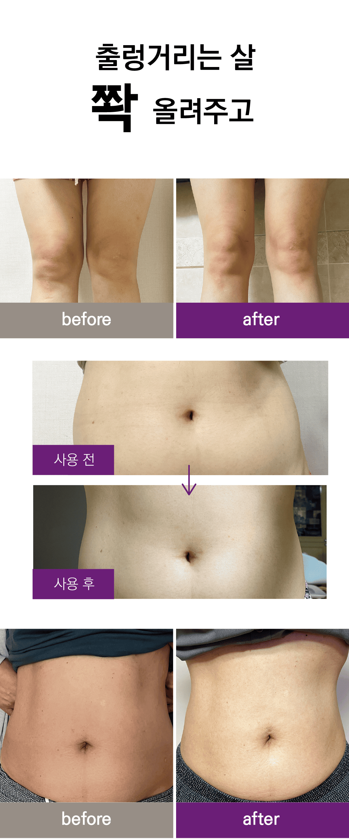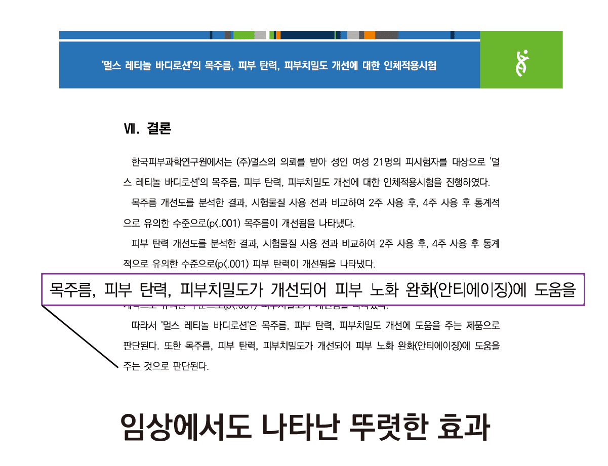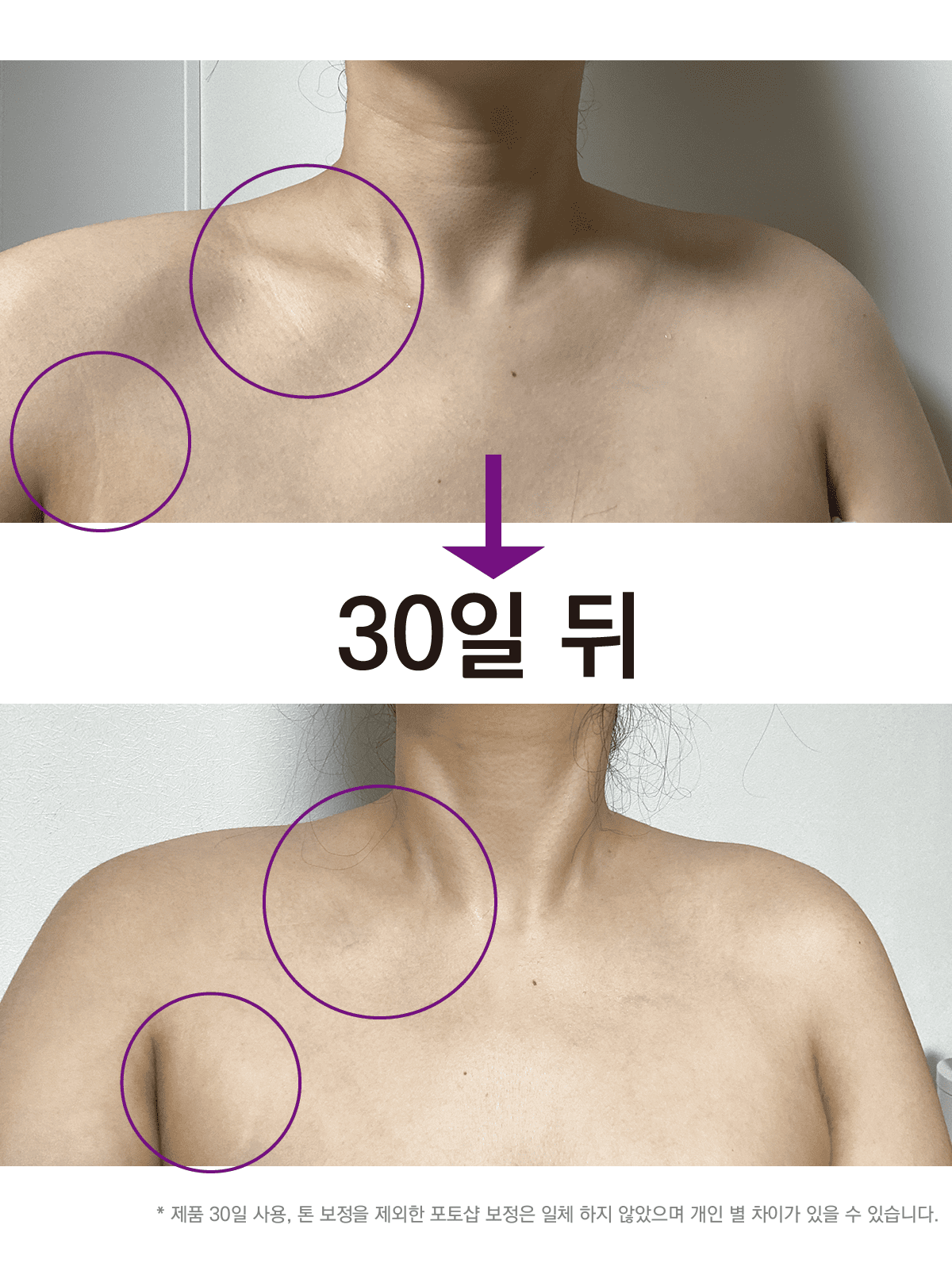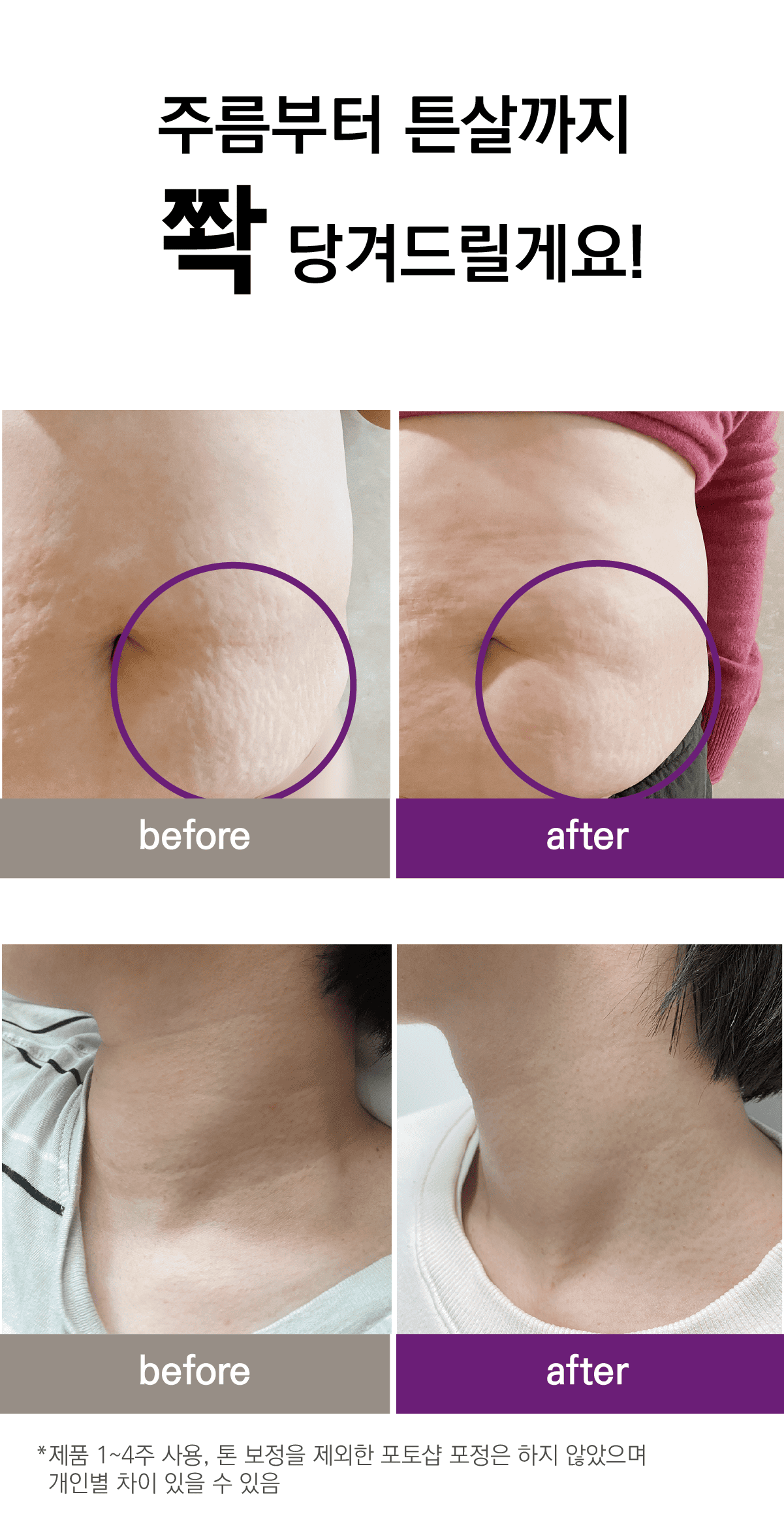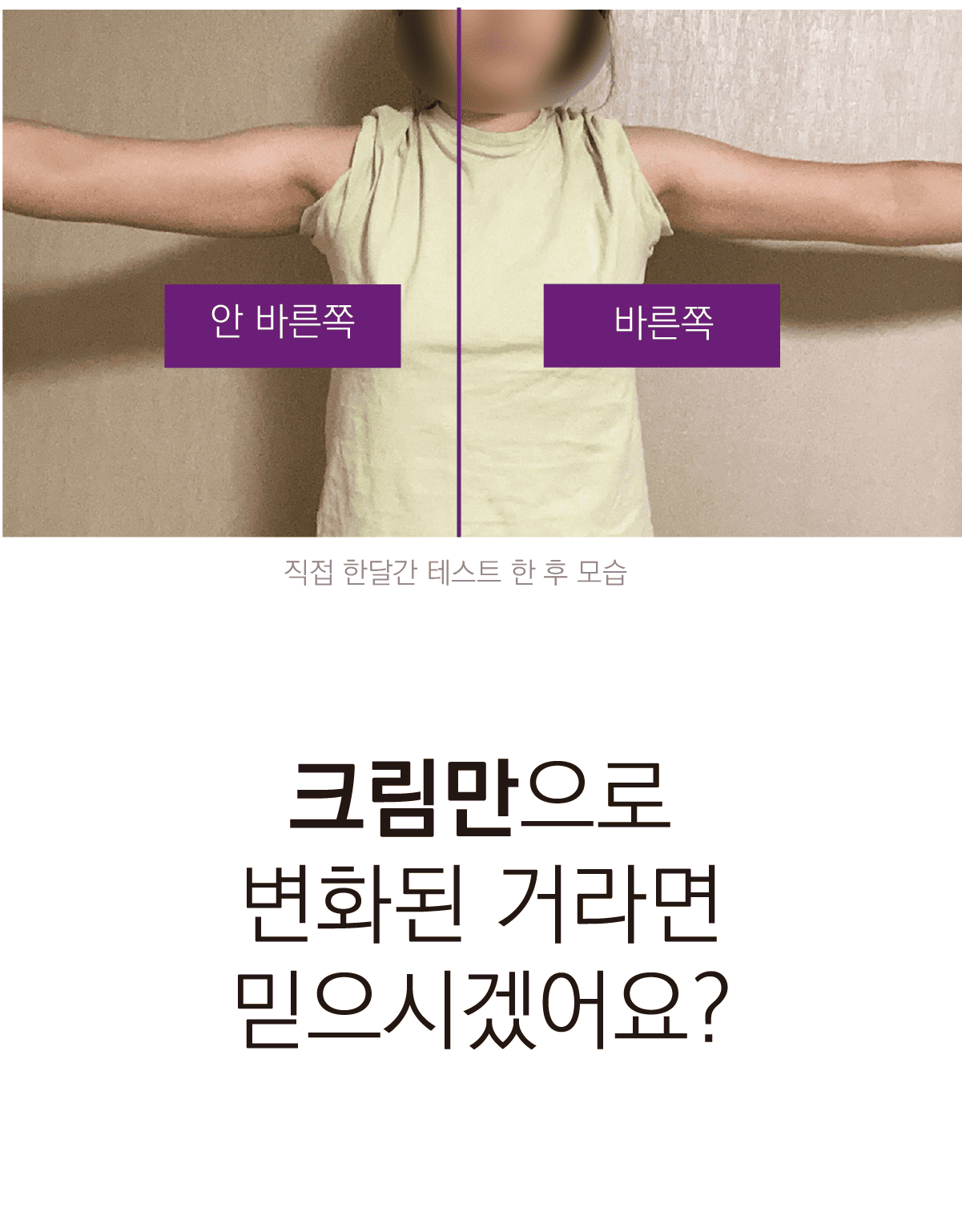 한 달간 꾸준히 발라보면서 눈에 띄게 달라지는 제 몸을 보면서 제품에 대한 확신을 얻었어요. 저 같은 고민을 하셨거나 미리 예방하려는 분들께 분명히 도움이 될거예요. 저 믿고 딱 4주만 한 쪽만 발라보시고 비교해 보세요. 자신 있습니다.