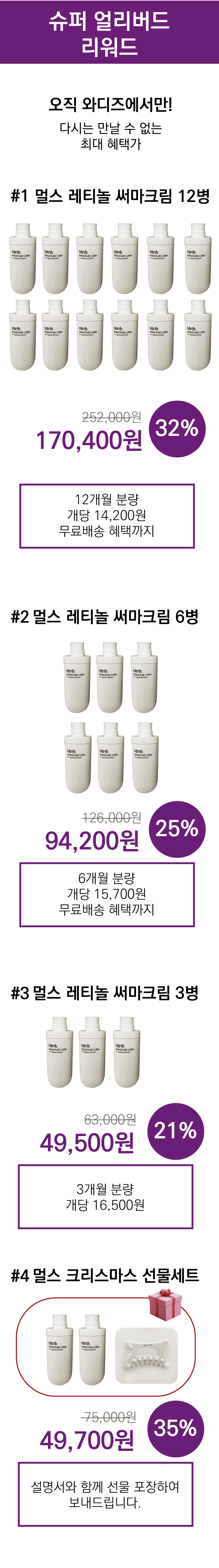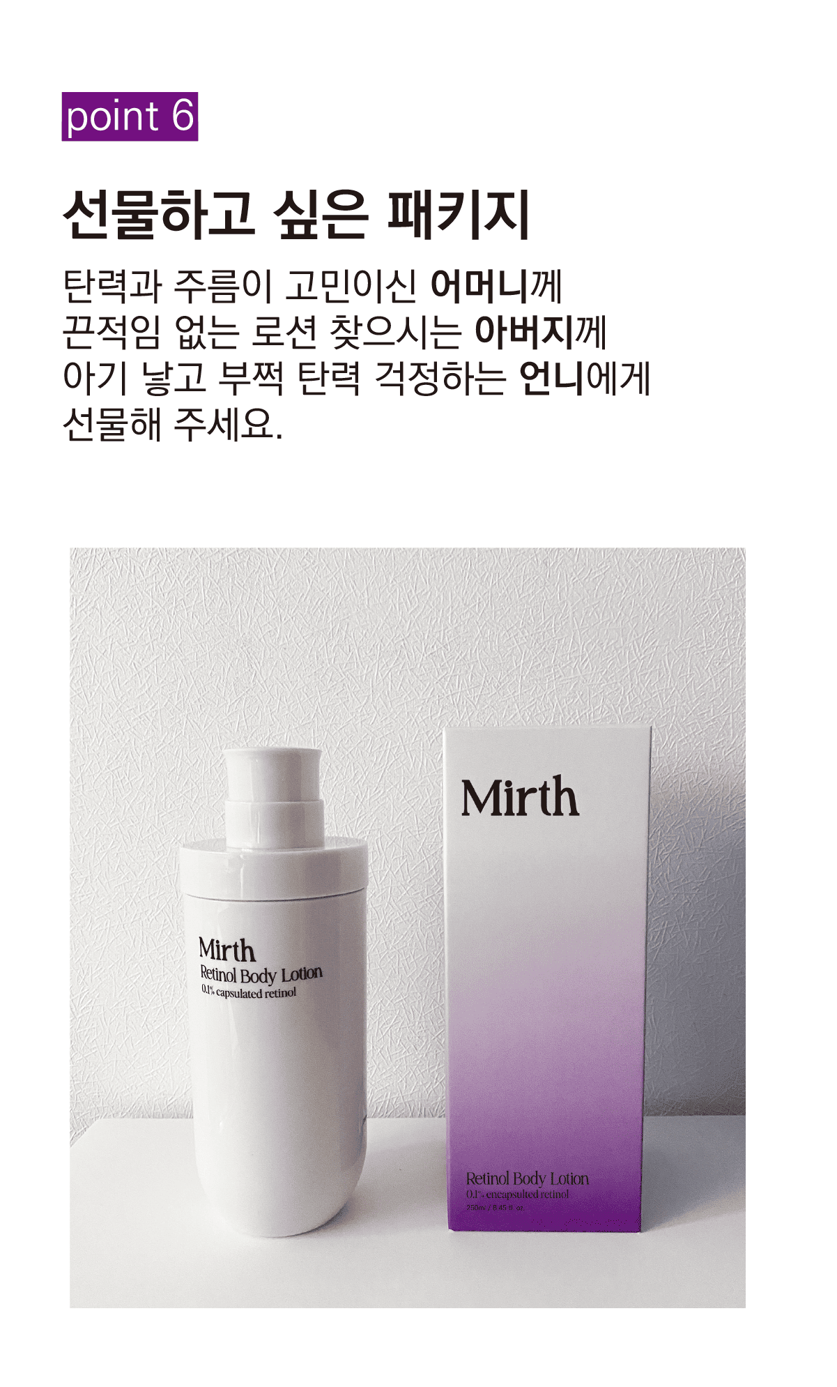 Mirth(멀스)는 '웃음이 나는 즐거움' 이란 뜻으로 소중한 것들을 더 오래 웃으며 즐기셨으면 하는 바람에서 시작되었습니다. 한국에 처음 선보이는 슬로우에이징 바디케어 브랜드를 만들기 위해 앞으로도 다양한 제품을 개발할 예정입니다.