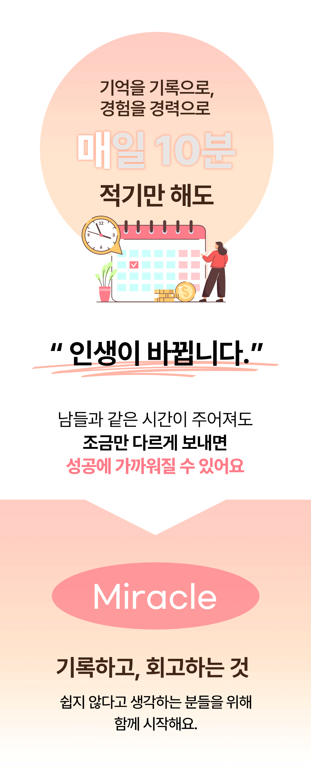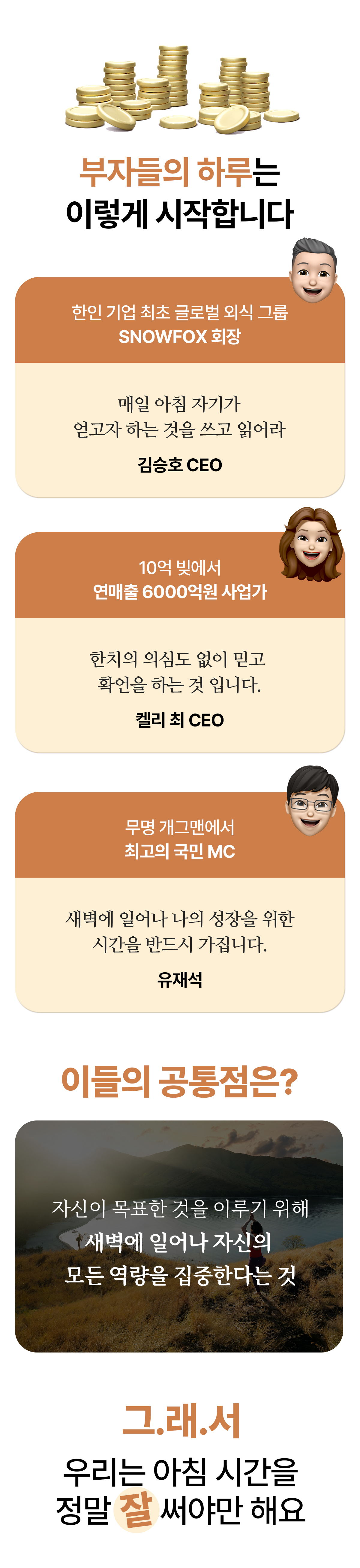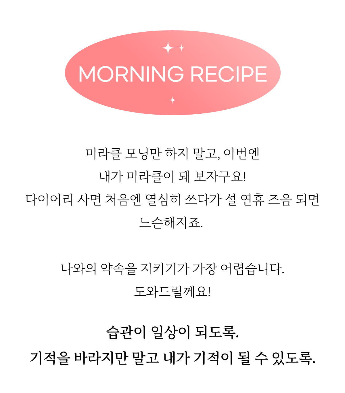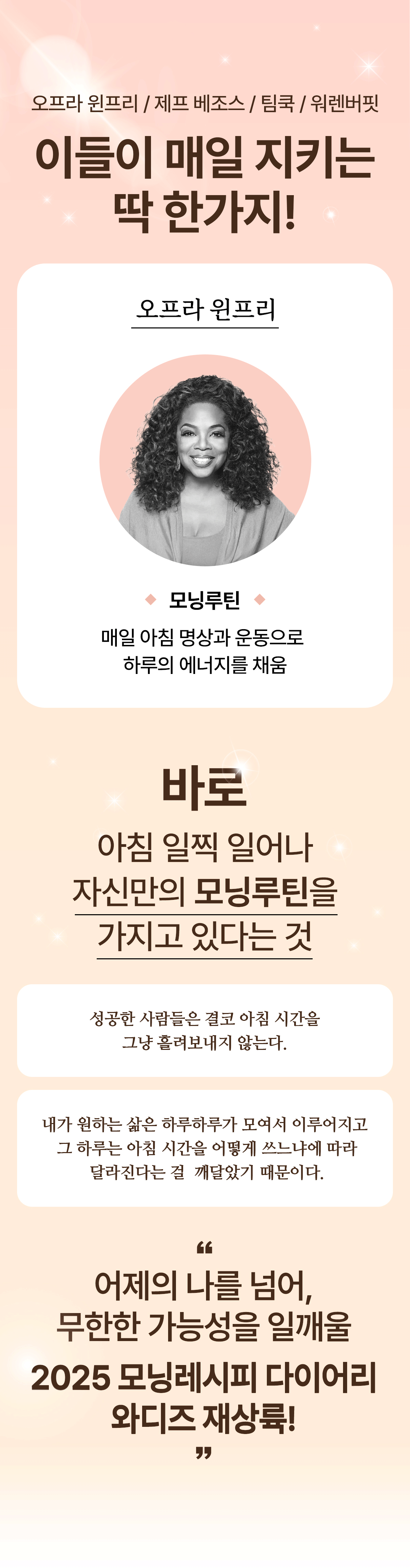 워렌버핏, 팀쿡 CEO 등 리더들의 성공 루틴을 담았어요. 하루 10분이면 충분해요. 내가 진정 내가 되고 기적이 되는 시간. 기적을 미루지 말아요! Be the Miracle