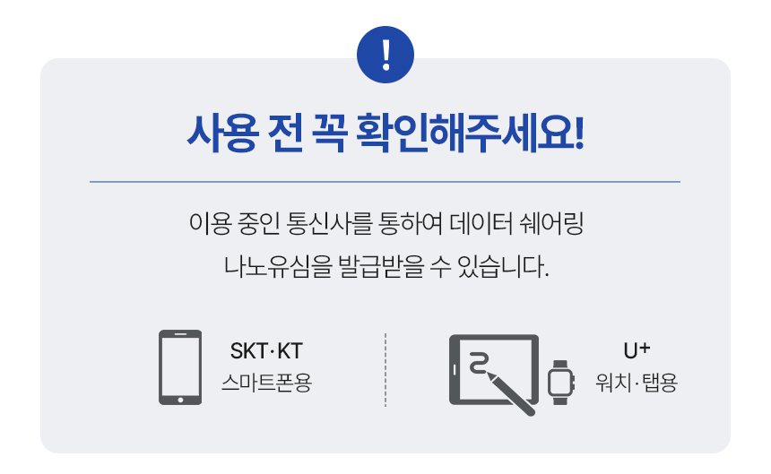 A. 본 기기는 나노 유심만 사용 가능하며 각 통신사에서 스마트폰용 데이터쉐어링 유심을 개통 후 사용 가능합니다.