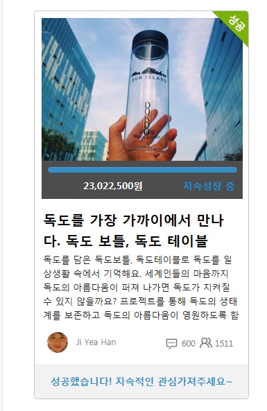 2014년 10월 25일 독도의 날을 맞이하여 진행한 크라우드펀딩에서 독보보틀, 독도테이블로 1511분에게 2300여만원의 펀딩을 성공하였습니다.