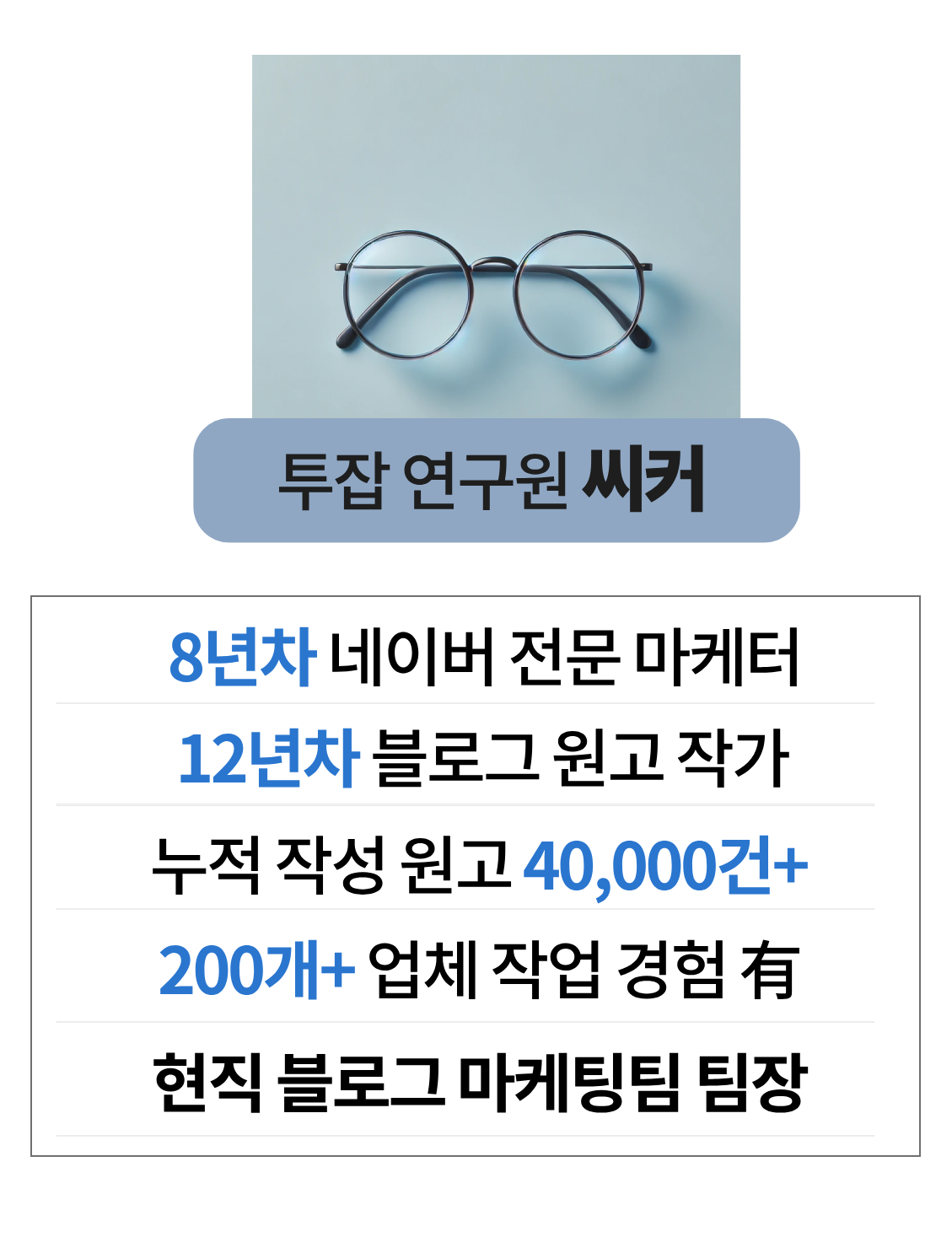 위에서 소개드린 대로 전 12년차 원고 작가이자 8년차 마케터(팀장)로 일하고 있습니다.