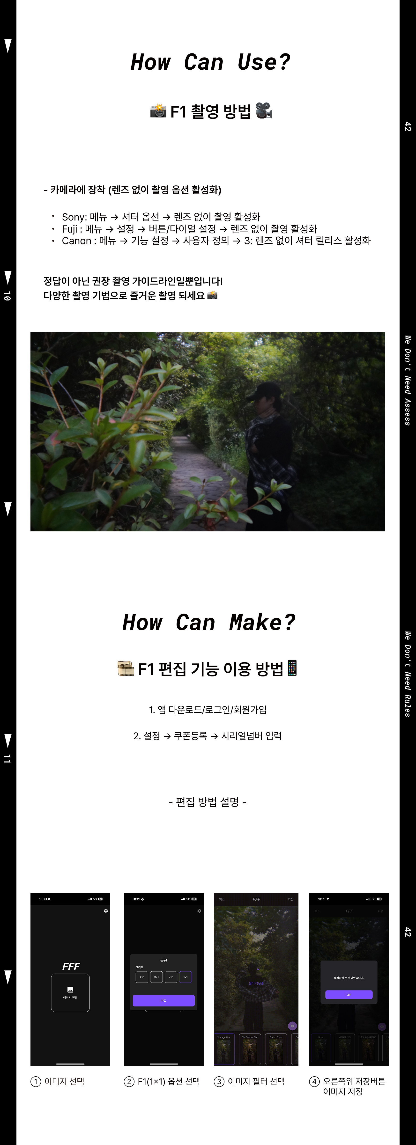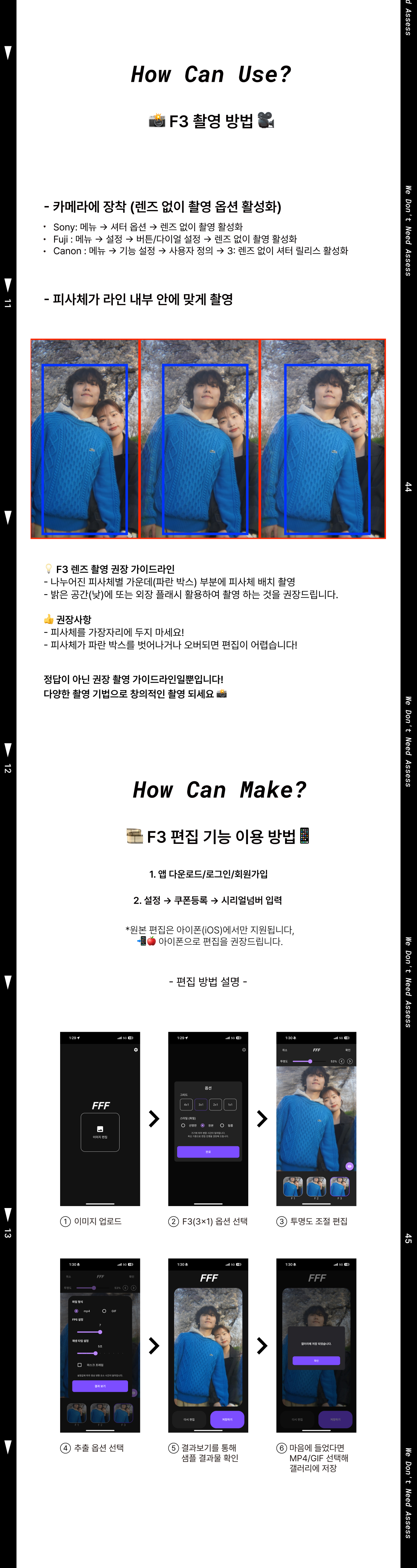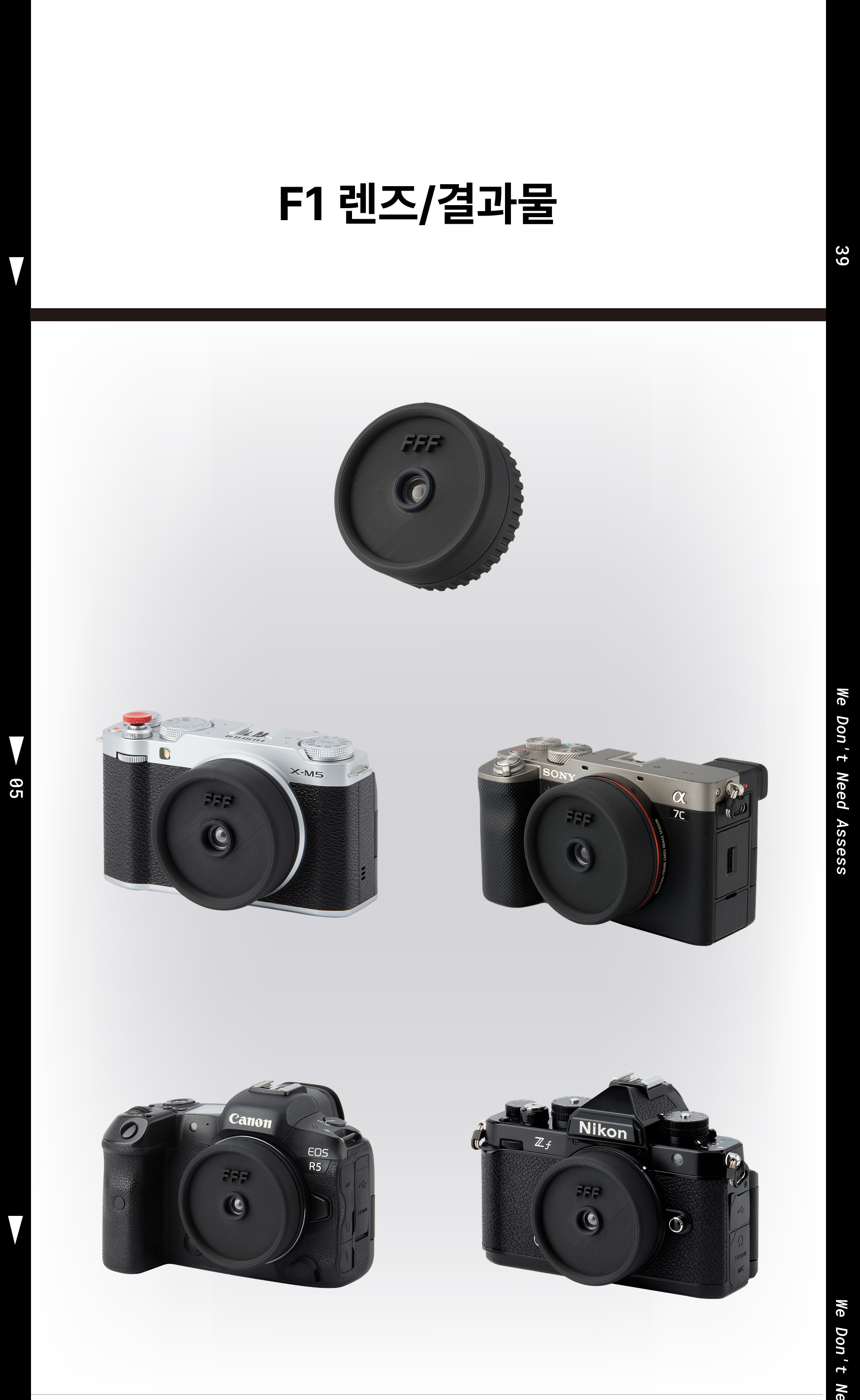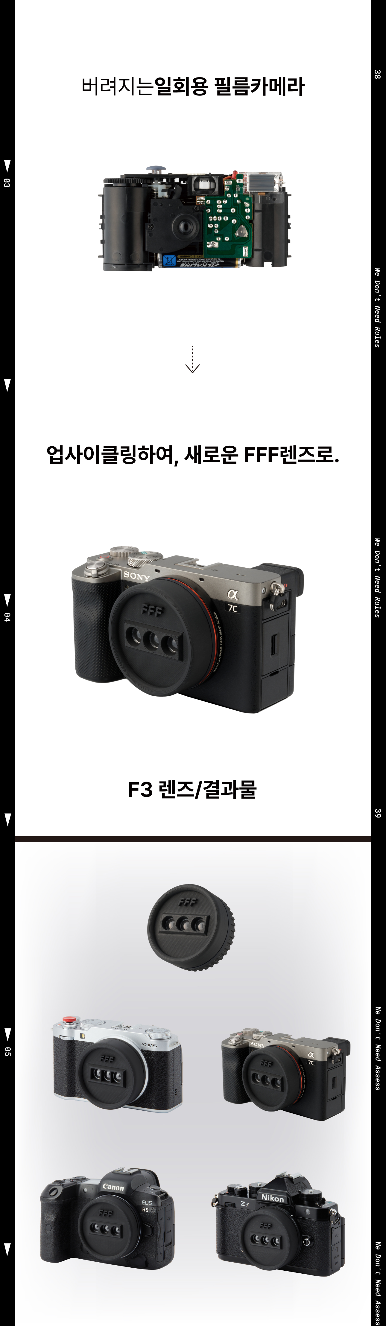 필름카메라와 빈티지 콘텐츠(사진)의 유행으로 일회용필름카메라에 대한 수요가 많아졌습니다. 일회용필름카메라는 말 그대로 한번 사용 후 현상소에서 폐기가 되는데요. 폐기된 일회용필름카메라를 재활용 할 수 있는 방법으로 3D 프린터와 폐기된 일회용필름카메라를 활용한 FFF 만의 독자적인 새로운 구조 설계하여 FFF 렌즈를 개발하게 되었습니다. 기존의 콘텐츠를 제작하기 위해서는 타사의 전용 필름카메라로 진행이 가능했습니다. 하지만 필름카메라 특성상 현상과 편집(포토샵) 과정이 필요해 많은 시간요구와 높은 진입장벽이 있었고, 때문에 기존 콘텐츠가 상용화 되지 못했다고 판단했습니다. 이러한 문제점들을 우리의 FFF 렌즈를 디지털카메라에 장착하는 프로세스로 인화과정을 생략하고, 우리의 FFF 앱을 통해 손쉽고 빠르게 결과물 편집이 가능해졌습니다. FFF 팀은 누구나 손쉽게 FFF 콘텐츠를 촬영하고 제작이 가능하도록 하여 FFF 콘텐츠를 상용화 시키고자 합니다.