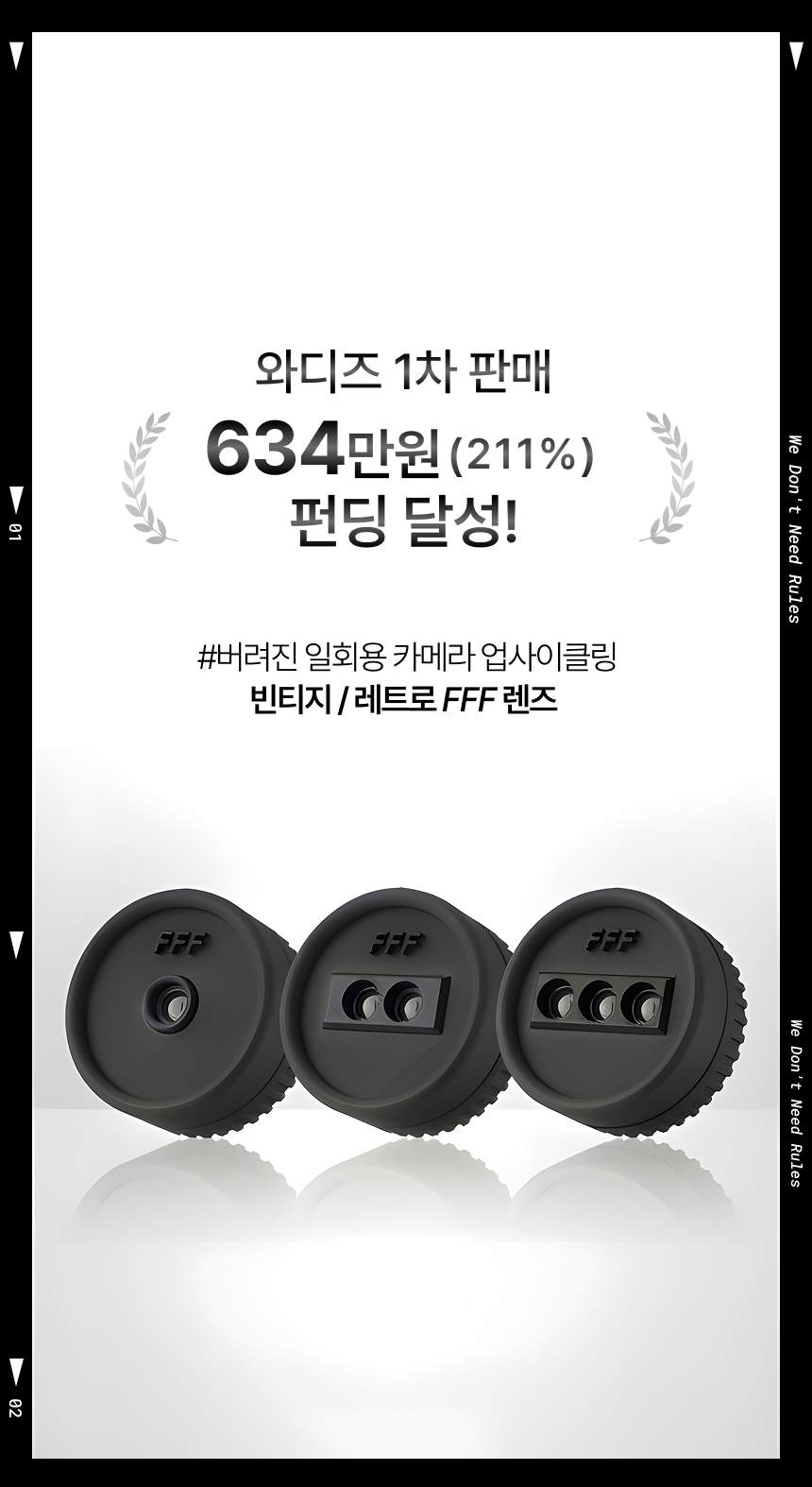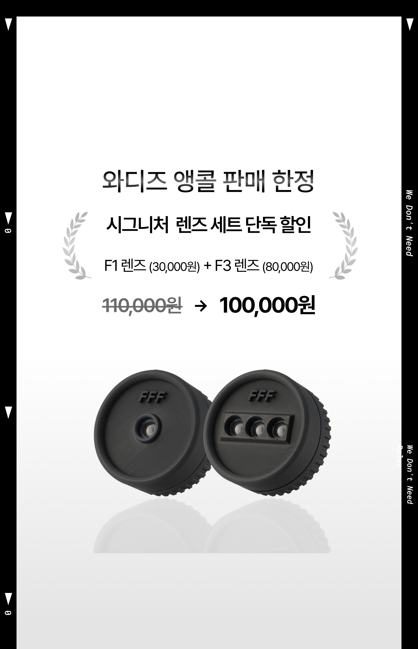 이번 2차 앵콜 펀딩에서는 FFF의 대표 감성을 담은 시그니처 세트(F1+F3 렌즈)를 와디즈에서만 단독 할인으로 선보입니다. 다시 한 번 여러분의 뜨거운 응원을 기다리겠습니다!
