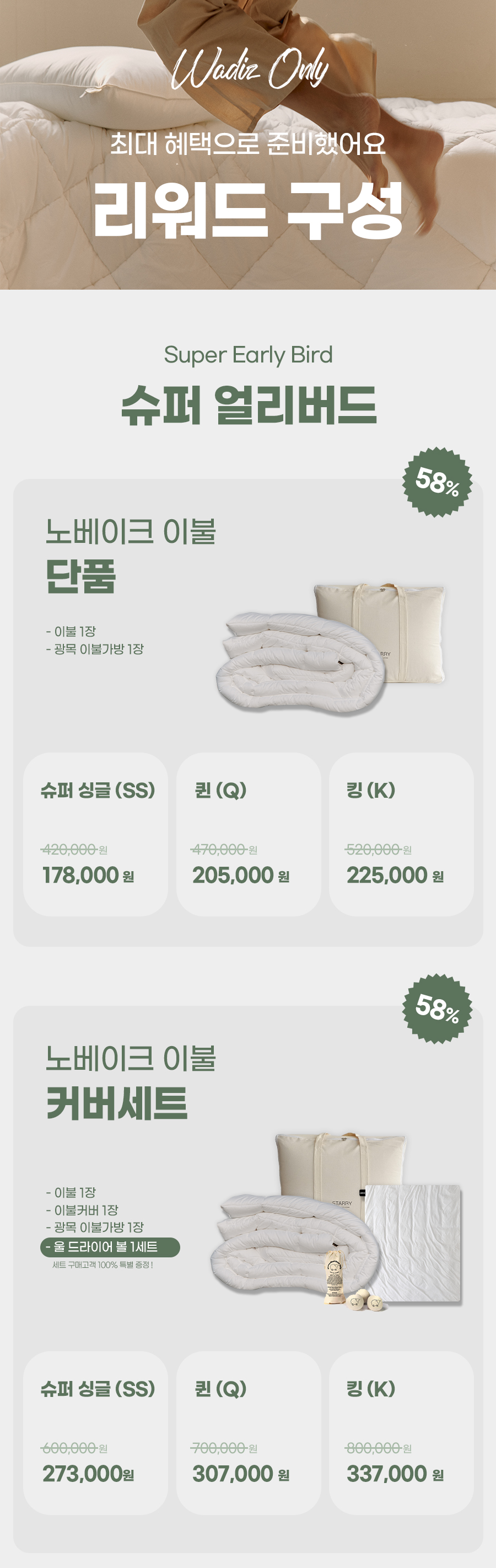 우리 제품의 큰 장점과 차별화는 한 마디의 임팩트있는 단어로 설명하기 힘들었어요. 이불을 만드는 방법과 그로 인해 얻을 수 있는 더 높은 보온력, 더 많은 포근함은 직접 느껴야 알 수 있는 것들이기 때문이에요. 인터넷 쇼핑몰은 직접 만져볼 수 없고, 사진과 글로 장황하게 설명하기엔 고객님들은 너무 바빠 우리의 기술과 설명을 들어주지 않았어요. 그러던 중, 와디즈 펀딩을 알게되었고, 와디즈야말로 우리와 가장 어울리는 곳이라고 느꼈어요. 와디즈의 서포터님들은 오히려 더 자세히 알고싶어하고 우리의 기술과 제품의 장점을 풀어 설명해드려야만 하는 곳이기 때문이에요.