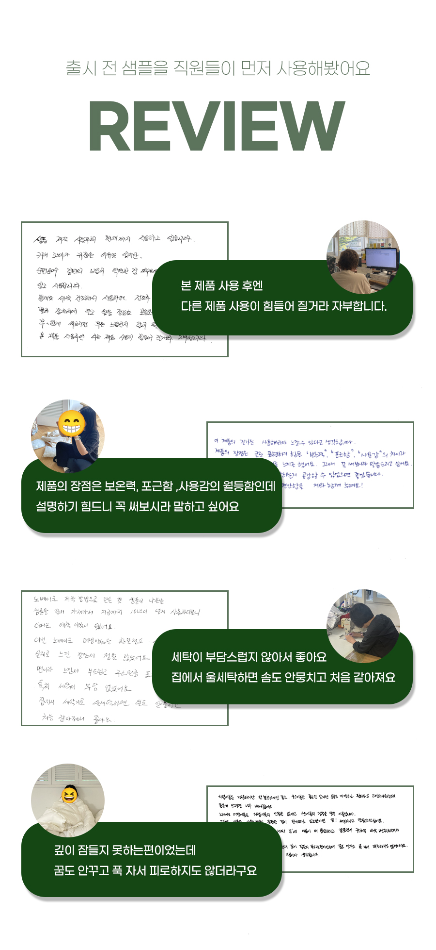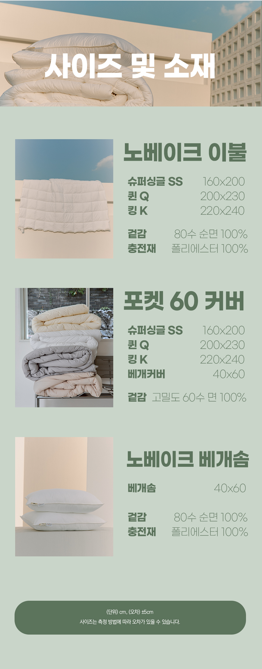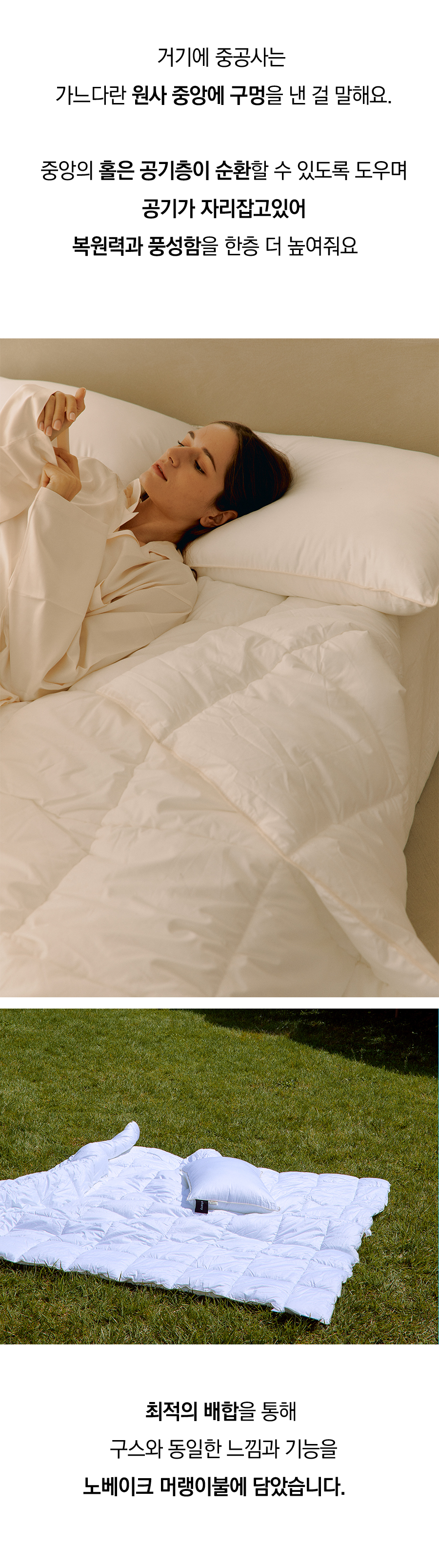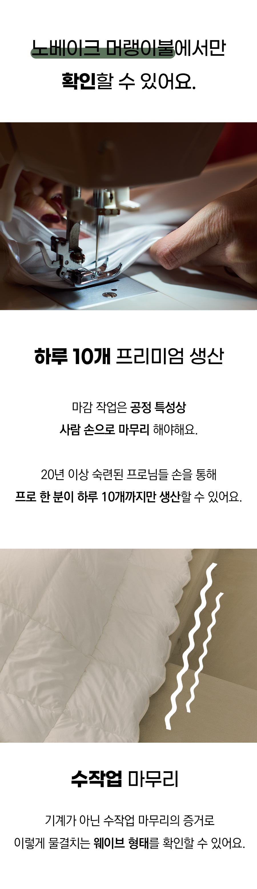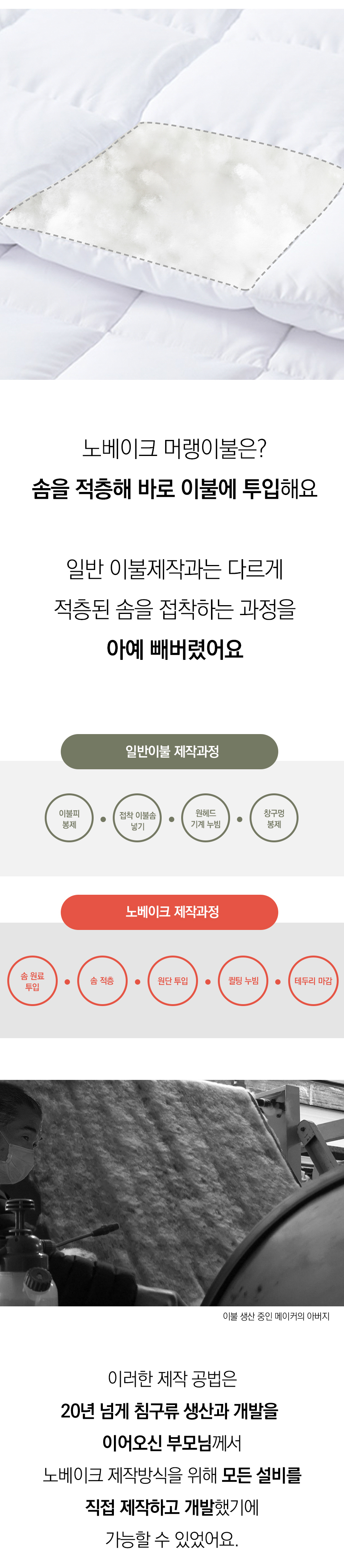 베개, 이불, 요(토퍼), 쿠션, 커버류와 각종 패브릭 제품들까지 도전하지 않은 품목이 없습니다. 이 모든 추진력과 실행력은 공장을 직접 곁에 두고 있기에 가능했죠. 20년이 넘도록 매년 꾸준히 새로운 제품을 선보일 수 있도록 연구를 게을리하지 않았어요. 지금까지의 개발 과정에서 느꼈던 깊은 고민과 해결되지않았던 문제들을 이번 노베이크 이불로서 완성할 수 있었다고 생각합니다.