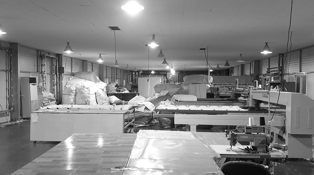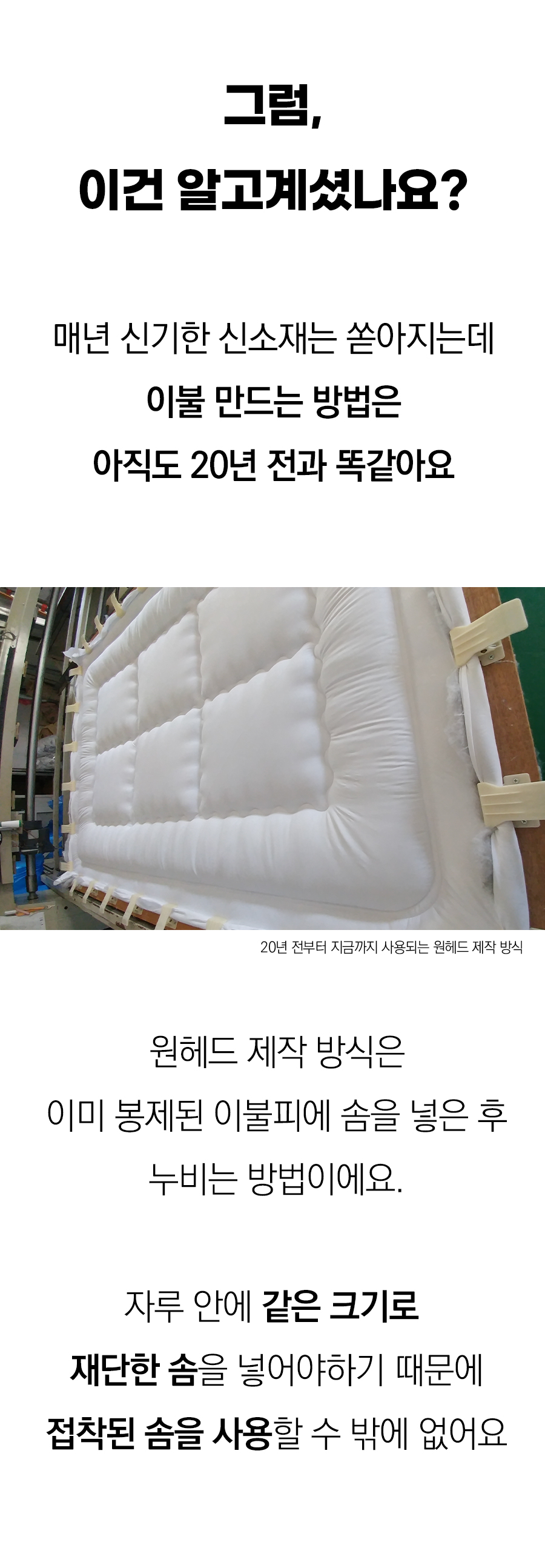 일반적으로 이불을 만드는 과정은 솜 공장에서 이불을 사고, 봉제공장에서 이불피를 만든 다음, 이불피에 사온 솜을 넣고 원헤드 기계에서 누빈 후 봉제로 마무리해서 완성합니다. 즉, 솜 공장과 원단공장, 봉제공장 이 3개의 공장이 필요한 거였어요. 솜공장은 이불솜만 제작하는게 아니라 다양한 분양에서 사용되는 솜을 가공하기 때문에 이불솜 용의 솜은 한정적일 수 밖에 없고, 봉제 공장으로의 운반을 위해서도 어느정도 솜이 고정되어야할 수 밖에 없었어요. 그래서 이불에 딱 맞는, 내가 원하는 느낌의 솜으로 만들고 개발하는데에 한계가 있을 수 밖에 없다는걸 알게됐죠.