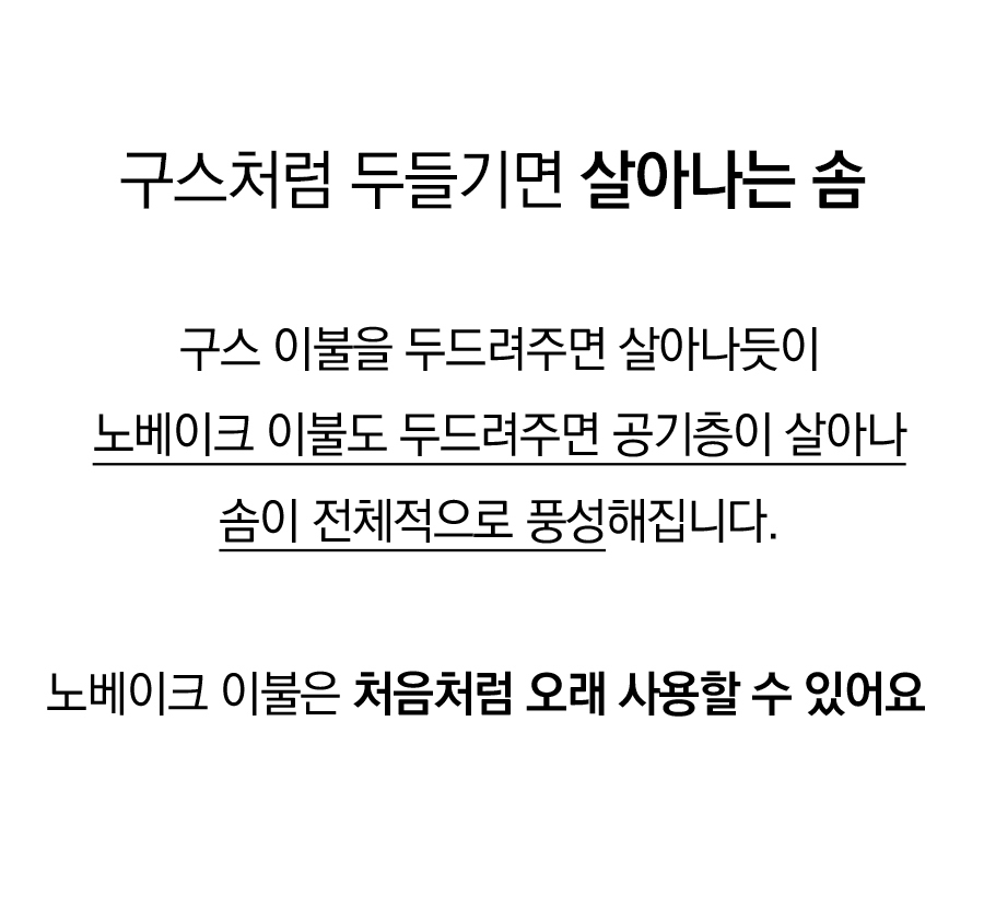 - 사용하면서 살살 고루 두들겨 솜을 살려주시면 더욱 포근하게 사용 가능합니다.