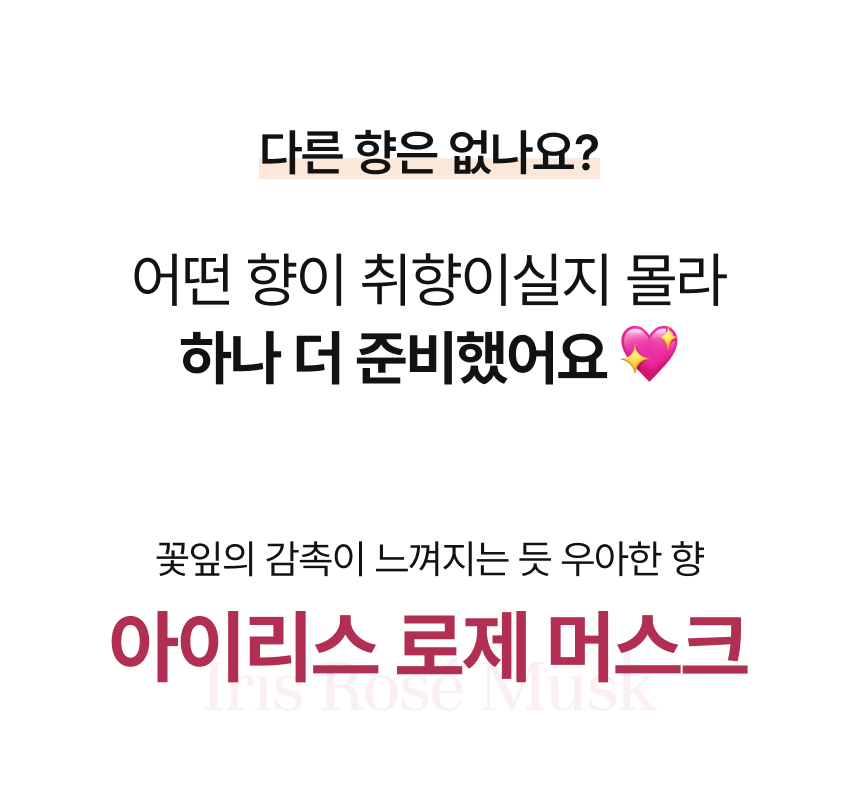 하늘 아래 같은 향은 없듯이 전문 조향사와 협업하여 고급스러게 향 노트를 쌓아 특별한 앰버 바닐라향을 완성했답니다! 색다르고 우아하면서 부드러운 향으로 서포터님들의 취향저격에 도전!