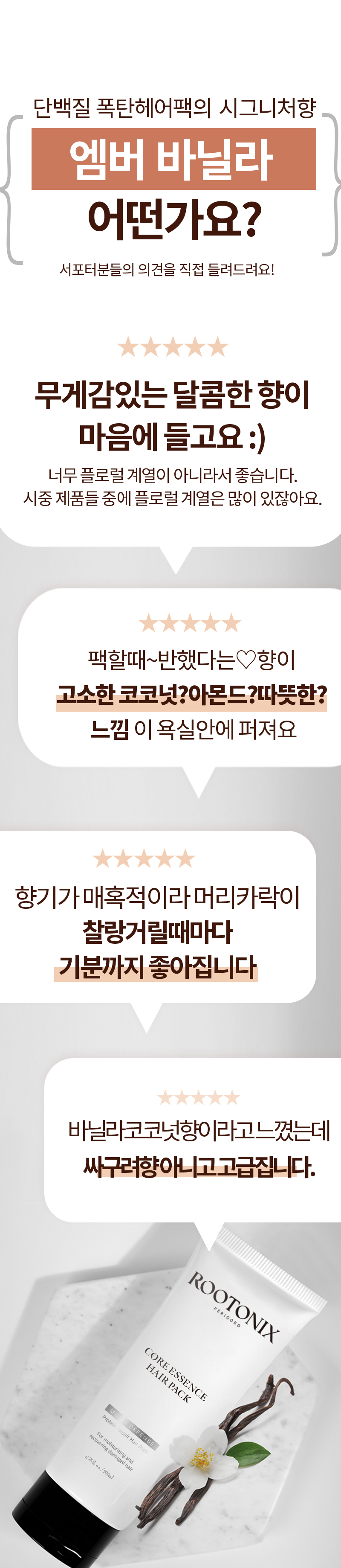 단백질 코어 헤어팩은 시중의 흔한 장미, 라벤더와 같은 꽃향과 차별을 두었어요.