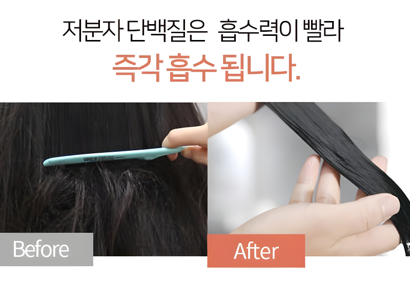 분자 크기는 일반 단백질의 1/10, 흡수력은 2배인 저분자 단백질로 모발에 단백질 강력 흡착!