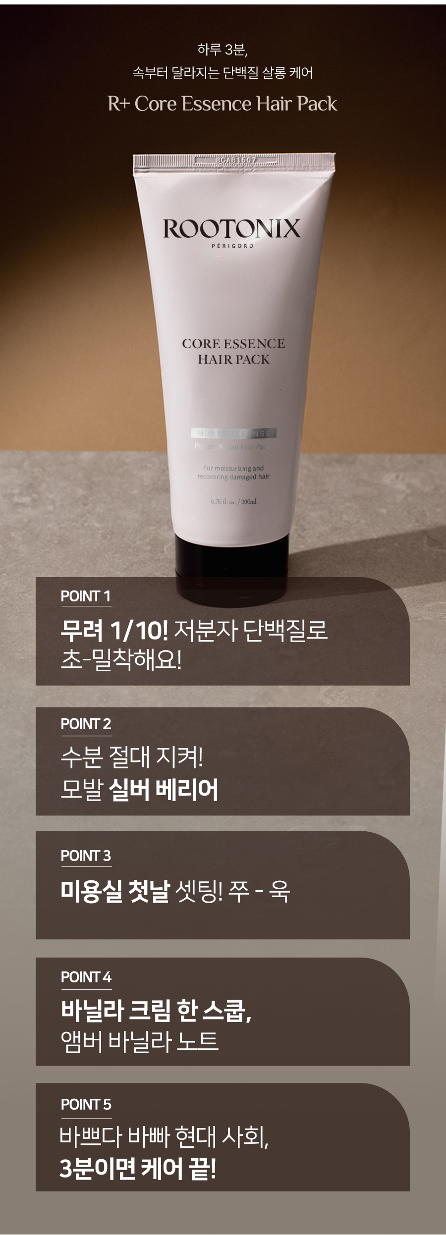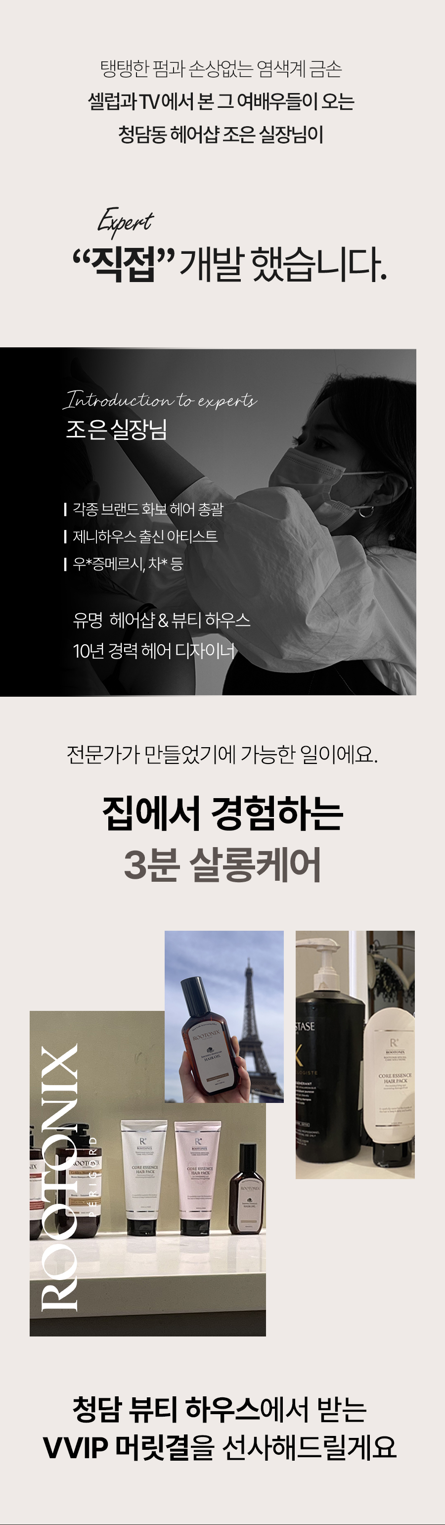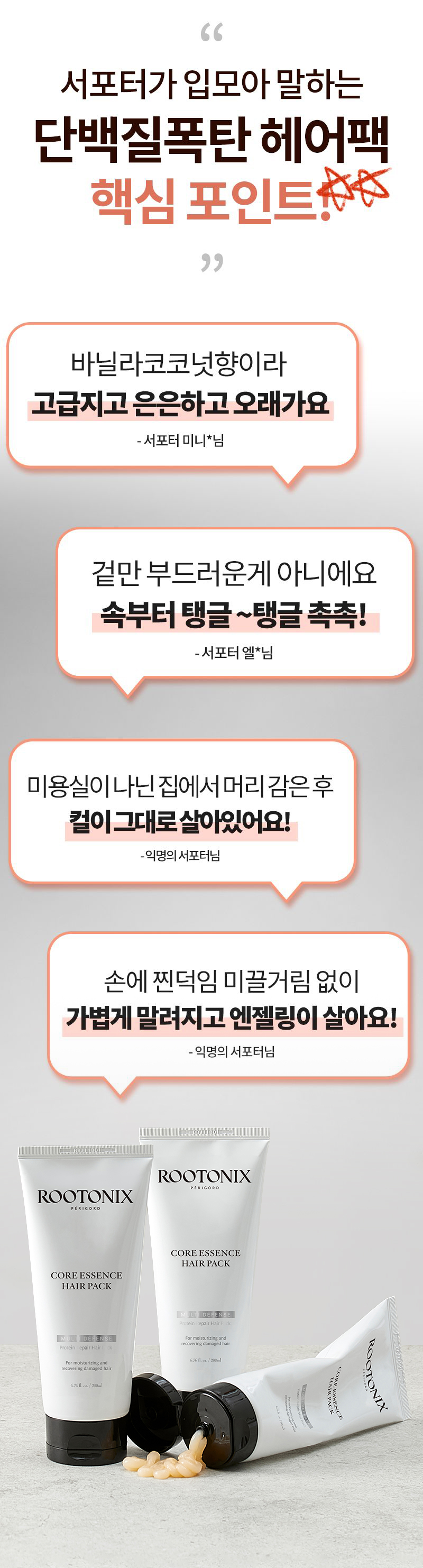 6개월 간 우리 메이커 팀원들과 함께 실제 사용해보며 향부터 제형, 사용감, 자극, 효과에 대한 테스트를 하며 까다롭게 성분과 향을 개선하여 최종으로 만들어진 제품입니다. 게다가 9개월간 실제로 헤어샵에서 전문가들이 사용하며 주신 조언 그리고 이용 고객들의 사용후기를 취합해서 만들었답니다. 극손상모도 단백질로 코어를 만들어 전문 손상모 클리닉이 부럽지 않을 정도로 부드럽게 해줄 수 있는 "단백질 폭탄 코어 에센스 헤어팩" 기대해주세요!