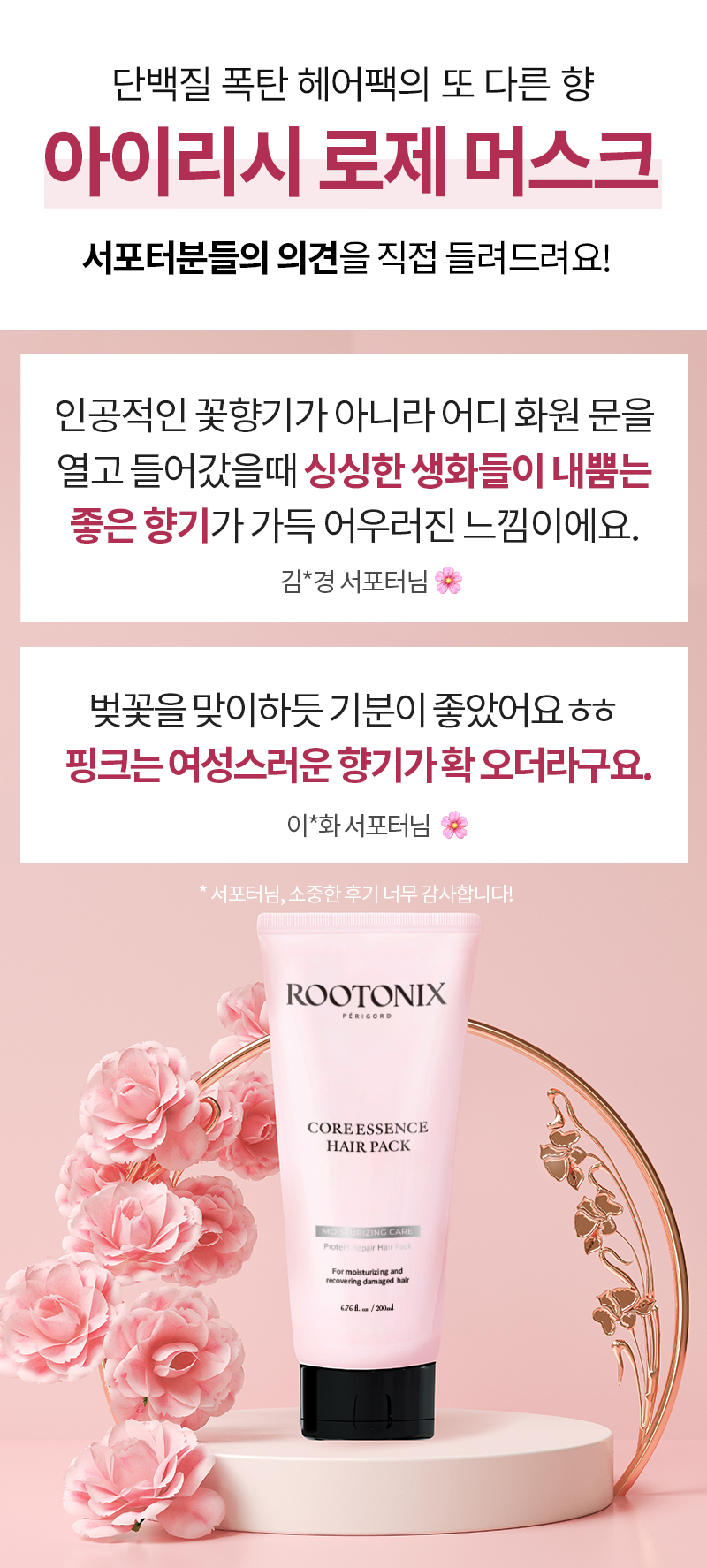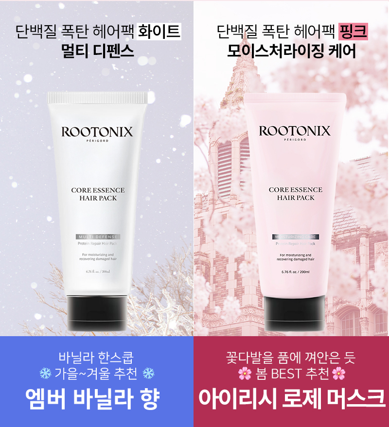 - 헤어팩 핑크 : 더욱 촉촉한 머릿결 관리를 위한 모이스처라이징 케어에 특화되어 있으며 러블리한 플로럴 향입니다.