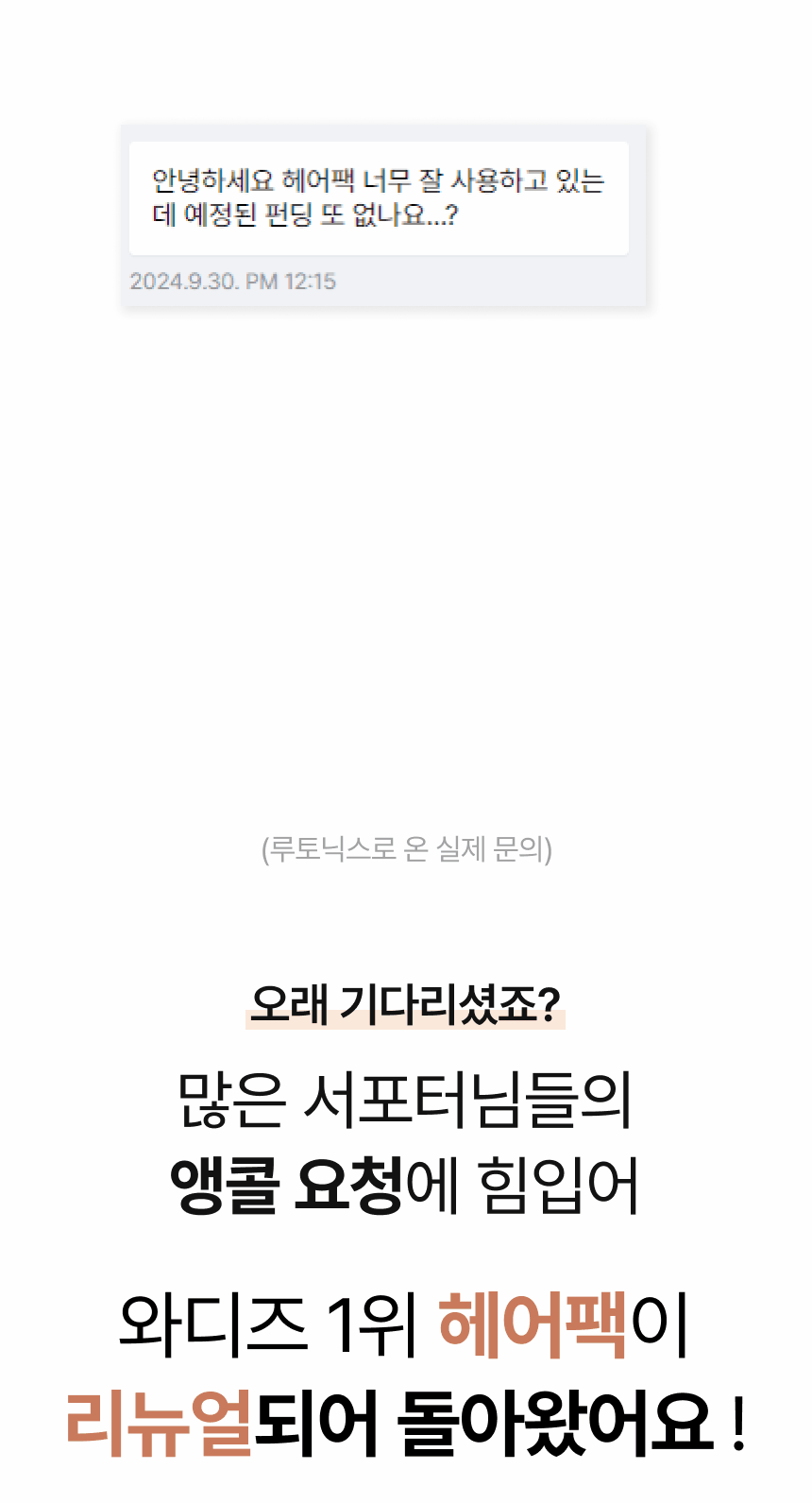 사실 이 리워드는 전문 헤어샵 실장님의 요청으로 개발을 시작했고, 전문가용으로 개발된 헤어팩입니다. 시중의 많은 제품들도 테스트해보면서 느낀점은 '이만한 헤어팩을 찾기 어렵겠다.'입니다. 일반 소비자를 대상으로 시중에 나온 제품 중 전문가용의 퀄리티와 흡사하면서 적절한 가격대의 모발케어 제품을 찾기 어렵더라구요. 그래서 저희를 응원해주시는 서포터님들의 효과적인 모발과 두피관리 위해 저분자 단백질 추출 기술로 "단백질 폭탄 케어 에센스 헤어팩"을 와디즈에서 선보이기로 결정했습니다! 헤어실장님도 원래 소속인 헤어샵에서 독점으로 판매하고 사용하고자 하였으나, 루토닉스팀의 제안에 흔쾌히 OK 해주셔서 너무 감사드립니다!!