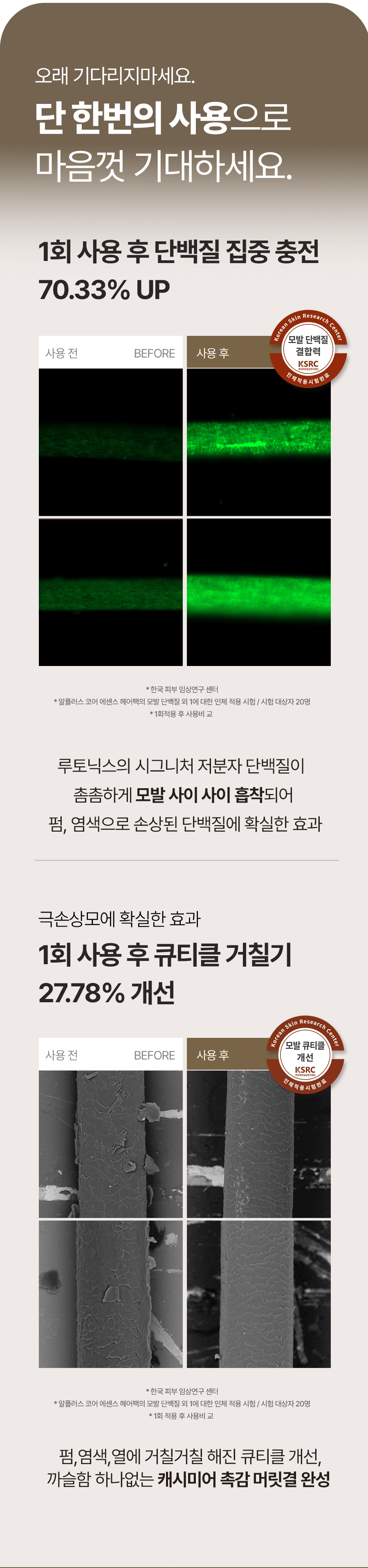 탄력 있는 탱탱한 머릿결, 단백질로 튼튼한 코어가 생긴 모발로만 연출할 수 있어요!
